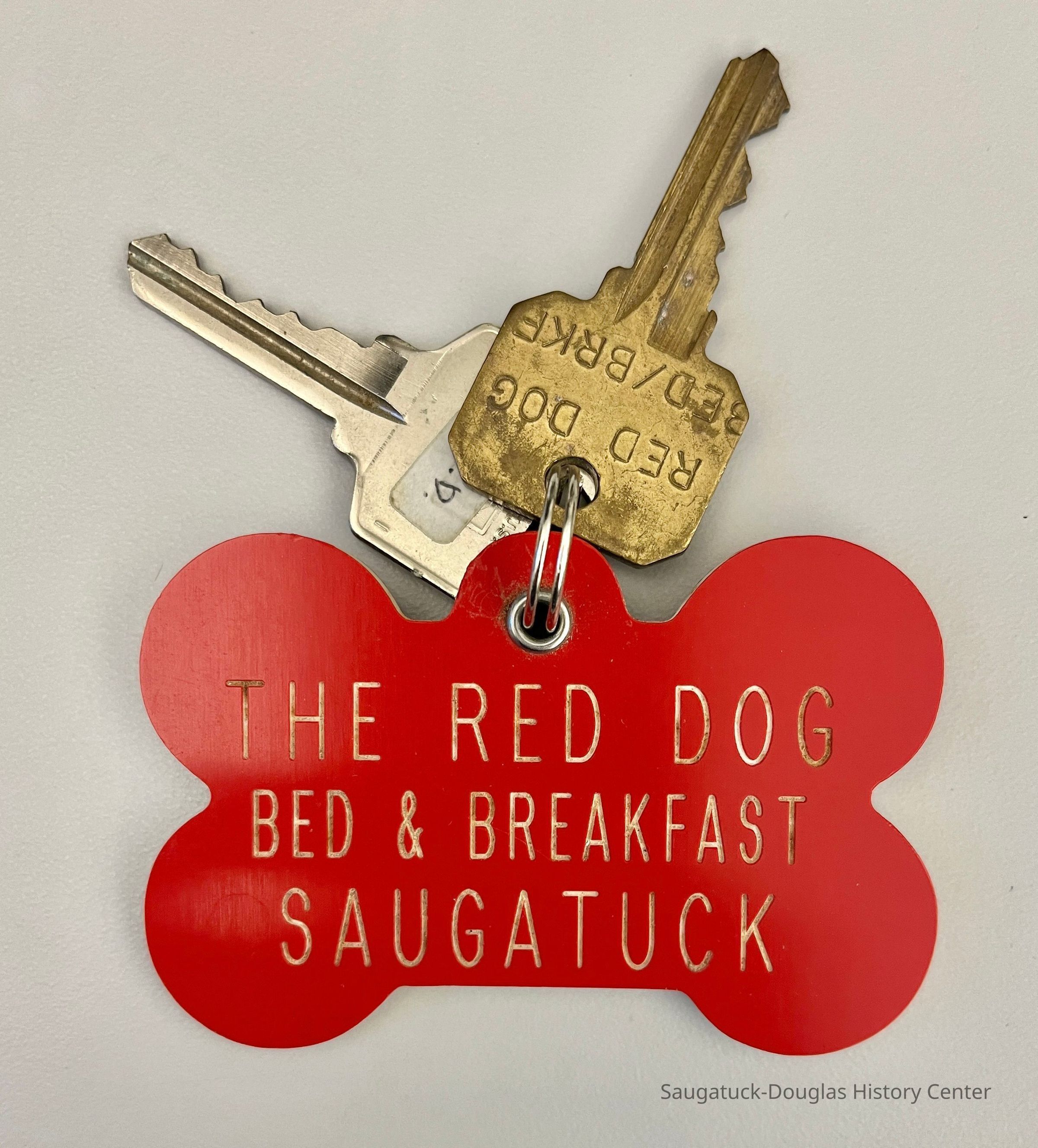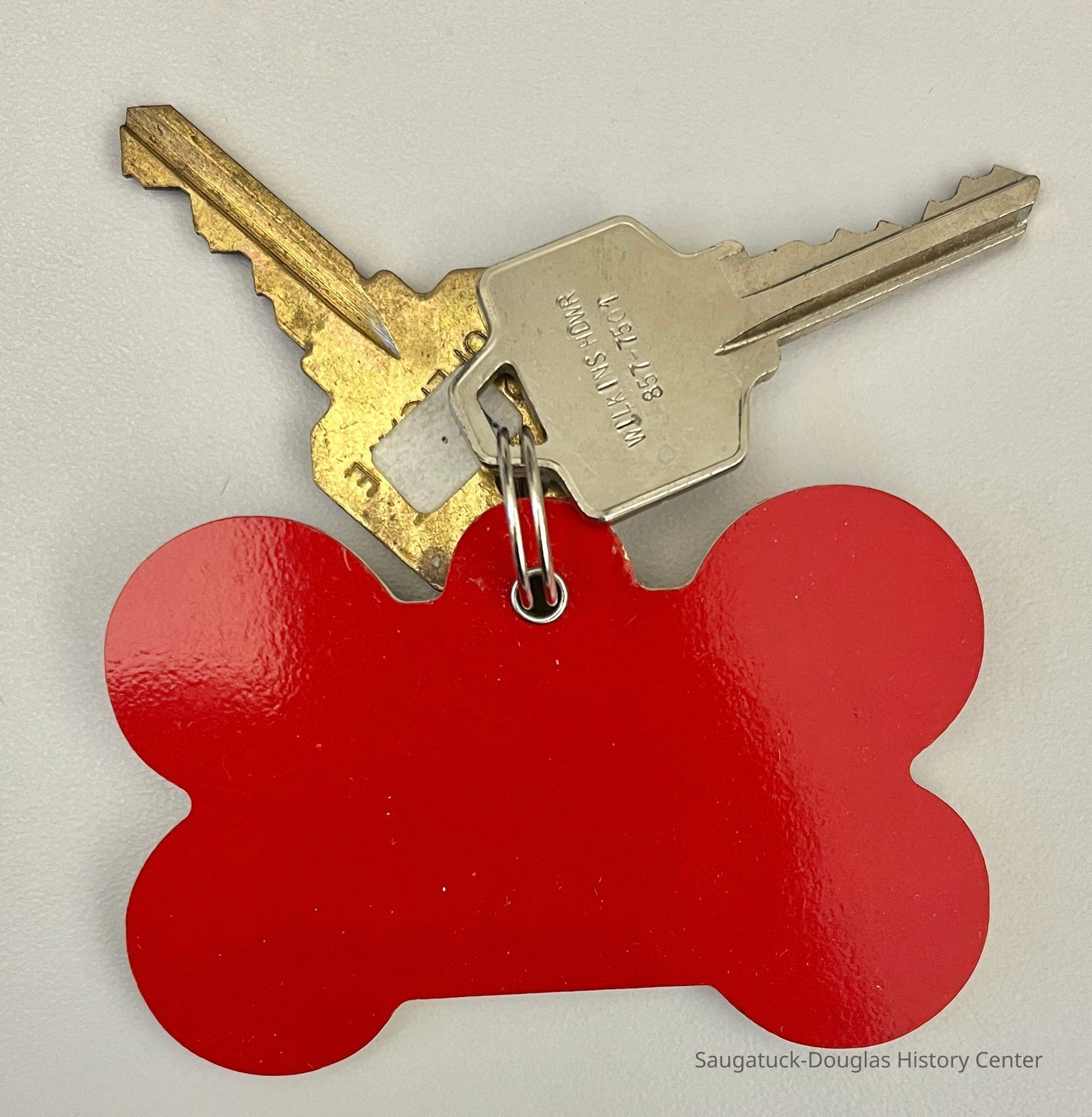 Red, bone-shaped fob with two room keys from the Red Dog B&B.