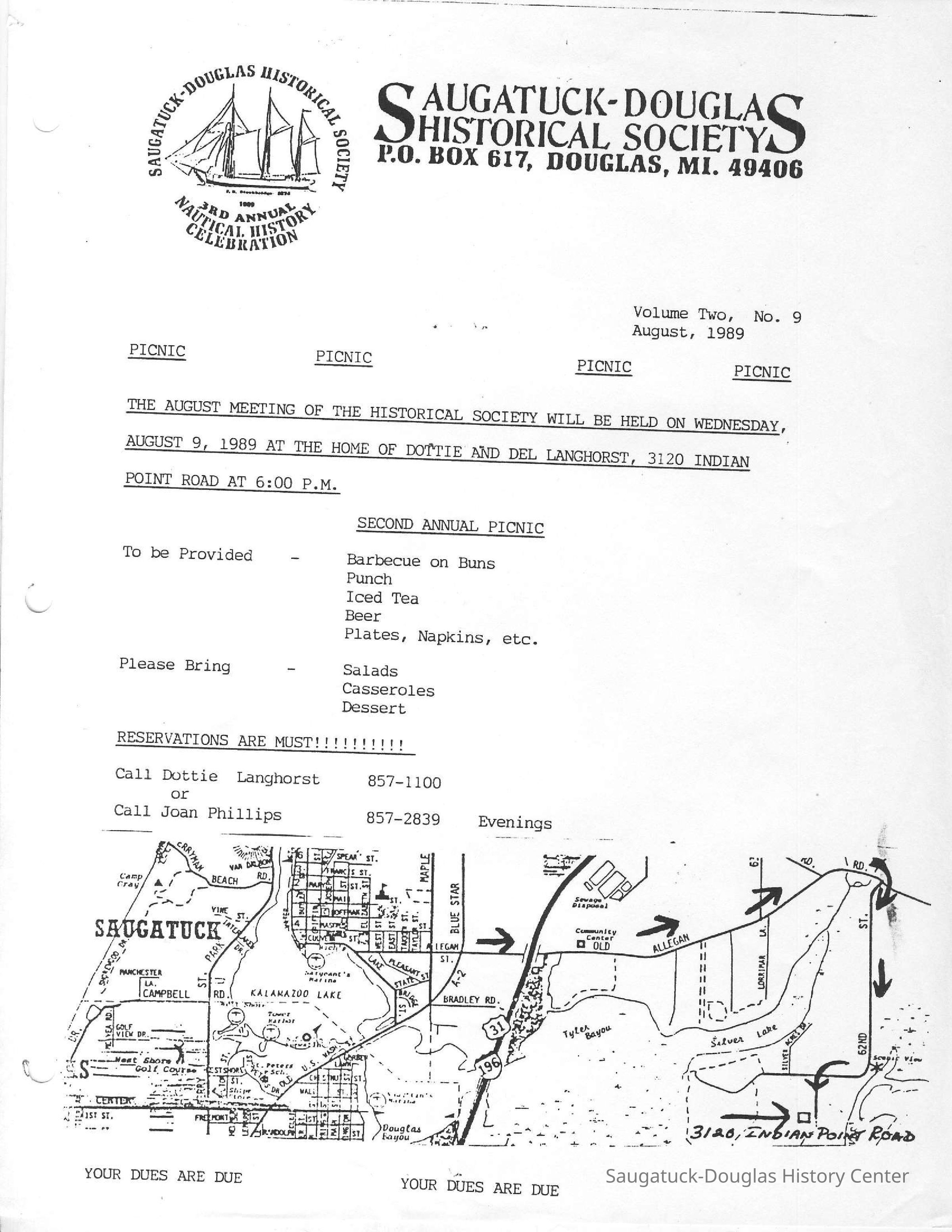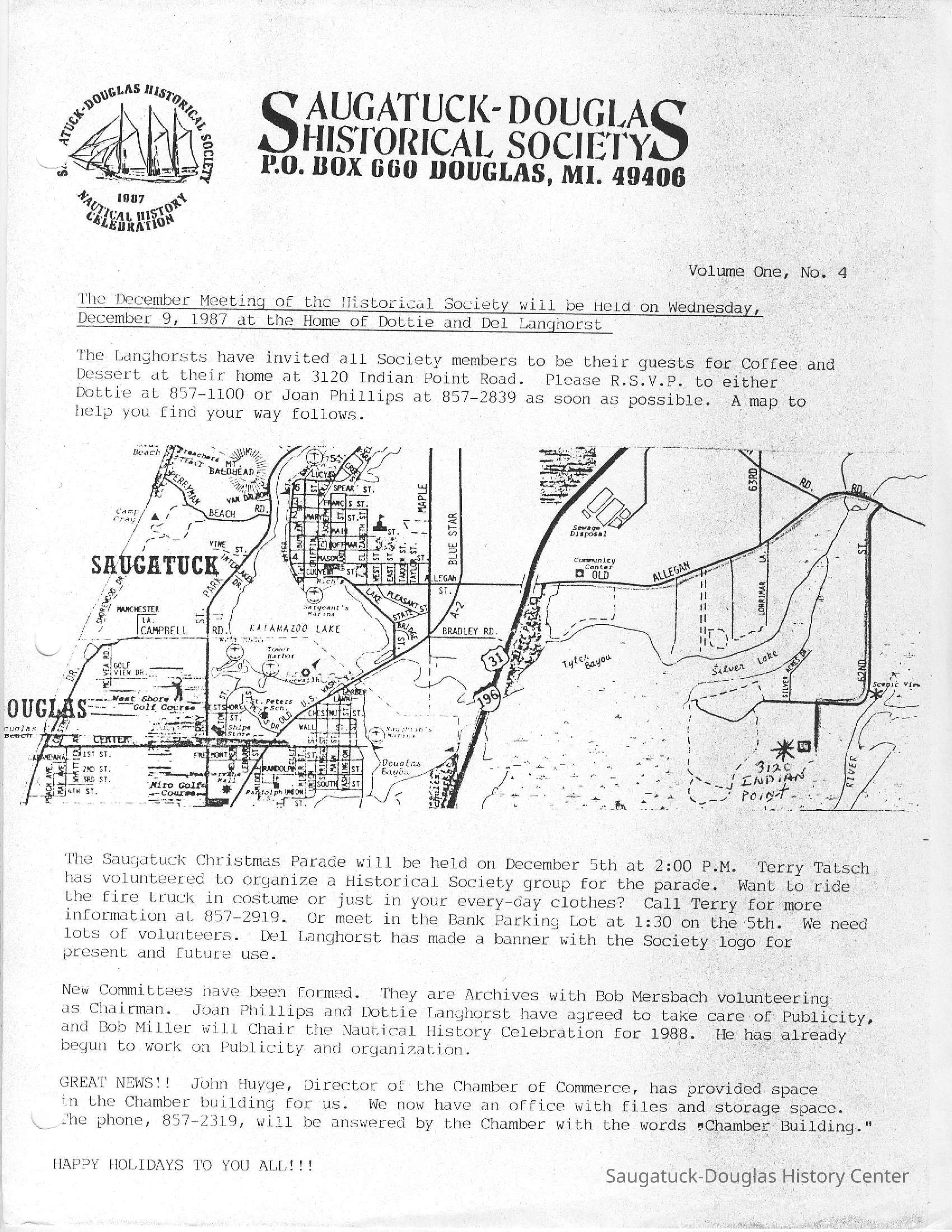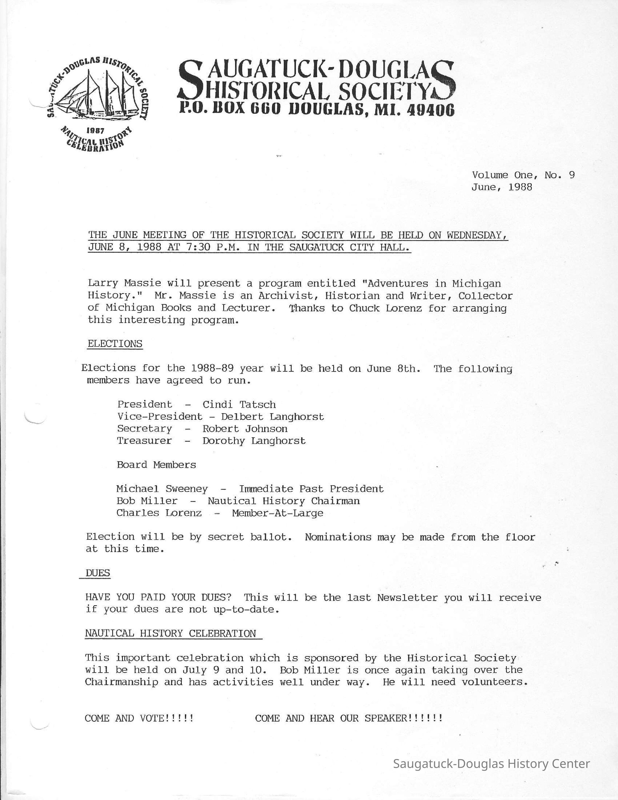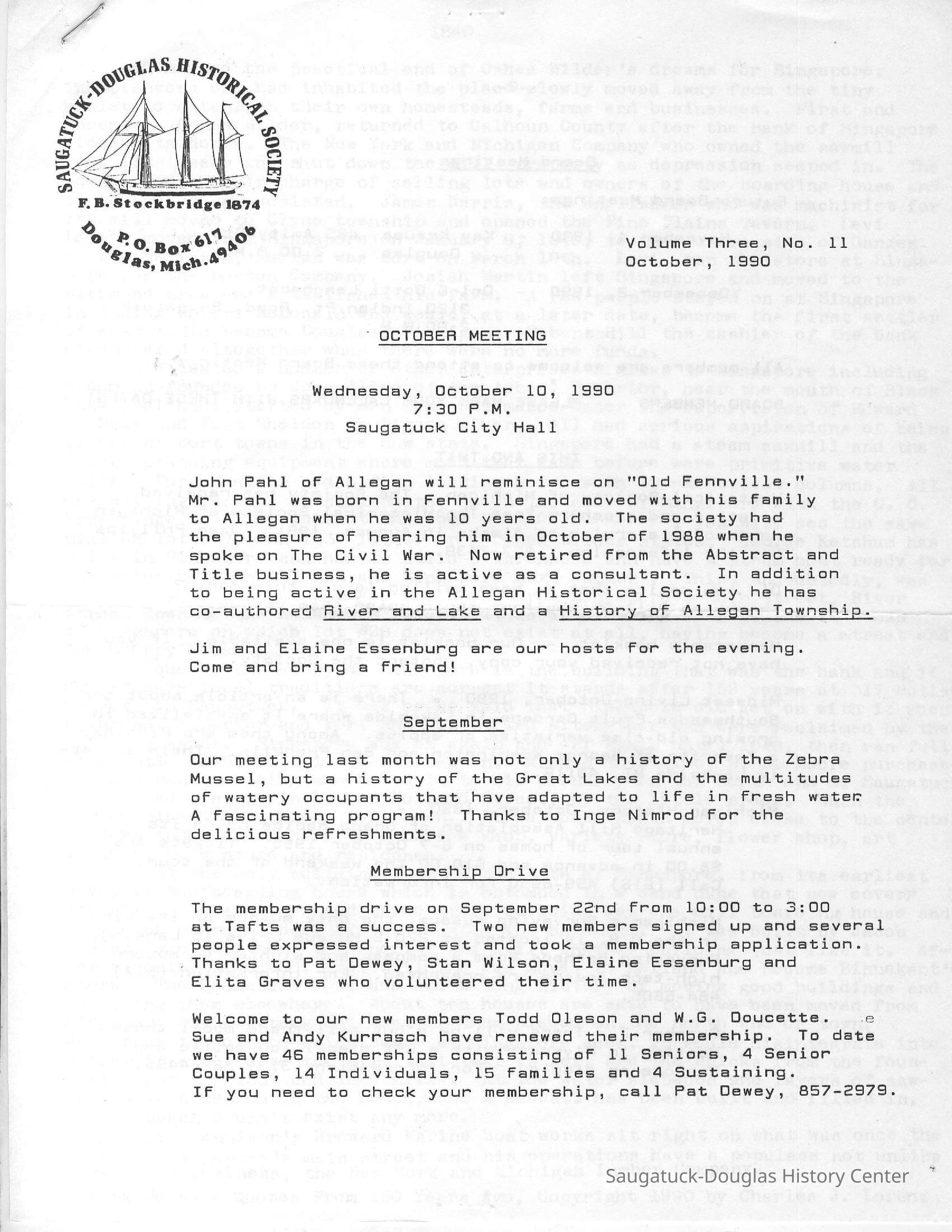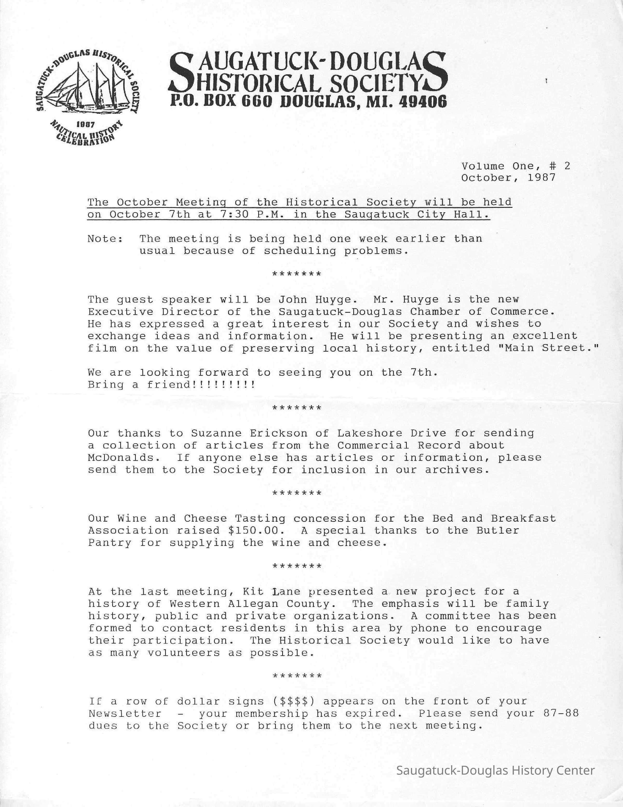 Insights into issues of interest to the new society including the proposal to build a McDonalds restaurant downtown and renovate the Saugatuck Village hall building, socializing, building membership and board business. Dec. 1989 and Sept. 1991 newsletters included financial accounting. In April 1990, changes to bylaws were proposed.