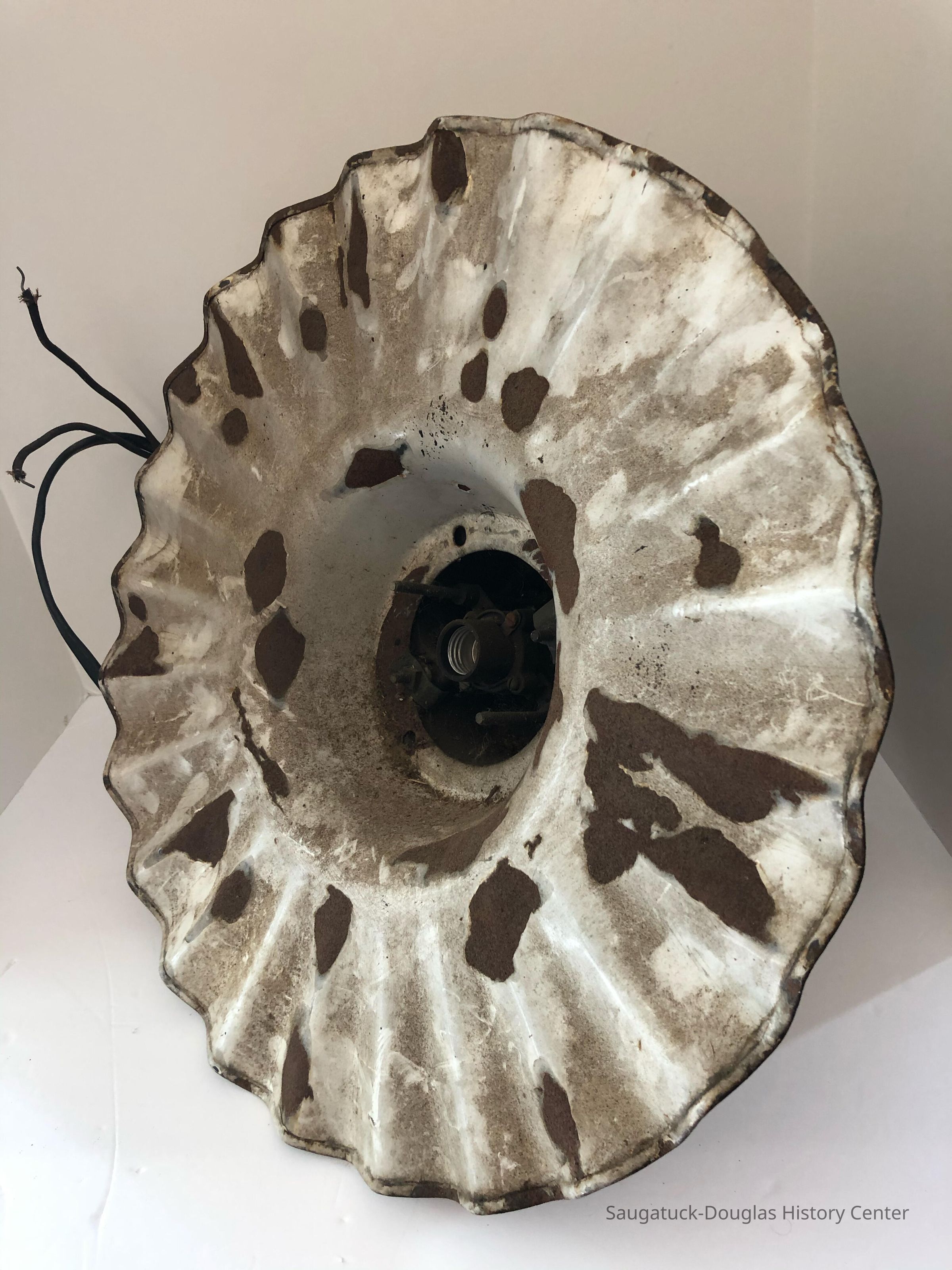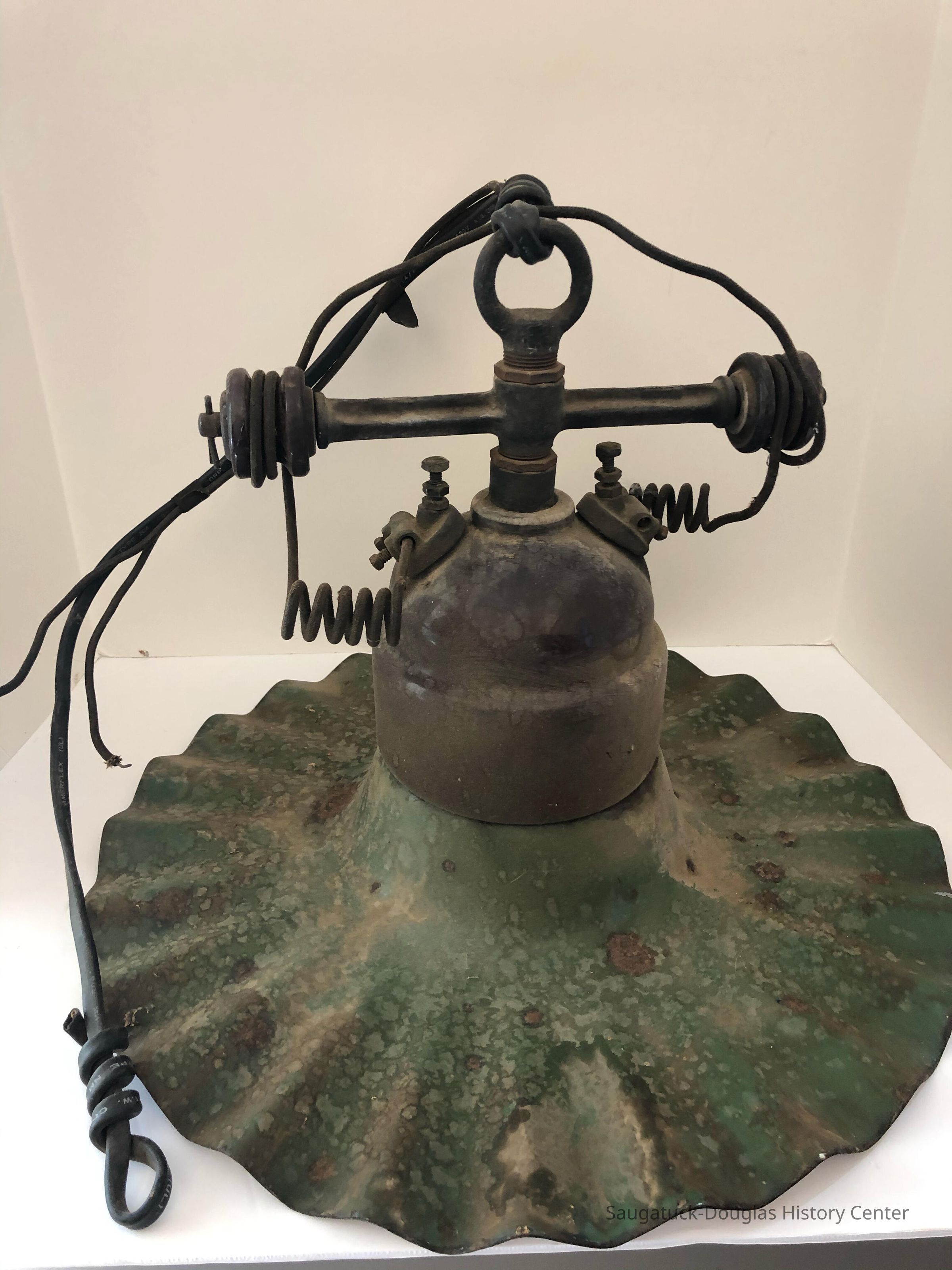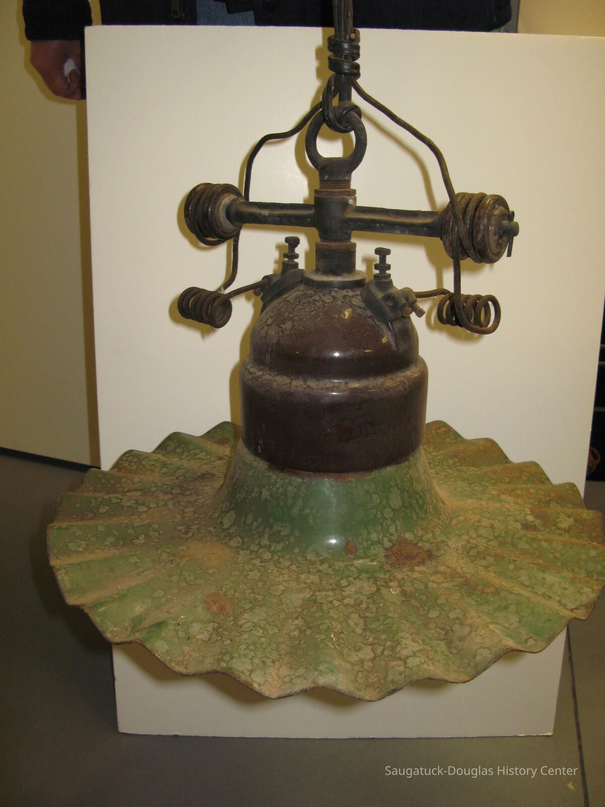 From May 2016 SDHC newsletter: We know that electricity first came to Saugatuck in 1902 when the electric interurban line was completed to Holland. In 1912, the Lake Shore Electric Company was founded in Saugatuck to generate electrical power. This resulted in the expansion of the original brick "Pump House" building when electric generators were added (today home to the Saugatuck-Douglas History Museum!). Along with the new generators and expanded facility came the addition of 70 street lights in Saugatuck and 40 in Douglas. Research indicates the new electric lights were turned on on July 17, 1912. It is likely that this one pictured in the postcard view is one of those original lamps. Some were hung from span wires centered over major intersections. Others were pole-mounted to illuminate both street and sidewalk. Recently donated to the Society's collection is an example of one of these original style Saugatuck street lights. The artifact includes wiring insulators and the socket mechanism along with the decorative fluted reflector plate. The wiring which remains would never pass inspection, but what do you know? A modern socket was at some point installed and a 100-watt bulb fits quite well. ... Thanks to Bob Lord for donating this vintage lamp fixture!