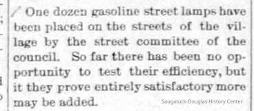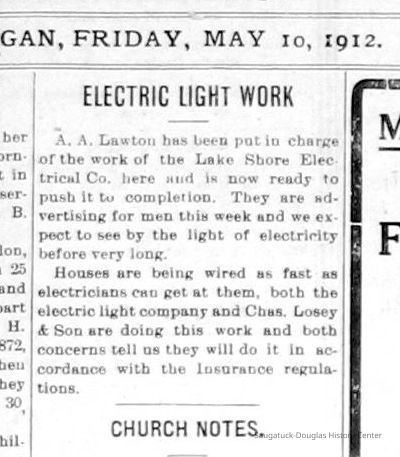 "The opening of the Lake Shore Electric Company at its showrooms on Hoffman Street in Saugatuck was a decided success and large numbers gathered to see the beautiful display that consisted of all kinds of light fixtures, electric fans, flat irons, toasters and vacuum cleaners that were thoroughly demonstrated." -- Holland City News/The Holland Sentinel, Thursday, July 25, 1912.
