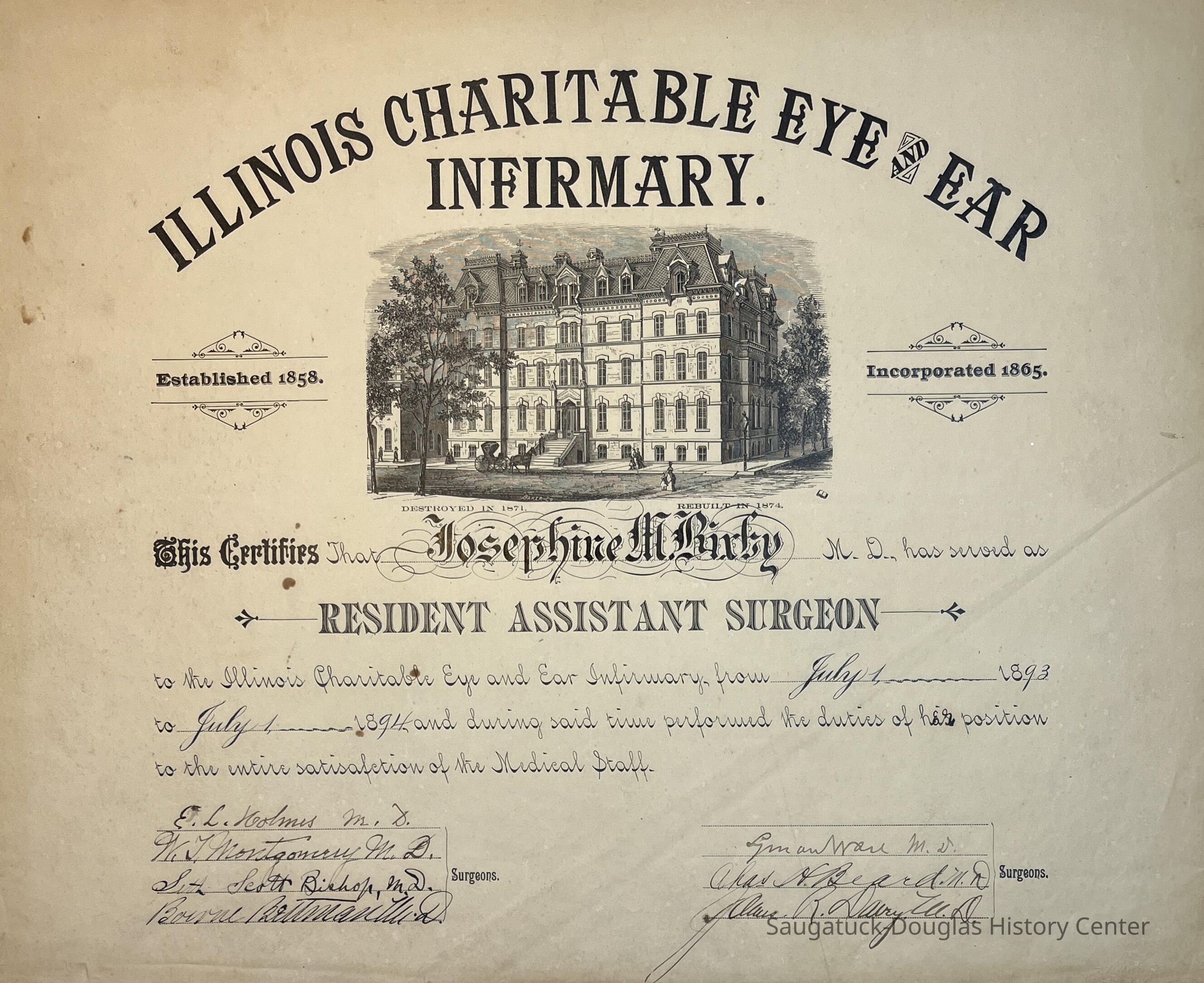 Resident Assistant Surgeon, Illinois Charitable Eye and Ear Infirmary, to Josephine M. Bixby, July 1, 1893