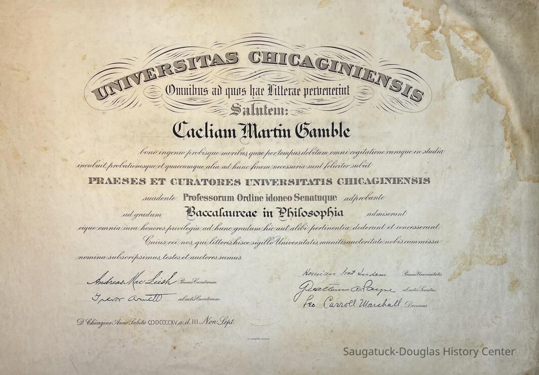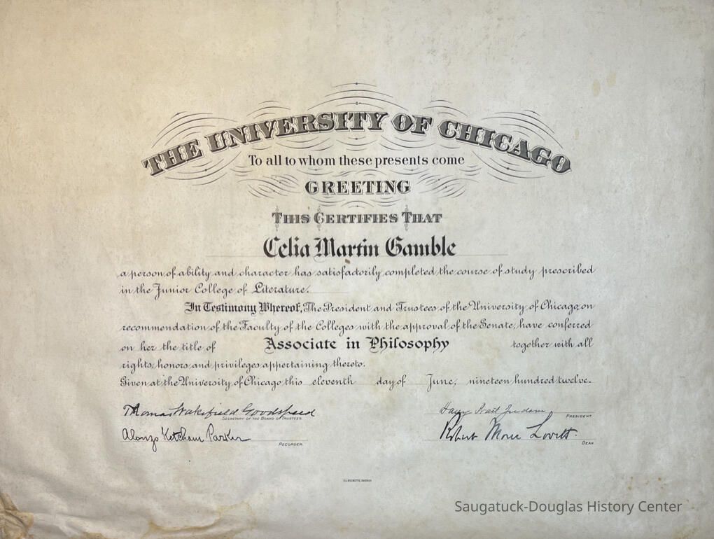 Baccalaureate (Bachelor's degree) in Philosophy, University of Chicago, to Celia Martin Gamble, undated.