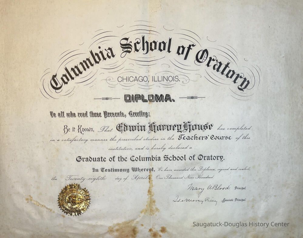 Graduate of the Columbia School of Oratory Teachers Course, to Edwin Harvey House, April 28, 1900.