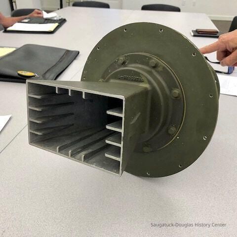 Text by Chuck Gustafson: The feed horn was mounted on the ‘nose’ of the antenna framework a little forward of where the foot of the ladder propped on the reflector presently is. The end that is up in the image faced back toward the antenna’s reflector. The other end was connected to the rectangular waveguide that traveled through a rotating joint on the antenna pedestal, then down the center of the tower and back to the transmitter and receiver in the equipment and generator building. Pulses of microwave energy from the transmitter would travel through the waveguide and exit from the end of the feed horn, spreading to the width and height of the reflector which would reflect them out away from the antenna in a beam with a carefully designed pattern spreading 1.4° wide and 30° tall with the bottom edge of the fanning beam elevated 0.5° above the lake. Any pulse encountering an aircraft would ‘echo’ back to be collected by the reflector which would concentrate and reflect the echo to the feed horn from which it would travel back down the waveguide to the receiver.