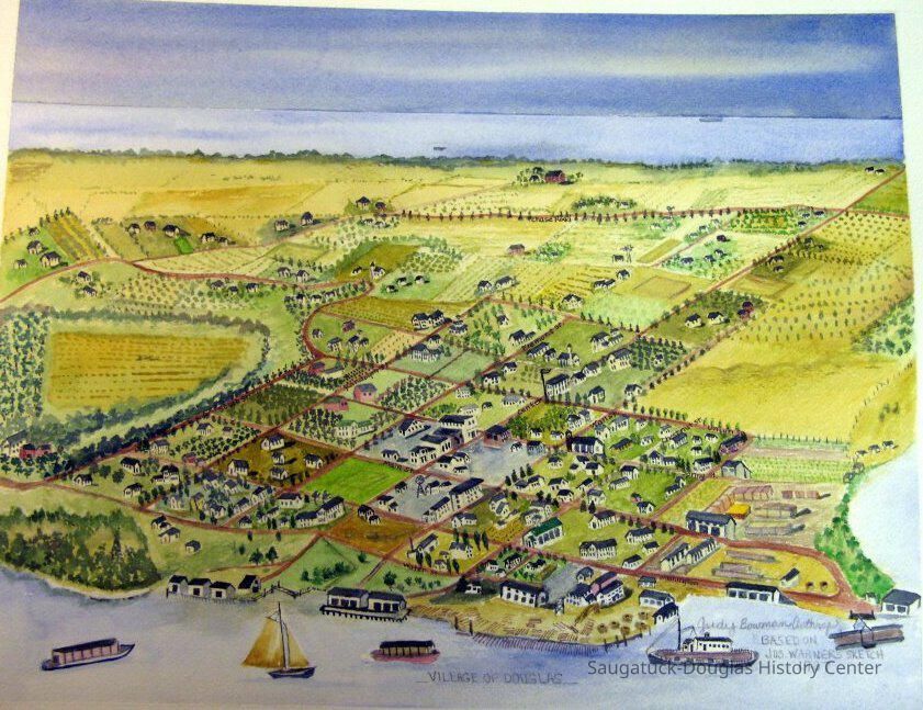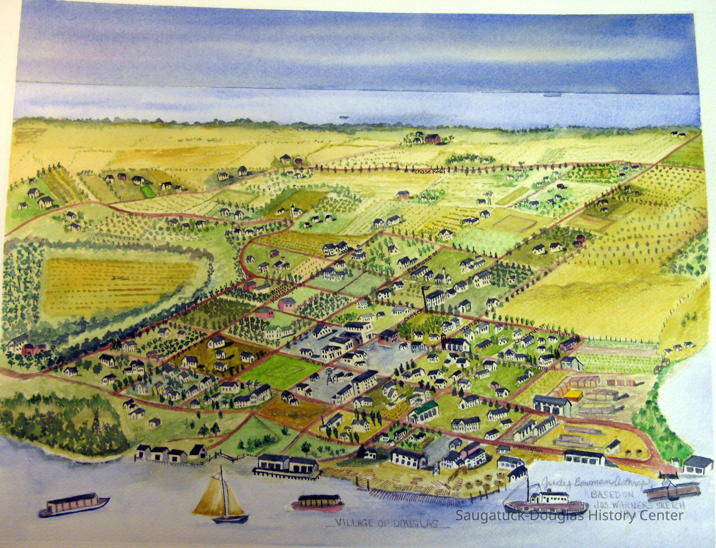 14"x11" watercolor painting of a bird's eye view of the village of Douglas copied from a sketch drawn by Jos Warners 1907