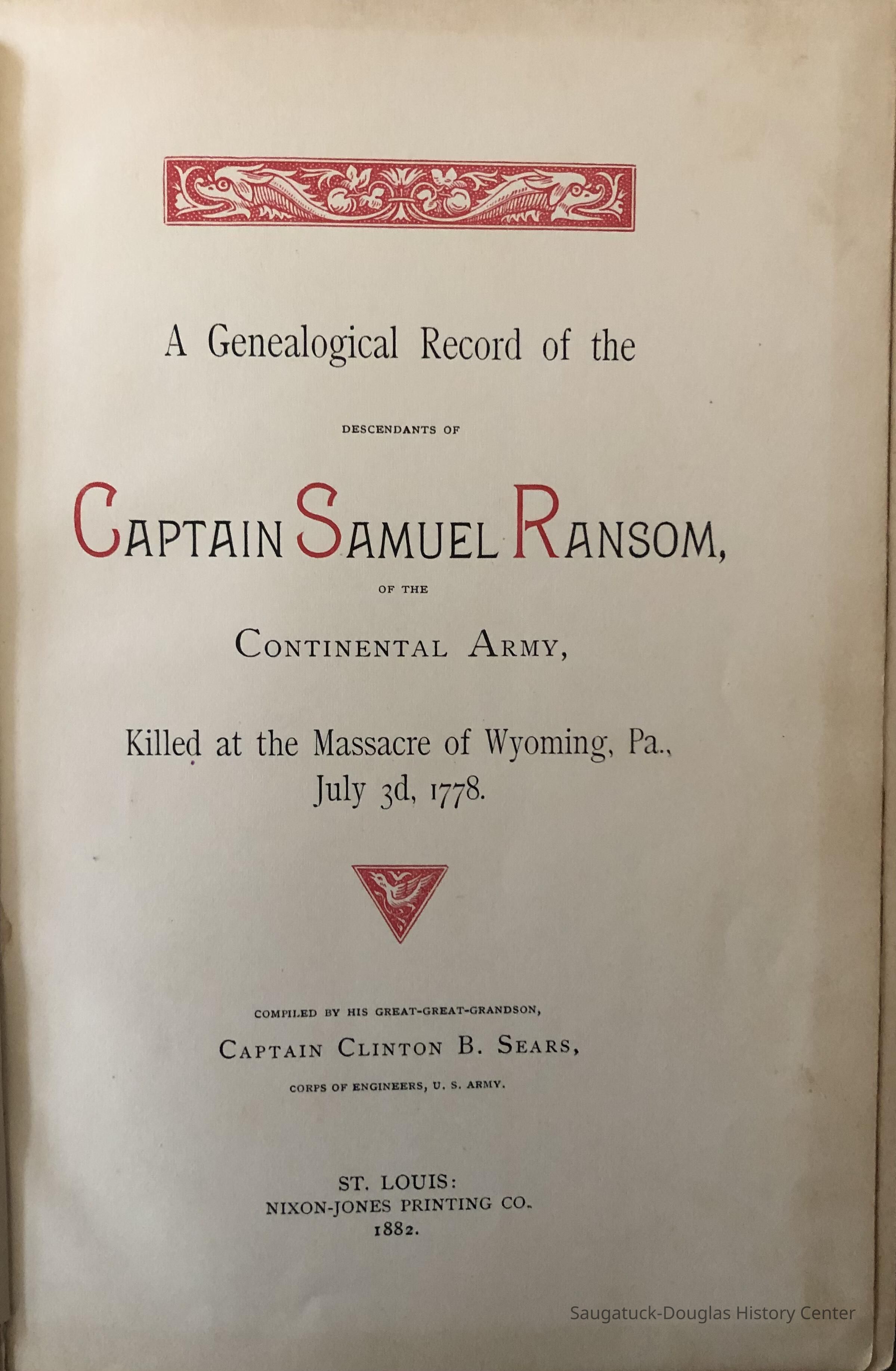 Genealogical record of the Descendants of Captain Samuel Ransom, of the Continental Army. Captain Ransom was killed at the Massacre of Wyoming, Pa., July 3rd, 1778. This record was compiled by Captain Ransom's Great Great Grandson Captain Clinton B. Sears of the Corps of Engineers, U. S. Army.