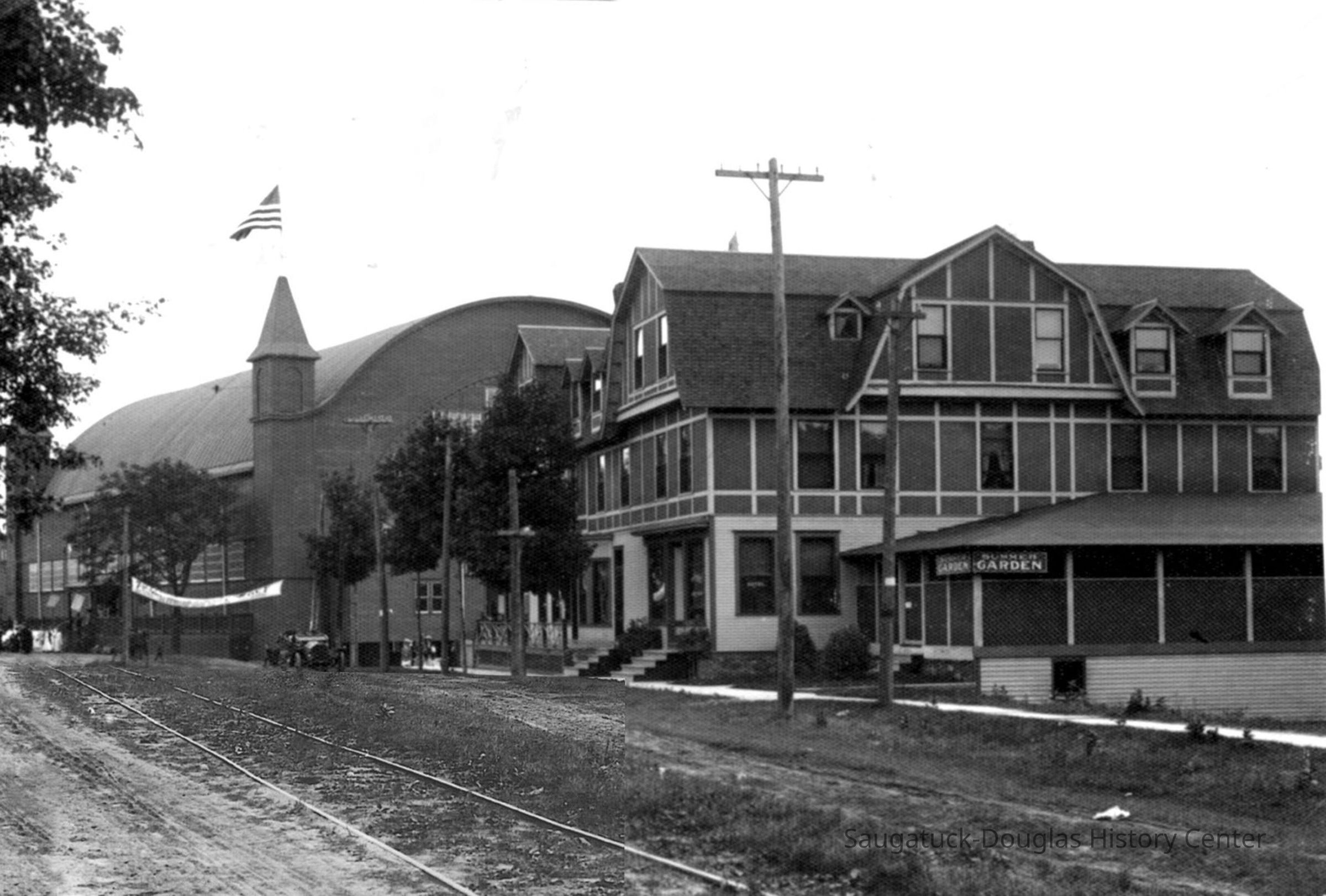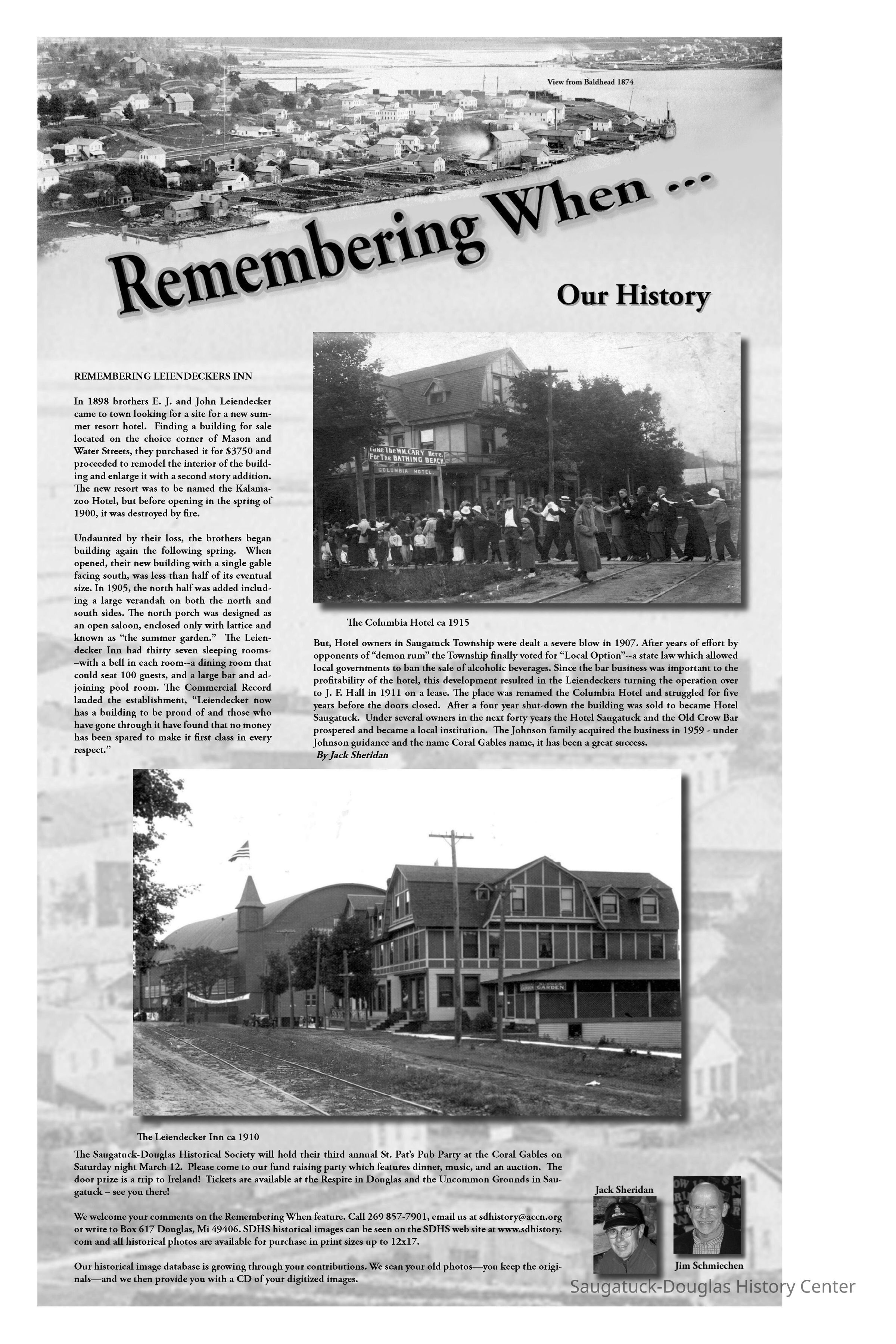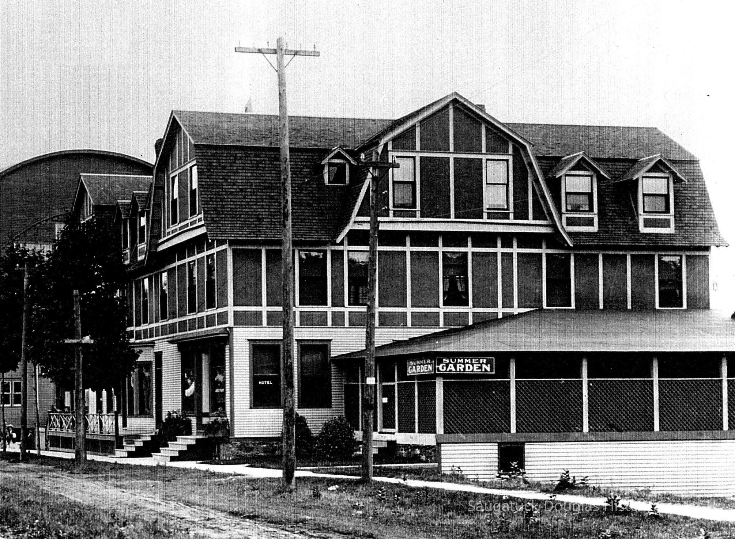 REMEMBERING LEIENDECKERS INN In 1898 brothers E. J. and John Leiendecker came to town looking for a site for a new summer resort hotel. Finding a building for sale located on the choice corner of Mason and Water Streets, they purchased it for $3750 and proceeded to remodel the interior of the building and enlarge it with a second story addition. The new resort was to be named the Kalamazoo Hotel, but before opening in the spring of 1900, it was destroyed by fire. Undaunted by their loss, the brothers began building again the following spring. When opened, this building with a single gable facing south, was less than half of its eventual size. In 1905, the north half was added including a large verandah on both the north and south sides. The north porch was designed as an open saloon, enclosed only with lattice and known as "the summer garden." The Leiendecker Inn had thirty seven sleeping rooms-–with a bell in each room--a dining room that could seat 100 guests, and a large bar and adjoining pool room. The Commercial Record lauded the establishment, "Leiendecker now has a building to be proud of and those who have gone through it have found that no money has been spared to make it first class in every respect." But, Hotel owners in Saugatuck Township were dealt a severe blow in 1907. After years of effort by opponents of “demon rum” the Township finally voted for "Local Option"--a state law which allowed local governments to ban the sale of alcoholic beverages. Since the bar business was important to the profitability of the hotel, this development resulted in the Leiendeckers turning the operation over to J. F. Hall in 1911 on a lease. The place was renamed the Columbia Hotel and struggled for five years before the doors closed. After a four year shut-down the building was sold to became Hotel Saugatuck. Under several owners in the next forty years the Hotel Saugatuck and the Old Crow Bar prospered and became a local institution. The Johnson family acquired the business in 1959 and under the Coral Gables name has kept it going strong ever since. By Jack Sheridan