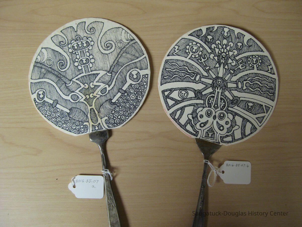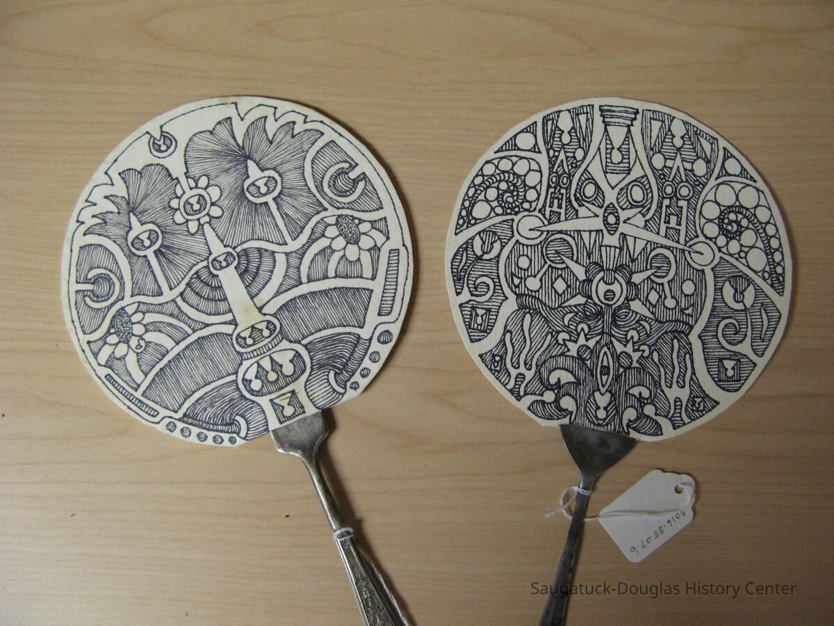 Two round 6" diameter fans made with metal forks for handles the fans are made of heavy paper with pen and ink designs drawn on them. Each side is different.