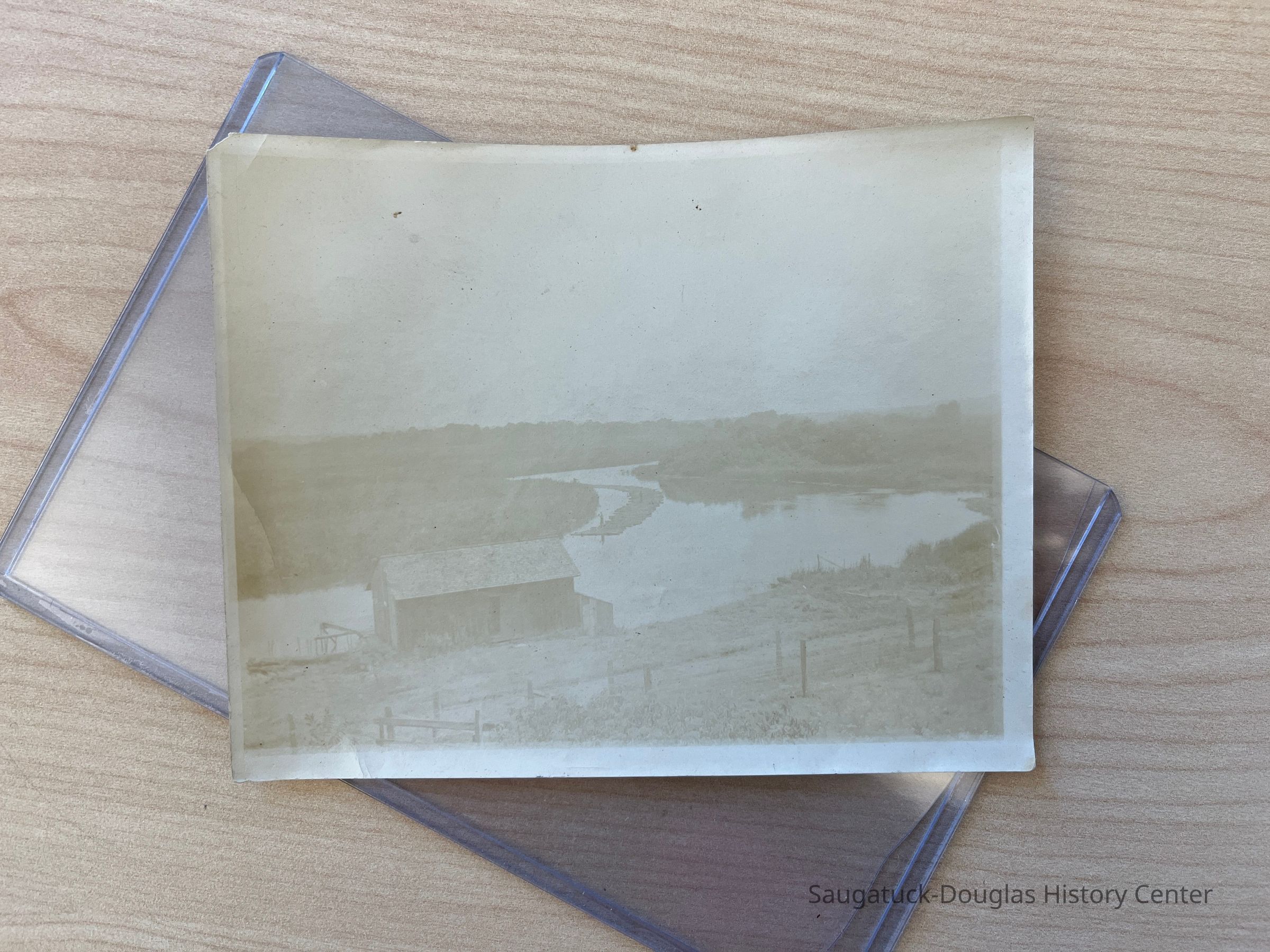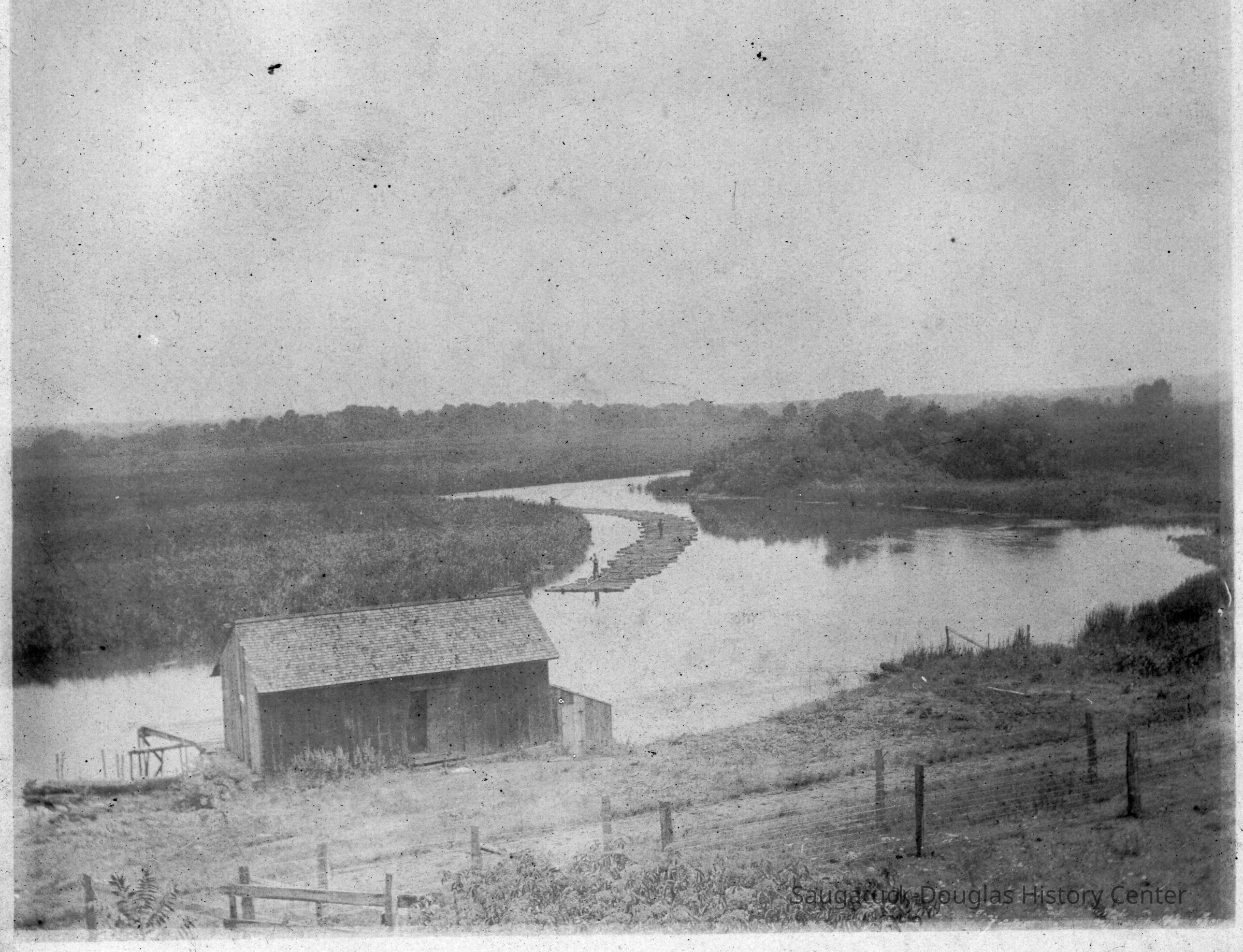 The photo depicts a small building by a road and line of wire fencing. The road side of the building has a door, no windows, a shed roofed extension and a dock on its river side. In the distance two men can be seen on a raft of logs moving down the Kalamazoo River.
