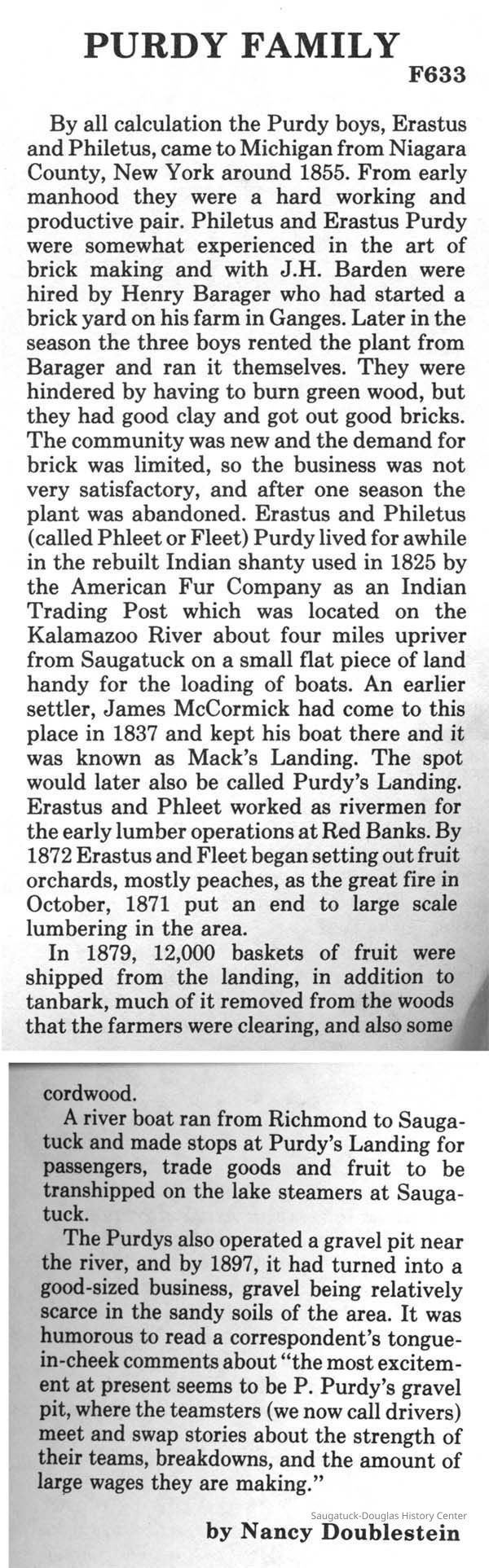 Purdy, Philetus "Fleet" 1835-1922Gravel Pit/Indian Cut/Purdy's Landing/Mack's Landing