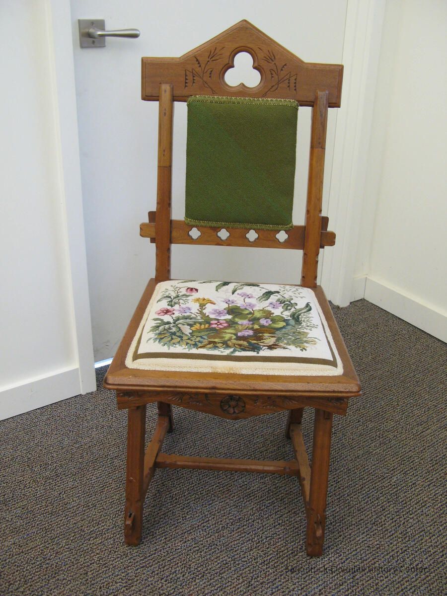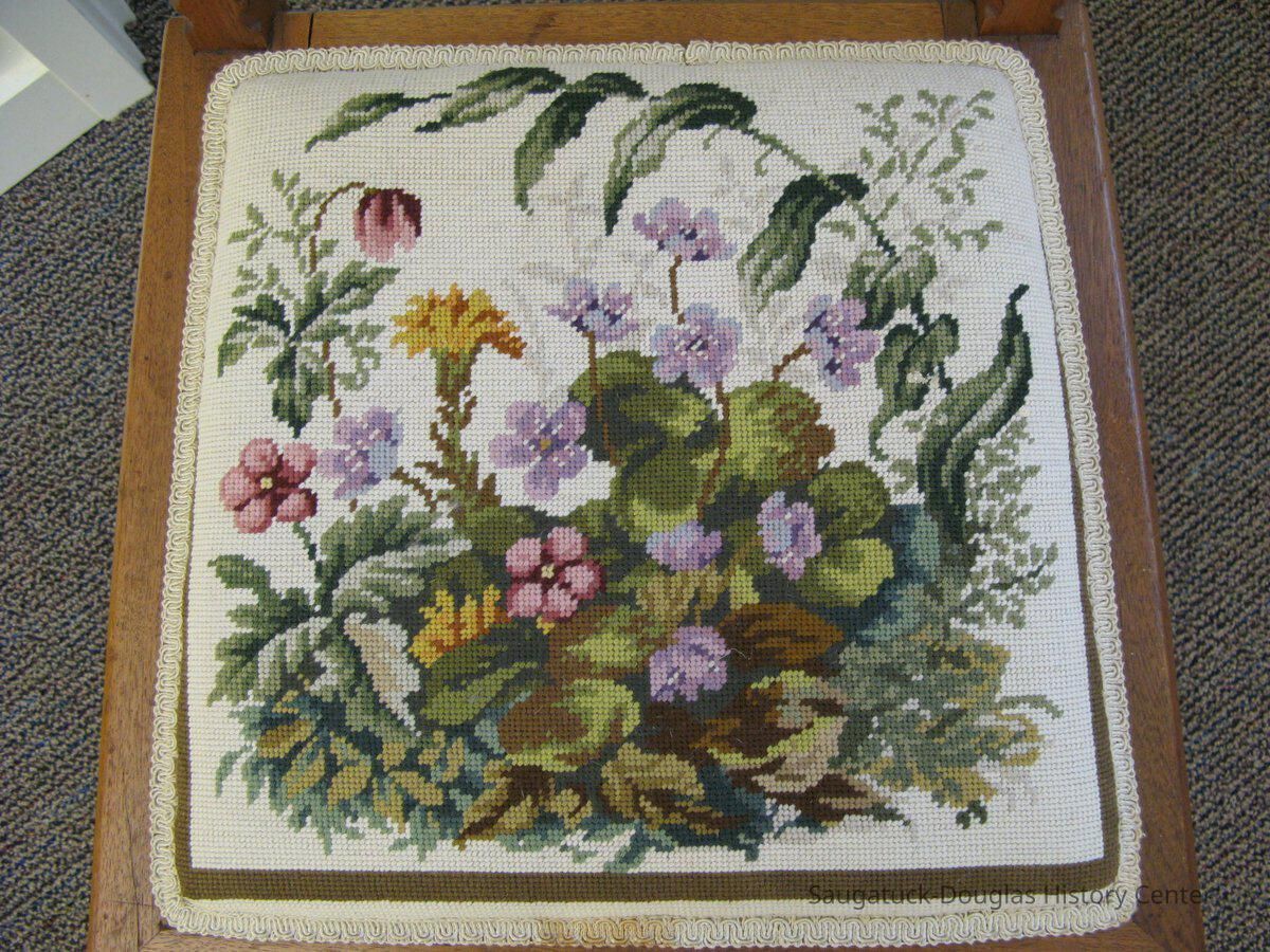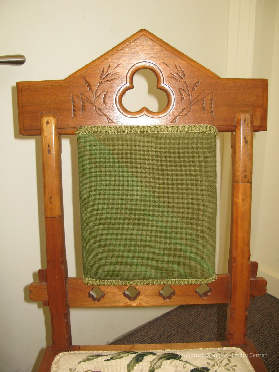 Furst Chair c. 1880s | carved wood and needlepoint Notes: This Victorian church chair was used at the Dutch Reformed Church at 995 Holland Street in Saugatuck, Michigan. The Needlepoint and seat backing was new in 1980. W.O. Furst passed the chair to his son, Harold D. Furst, who in turn passed the item to his daughter, Carolyn Sue. The chair is decorated with a carved circular trilogy and wheat chaffs on the upper back. Collection: Saugatuck Douglas History Center Gift of: James M. Clark and Carolyn Furst Clark Accession: 2017.25.01