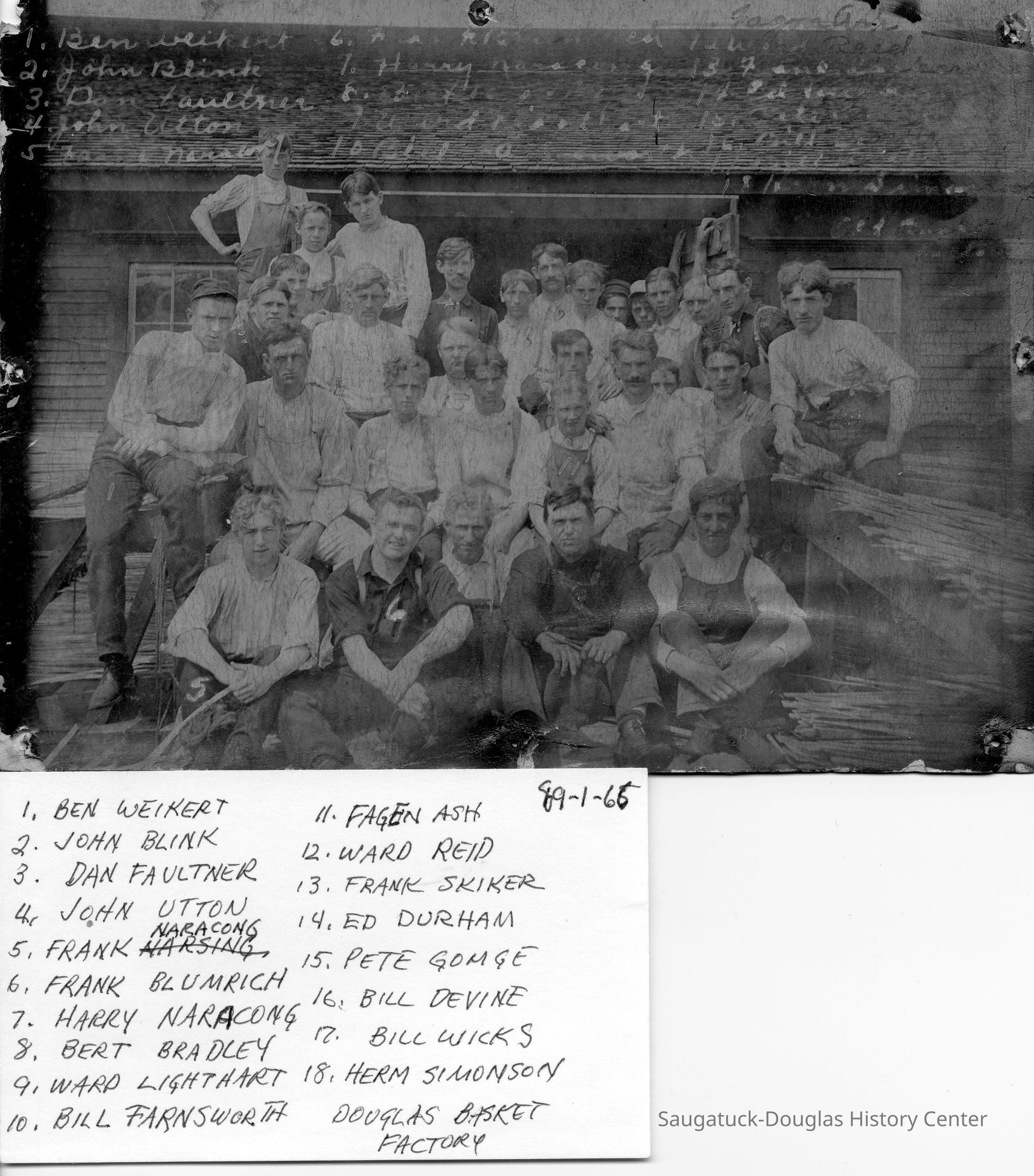 Basket Factories in Douglas circa 1851-1927Wiegert, Benjamin "Ben" William 1877-1946Simonson, Herman C. 1878-1951Devine, William J. 1874-1955Blink, JohnFaultner, DanUtton, John 1869-1946Blumrich, Frank A. 1880-1936Bradley, Charles Bert 1873-1929Lighthart, Ward Clayton 1886-1958Ash, Alva Edward "Fagen" 1885-1956Reid, Ward 1879-1933Durham, EdWicks, William Fernando "Bill" 1885-1960