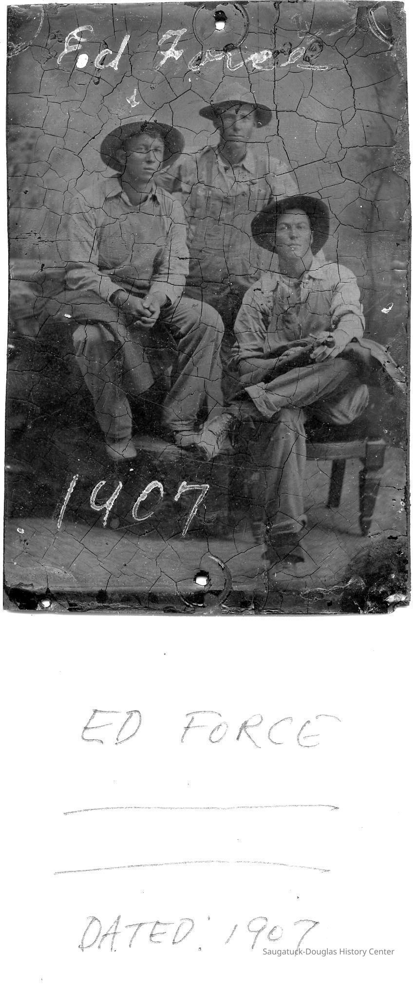 Tin-type photo of three men in overalls, dated 1907. An arrow indicates that one of the men is Ed Force, who operated the Snug Harbor service station and served as village president and board member.