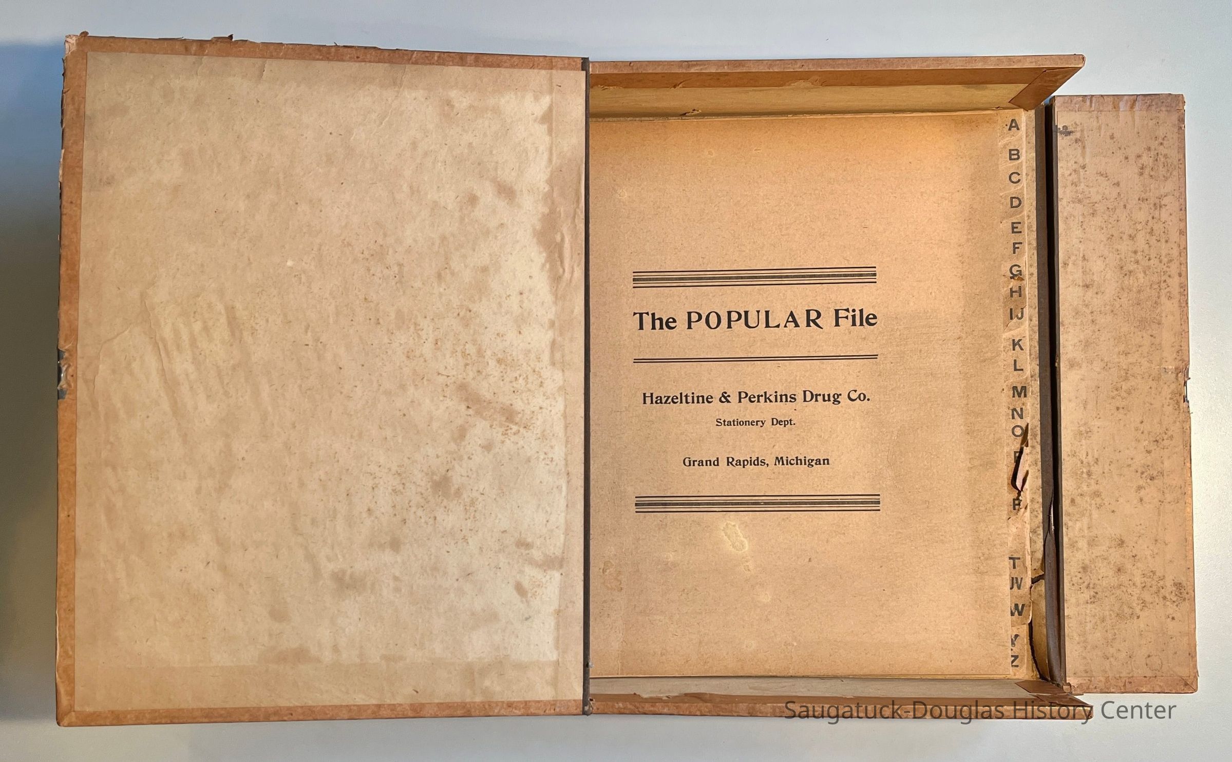 "The Popular File" letters box by the Hazeltine & Perkins Drug Co., Stationary Department of Grand Rapids, Michigan.