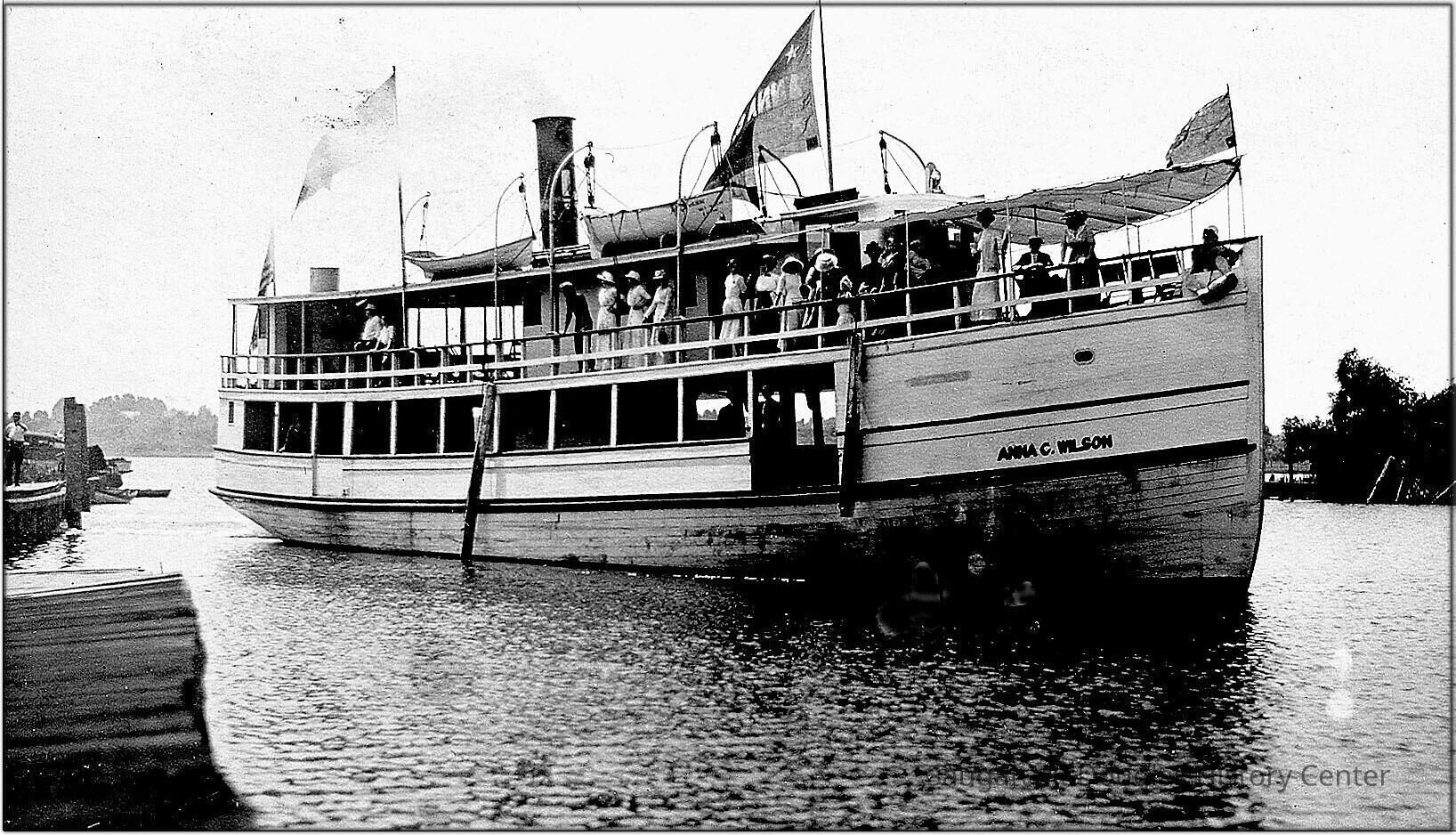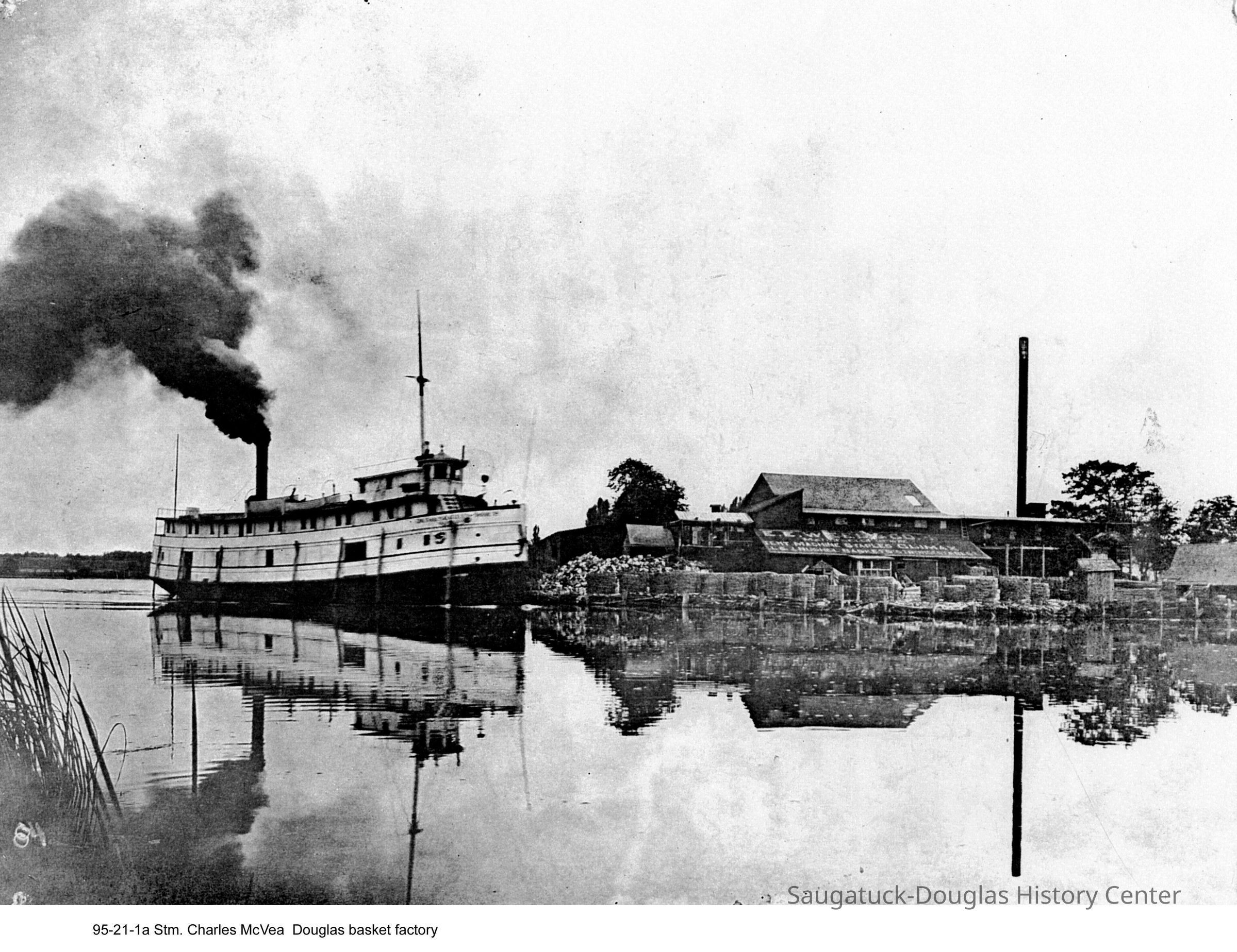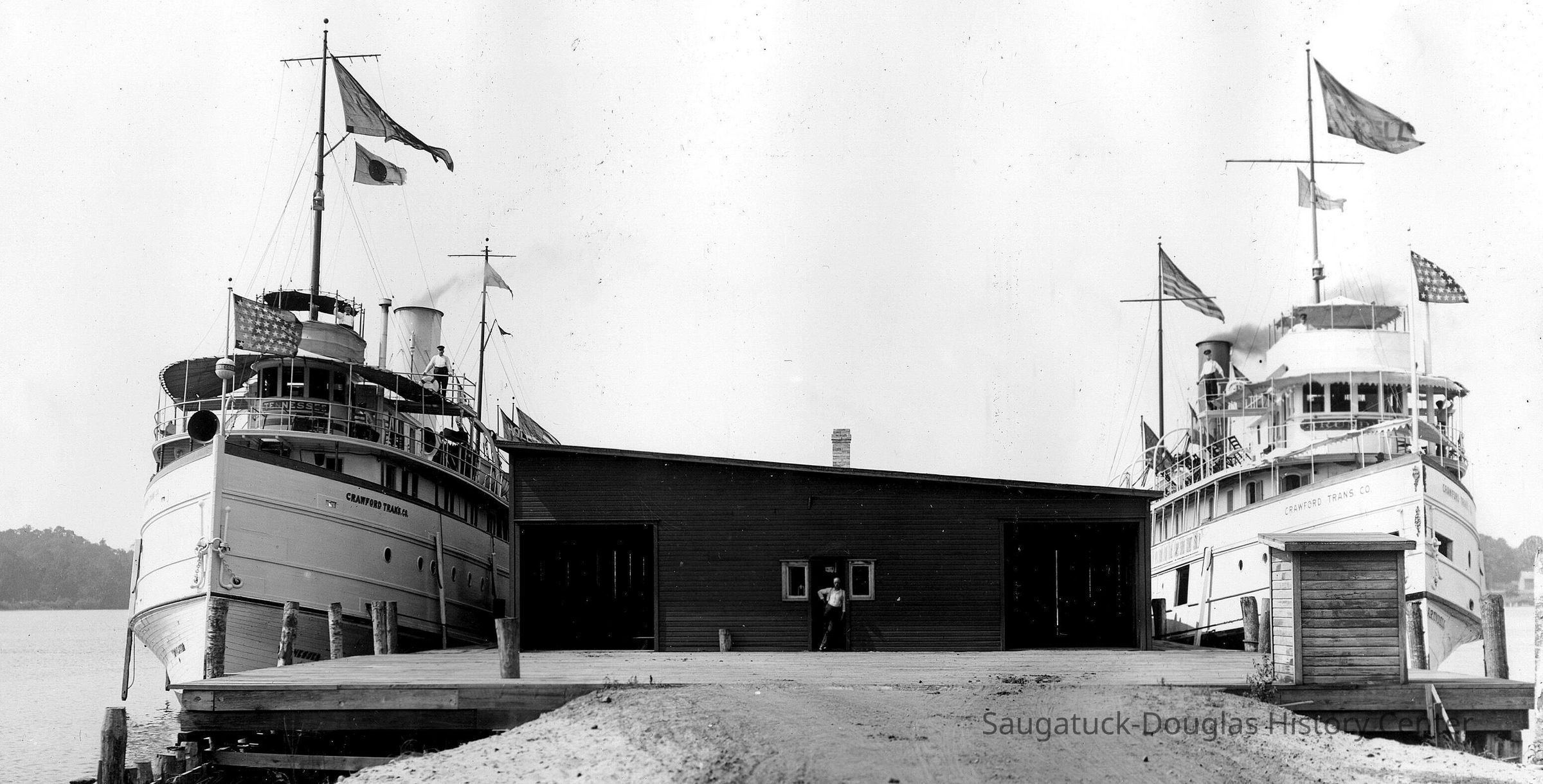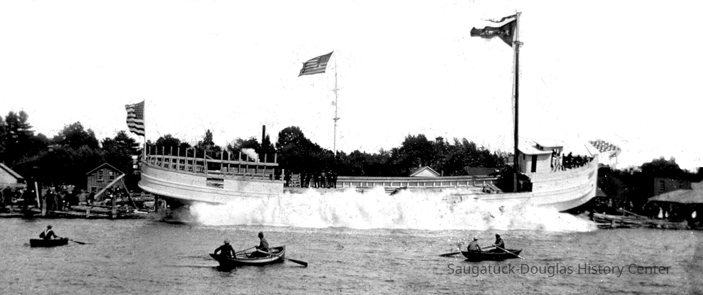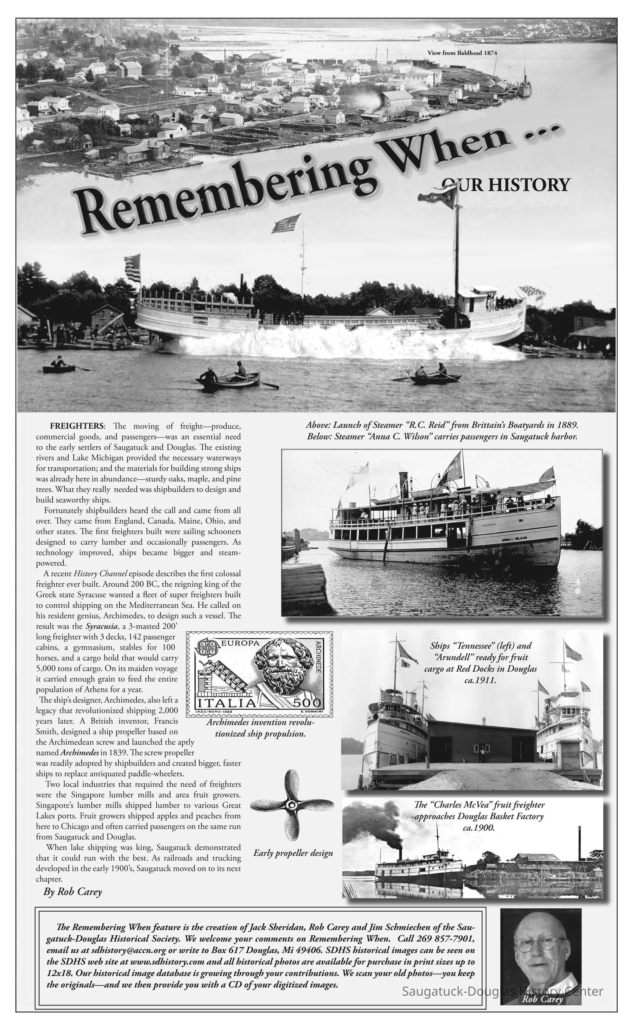 FREIGHTERS: The moving of freight—produce, commercial goods, and passengers—was an essential need to the early settlers of Saugatuck and Douglas. The existing rivers and Lake Michigan provided the necessary waterways for transportation; and the materials for building strong ships was already here in abundance—sturdy oaks, maple, and pine trees. What they really needed was shipbuilders to design and build seaworthy ships. Fortunately shipbuilders heard the call and came from all over. They came from England, Canada, Maine, Ohio, and other states. The first freighters built were sailing schooners designed to carry lumber and occasionally passengers. As technology improved, ships became bigger and steam-powered. A recent History Channel episode describes the first colossal freighter ever built. Around 200 BC, the reigning king of the Greek state Syracuse wanted a fleet of super freighters built to control shipping on the Mediterranean Sea. He called on his resident genius, Archimedes, to design such a vessel. The result was the Syracusia, a 3-masted 200’ long freighter with 3 decks, 142 passenger cabins, a gymnasium, stables for 100 horses, and a cargo hold that would carry 5,000 tons of cargo. On its maiden voyage it carried enough grain to feed the entire population of Athens for a year. The ship’s designer, Archimedes, also left a legacy that revolutionized shipping 2,000 years later. A British inventor, Francis Smith, designed a ship propeller based on the Archimedean screw and launched the aptly named Archimedes in 1839. The screw propeller was readily adopted by shipbuilders and created bigger, faster ships to replace antiquated paddle-wheelers. Two local industries that required the need of freighters were the Singapore lumber mills and area fruit growers. Singapore’s lumber mills shipped lumber to various Great Lakes ports. Fruit growers shipped apples and peaches from here to Chicago and often carried passengers on the same run from Saugatuck and Douglas. When lake shipping was king, Saugatuck demonstrated that it could run with the best. As railroads and trucking developed in the early 1900’s, Saugatuck moved on to its next chapter. By Rob Carey