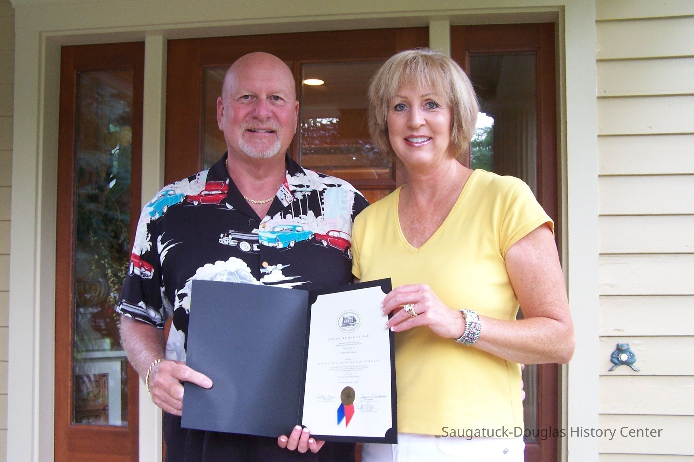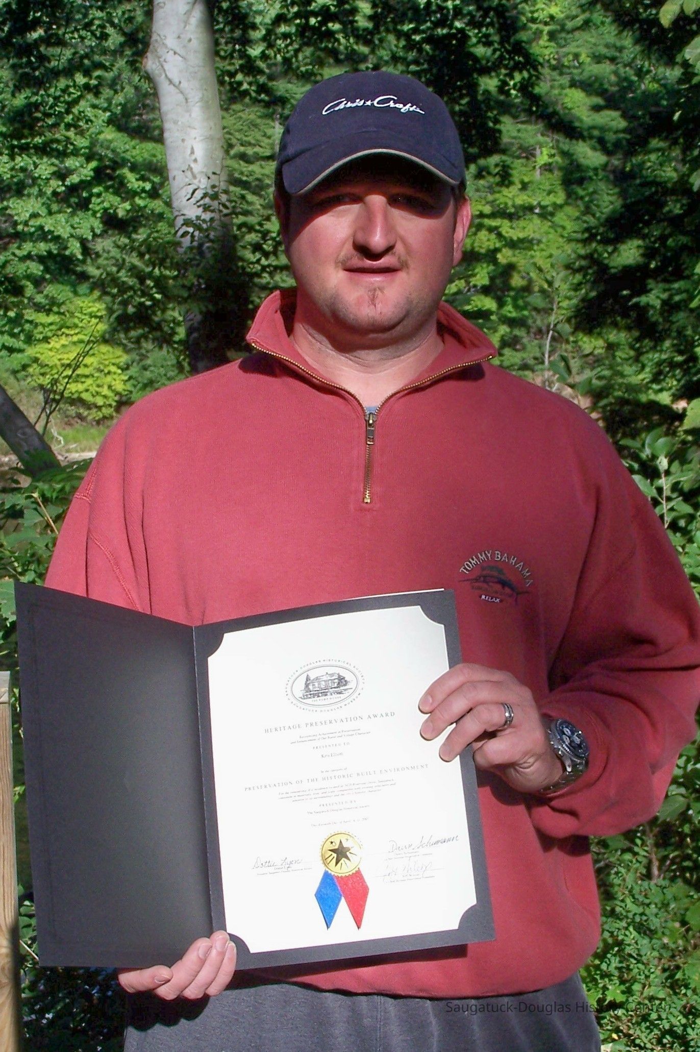 Video recording of SDHS May Meeting devoted to the 2007 Heritage Preservation Awards Opening announcements by Dottie Lyon, Peg Sanford, James Schmiechen, Judy Oberholtzer, Vic Bella, Judy Anthrop, Tom Anthrop, Maryrita Peters and Judy Mauger. Award presentation by Jeff Wilcox. 2007 awards recipients: New Construction Award 201 Washington | Douglas - Owners: Max Matteson & Bud Baty Garage at 642 Lake Street | Saugatuck - Owners: Brian Schipper & Richard Lord. 5 Park Street | Saugatuck - Owner: David Gregersen Preservation of The Historic Landscape: Button Gallery Gardens - 955 Center Street | Douglas - Owner: Arthur Frederick The Gardens at 955 Center Street | Douglas - Owners: Karen and Herb Tews Charles Mann Gardens - 543 Maple Street | Saugatuck - Owner: John Migas Pier Cove Ravine - Pier Cove | Pier Cove Ravine Trust Preservation of The Historic Built Environment 215 Grand Street | Saugatuck - Owners: Barry Avedon & David Morris, 544 St. Joseph Street - Saugatuck - Owners: Robert & Pat Schuitema Kirby House - 294 Center Street | Douglas - Owners: Jim Gowran and Ray Riker - Kirby House Creators: Marsha & Loren Kontio Simpson Cottage (Orchard Cottage) - 11 Lakeshore Drive | Douglas - Owner: Michael Hoffman 3428 Riverside Drive - Saugatuck - Owner: Kris Elliott [ELLIOTT MATTHEW K & JENNIFER in property records] The Nest - 245 Water Street | Saugatuck - Owner: Ethie [Effie] Haworth 64 Lakeview Street - Saugatuck - Owners: Dick & Mary Lyons Blue Star Corridor Art Palette Sign - City of Saugatuck - Saugatuck Mayor Toni Vettori. Environmental Zoning Ordinances, Saugatuck Township Trustees & Planning Commission Saugatuck Township - Bill Wester, Supervisor. - Jim Hansen, Planning Chair. Heritage Preservation Leadership Award Joyce Petter - Lifetime Commitment to Preservation. Nancy Budd - Old School House | Douglas Honor & Respect Good Goods - 106 Mason Street | Saugatuck - Owner: Sandra Randolph 1001 Allegan Street - Saugatuck - Owners: Clyde & Belva Ball Maplewood Hotel - 428 Butler Street | Saugatuck - Owner: Catherine Simon Belvedere Inn - 3656 63rd Street | Saugatuck - Owner: Pete Ta & Shaun Glynn 966 Holland Street - Saugatuck - Owner: Sylvia Randolph Christian Science Society - 346 Butler Street | Saugatuck - Christian Science Society Members Hoermann Cottage (Chalet Gallery)- 621 Pleasant Street | Saugatuck - Owner: Siegfried Hoermann Lighthouse Property - Oxbow | Saugatuck Township - Owners: Norm & Connie Deam Martel House - 345 Grand Street | Saugatuck - Owners: Jane Rodgers & Sam Ramirez The 2007 Committee: Ken Carls, Chuck Carlson, Pieter Lion, Dottie Lyon, Judy Oberholtzer, Peg Sanford, Jim Schmiechen, Bob Simonds, Jeff Wilcox , Nicolaas Wilkens and Tom Wolterink. Jared Kearns, Producer Jack Sheridan, Tech Support A CD containing photos of the winners, the word documents that created the award letters, award certificates, press releases, name tags, schedule and spreadsheets is located in box 119 C.
