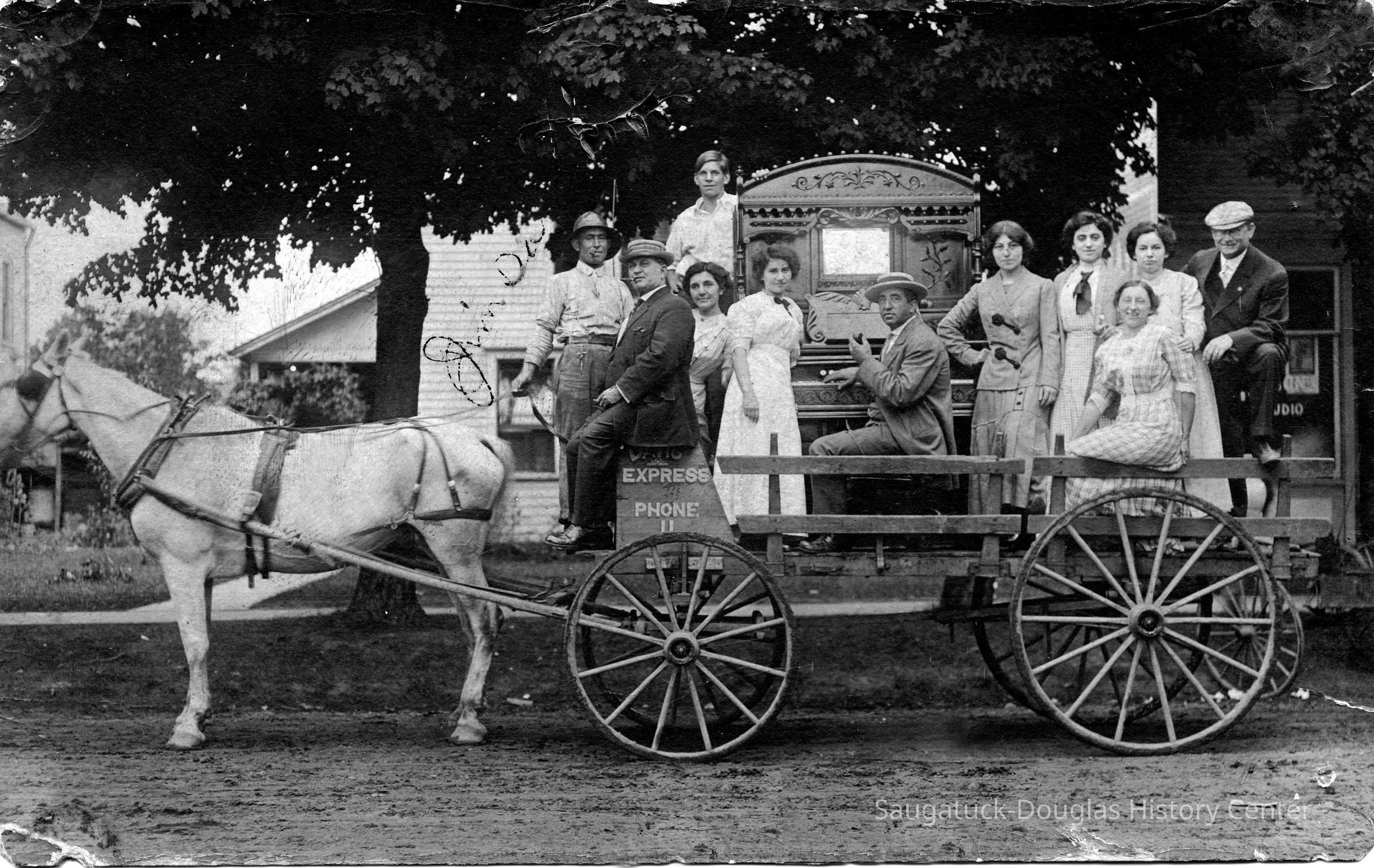 A white horse is harnessed to a wagon loaded with eleven adults and an organ. The wagon is marked ? Express Phone 11 behind front wheel.