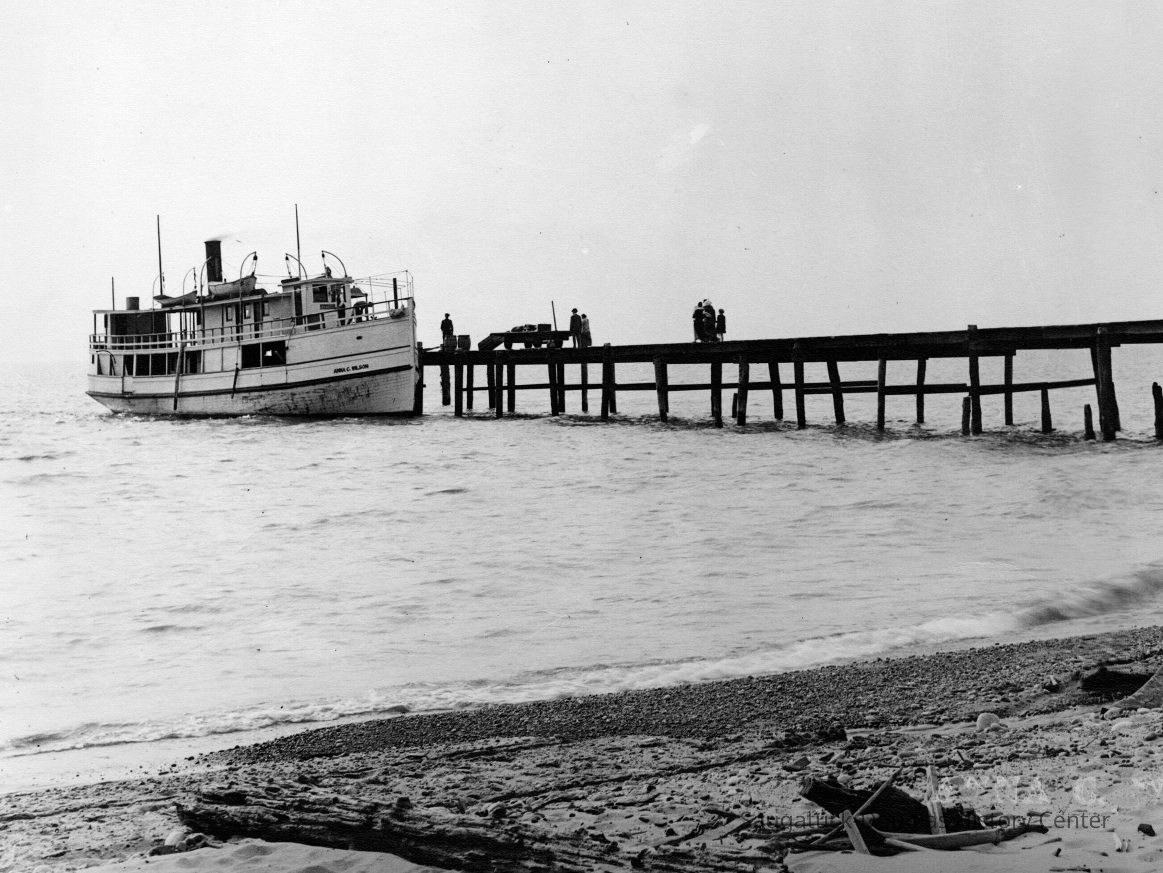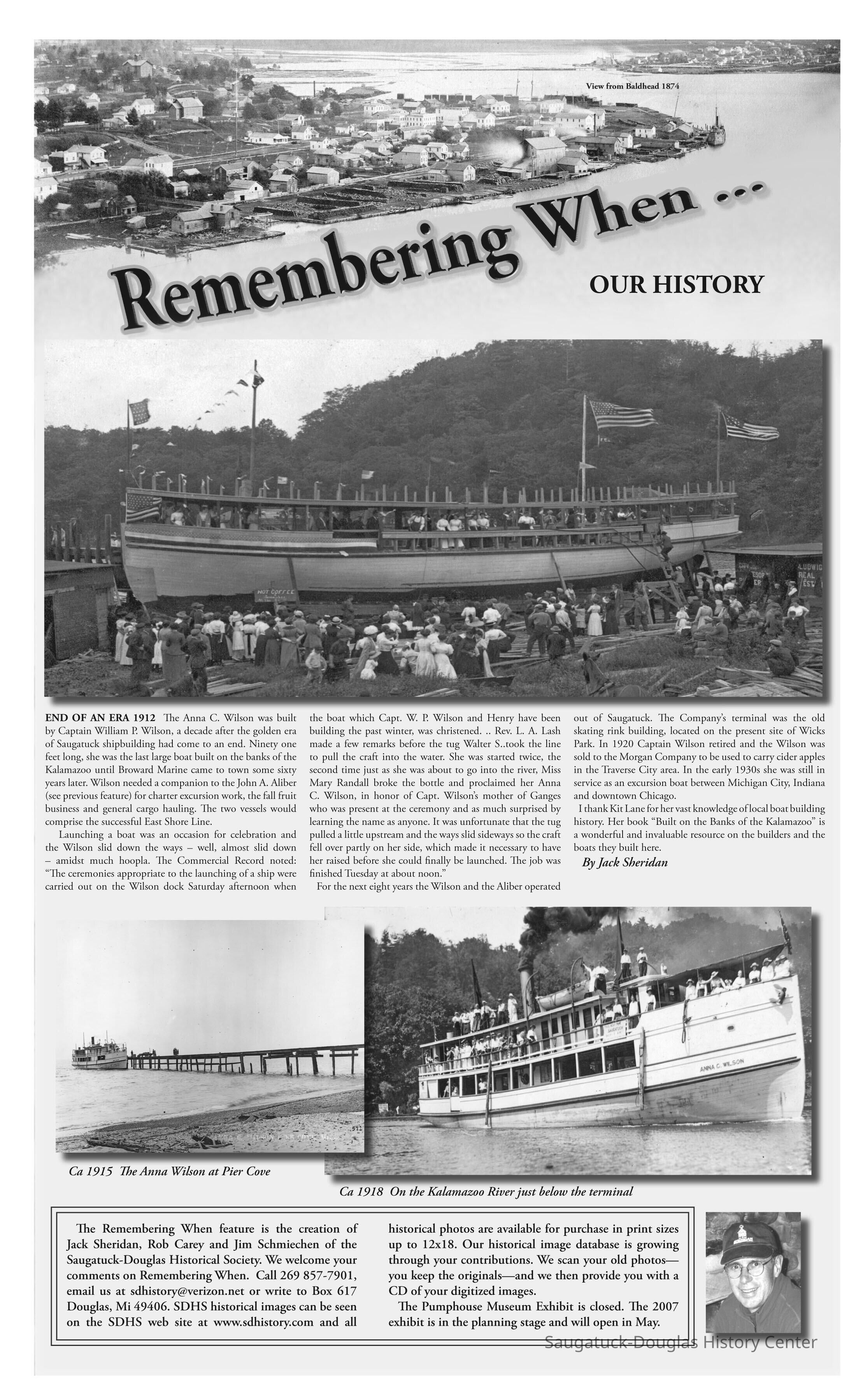 END OF AN ERA 1912 The Anna C. Wilson was built by Captain William P. Wilson, a decade after the golden era of Saugatuck shipbuilding had come to an end. Ninety one feet long, she was the last large boat built on the banks of the Kalamazoo until Broward Marine came to town some sixty years later. Wilson needed a companion to the John A. Aliber (see previous feature) for charter excursion work, the fall fruit business and general cargo hauling. The two vessels would comprise the successful East Shore Line. Launching a boat was an occasion for celebration and the Wilson slid down the ways – well, almost slid down – amidst much hoopla. The Commercial Record noted: “The ceremonies appropriate to the launching of a ship were carried out on the Wilson dock Saturday afternoon when the boat which Capt. W. P. Wilson and Henry have been building the past winter, was christened. .. Rev. L. A. Lash made a few remarks before the tug Walter S..took the line to pull the craft into the water. She was started twice, the second time just as she was about to go into the river, Miss Mary Randall broke the bottle and proclaimed her Anna C. Wilson, in honor of Capt. Wilson’s mother of Ganges who was present at the ceremony and as much surprised by learning the name as anyone. It was unfortunate that the tug pulled a little upstream and the ways slid sideways so the craft fell over partly on her side, which made it necessary to have her raised before she could finally be launched. The job was finished Tuesday at about noon.” For the next eight years the Wilson and the Aliber operated out of Saugatuck. The Company’s terminal was the old skating rink building, located on the present site of Wicks Park. In 1920 Captain Wilson retired and the Wilson was sold to the Morgan Company to be used to carry cider apples in the Traverse City area. In the early 1930s she was still in service as an excursion boat between Michigan City, Indiana and downtown Chicago. I thank Kit Lane for her vast knowledge of local boat building history. Her book “Built on the Banks of the Kalamazoo” is a wonderful and invaluable resource on the builders and the boats they built here. By Jack Sheridan