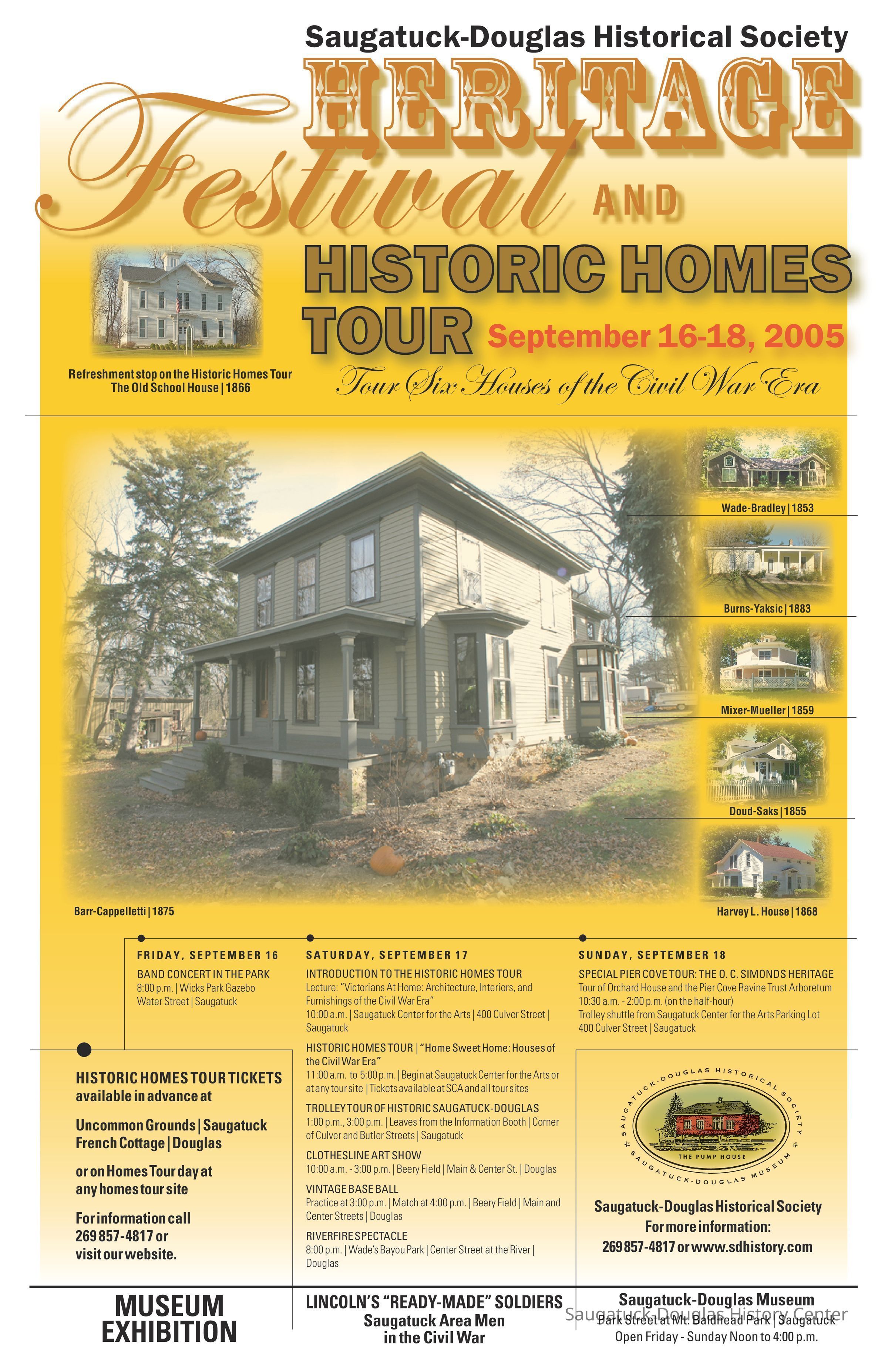 FOR IMMEDIATE RELEASE Contact: Merle Malmquist 269/857-4817 Dottie Lyon 269/857-8902 SAUGATUCK-DOUGLAS HERITAGE FESTIVAL AND HISTORIC HOMES TOUR SEPTEMBER 16-17-18, 2005 On September 16-17-18, 2005, the Heritage Preservation Committee of the Saugatuck-Douglas (Michigan) Historical Society will sponsor its fourth annual Heritage Festival. Building on the success of previous years’ events, many fun and educational activities will be available to entice adults and children to discover the rich historical, architectural, and agricultural heritage of the Saugatuck-Douglas area. The Festival will focus on Saugatuck-Douglas during the Civil War, expanding on the theme of this year’s exhibition at the Society’s award-winning Museum, “Lincoln’s ‘Ready-Made’ Soldiers: Saugatuck Men in the Civil War.” The centerpiece of the weekend will be an opportunity to tour of six private houses of the period during the Historic Homes Tour, “Home Sweet Home: Houses of the Civil War Era.” The three-day event will kick off on Friday night with an old-fashioned BAND CONCERT in the park, followed on Saturday by the HISTORIC HOMES TOUR; an HISTORIC HOMES LECTURE, “Victorians at Home: Architecture, Art, and Interiors of the Civil War Era”; TROLLEY TOURS of the area; guided VINEYARD TOURS at Fenn Valley Winery; a traditional "Clothesline" ART SHOW; a vintage “BASE BALL” GAME; and at dusk the spectacle of RIVERFIRE. The weekend’s activities will conclude on Sunday with a SPECIAL PIER COVE TOUR, “The Heritage of O. C. Simonds: ‘Orchard House’ and ‘Pier Cove Ravine Trust Arboretum.’” Designed for residents and visitors of all ages, many events are free. A description of the various events plus a schedule for the weekend follows on the attached pages. MORE ... ADD ONE – SAUGATUCK-DOUGLAS HERITAGE FESTIVAL The Saugatuck/Douglas area was fortunate in that it did not experience the devastating destruction of the fires that hit many Midwest frontier towns in the mid- to late 1800s. As a result, the towns of Saugatuck and Douglas provide a rare opportunity to observe pre- and post-Civil War architecture in a living environment, interspersed with structures that reflect the Arts & Crafts and Colonial Revival movements of the early 20th century. That architectural heritage, together with a setting of great natural beauty on the shores of the Kalamazoo River and Lake Michigan surrounded by the rolling agricultural vistas of Allegan County, provide the backdrop for a fun and informative experience for both adults and children at the Saugatuck-Douglas Historical Society’s fourth annual Saugatuck-Douglas Heritage Festival. The Festival’s goal is to increase awareness of Saugatuck/Douglas area history and architectural heritage as well as to promote heritage tourism. The ticket price of $20 includes admission to the Historic Homes Tour, the SCA Lecture, and the Special Pier Cove Tour. All other Festival events are free. Tickets will be available after August 1, 2005 at Uncommon Grounds Café in Saugatuck and at The French Cottage in Douglas as well as at the Saugatuck-Douglas Historical Museum. On the day of the events, tickets can also be purchased at the home sites, at the Festival information centers located in downtown Saugatuck and in downtown Douglas, and at the Saugatuck Center for the Arts. HISTORIC HOMES TOUR | “Home Sweet Home: Houses of the Civil War Era” Saturday, September 17, 11:00 a.m. to 5:00 p.m. | Admission $20 Tour six Civil War era houses in Saugatuck and Douglas, including: 1. Mixer-Mueller House (Octagon, 1859/2005) 2. Wade-Bradley House (Folk Victorian, 1853/1990s) 3. Doud-Saks House (Victorian Mill Workers Cottage, 1855) 4. Harvey L. House House (Greek Revival, 1868) 5. Barr-Cappelletti House (Italianate, ca. 1875) 6. Burns-Yaksic House (Italianate, 1881/2004) The Historic Homes Tour will also include a refreshment stop at the Old School House (Italianate, 1866) on Douglas’s Center Street, one of the finest examples of 19th century school architecture in Michigan. 7. The Old School House (Italianate,1866) In addition to the tour houses open for view, a guided street walk of Douglas will also be available to highlight the many other fine Civil War era buildings in the village. (See enclosure for more information about the homes.) HISTORIC HOMES LECTURE | “Victorians at Home: Architecture, Art, and Interiors of the Civil War Era” Saturday, September 17 | 10:00 a.m. | Admission included with Historic Homes Tour ticket, or $5 separately The Saugatuck Center for the Arts will present a lecture that will illuminate various aspects of the dwellings and decorative arts that shaped the domestic scene in the 1850 to 1870 period, with special emphasis on the homes tour houses. The SCA event will serve as an informative background and introduction to the Historic Homes Tour. SPECIAL PIER COVE TOUR | “The Heritage of O. C. Simonds” Sunday, September 18, 10:30 a.m. to 2:30 p.m. | Admission included in the Historic Homes Tour ticket, or $5 separately Drive to Pier Cove or, to facilitate parking, a trolley will be provided for the short trip to Pier Cove (about 10 minutes south of Douglas) to tour the Orchard House Cottage (Greek Revival, 1855/1908) and the Pier Cove Ravine Trust Arboretum, both creations of Simonds, one of America’s foremost landscape/garden designers at the turn of the 20th century (Morton Arboretum, Graceland Cemetery, etc.). Beginning at 10:30 a.m., the trolley will depart from the Saugatuck Center for the Arts (400 Culver Street, Saugatuck) on the half hour, with the last departure at 2:00 pm. RIVERFIRE | A Spectacle of Bonfires on the Water Saturday, September 17 | 8:00 p.m. | Admission free As darkness falls, a Voyageur canoe will glide silently across the water propelled by 12 men and women to light a series of bonfires on the Kalamazoo River off of scenic Wade’s Bayou Park, located at the east end of Center Street in downtown Douglas.