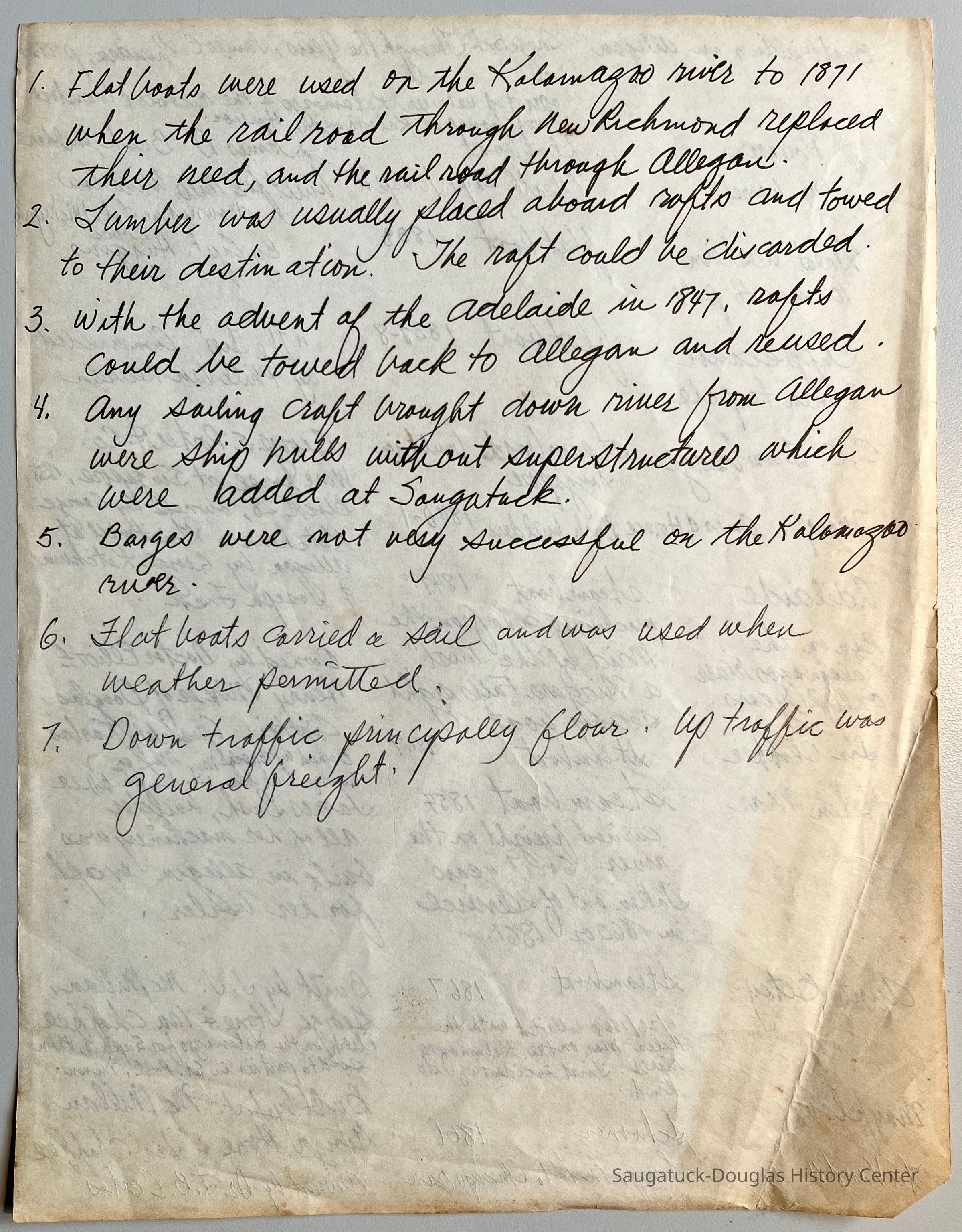Includes information about the ship or boat Pioneer, Great Western, Tippecanoe, C.C. Trowbridge, Droop, Adelaide, Ira Chaffee, Helen Mar, Aunt Betsy, Mayflower and Lavinda, the ships' builders, and seven general notes about shipping on the Kalamazoo.