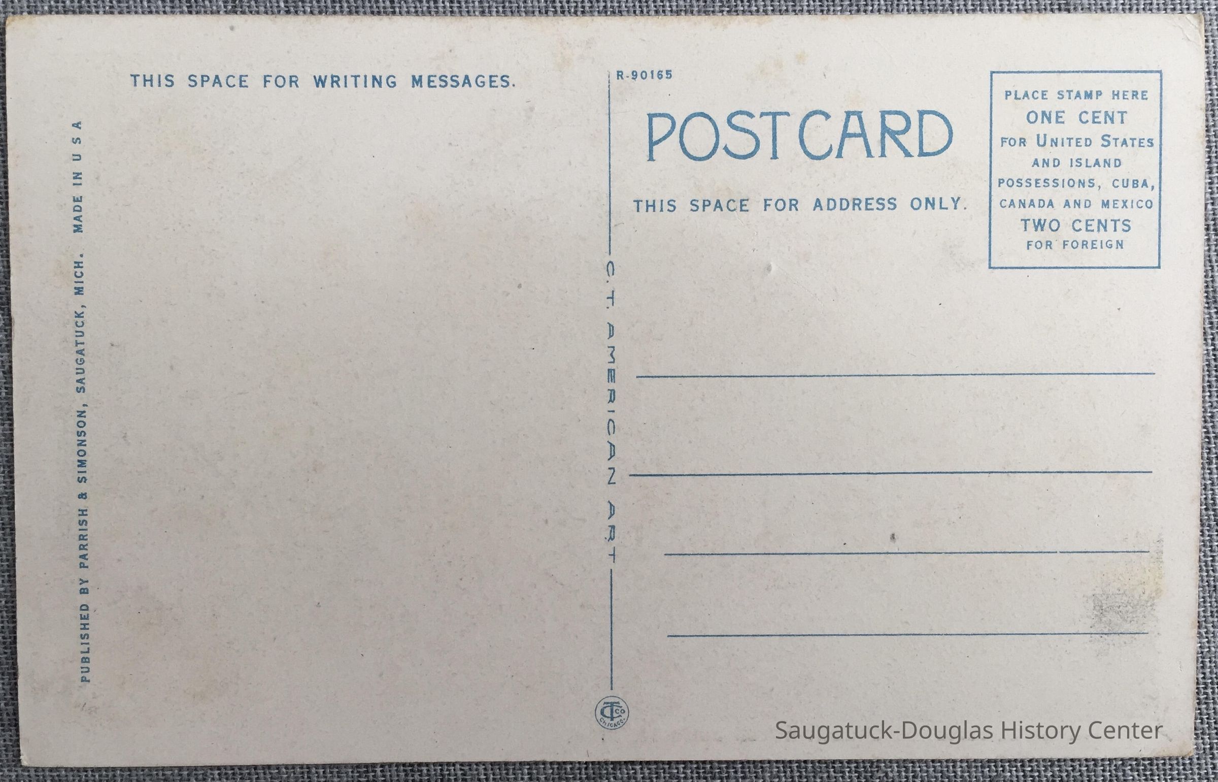 Unmailed, no writing. Color image on front and blue-ink only on back. "Place stamp here" zone lists domestic postage as one cent. for the "United States and island possessions, Cuba, Canada and Mexico."