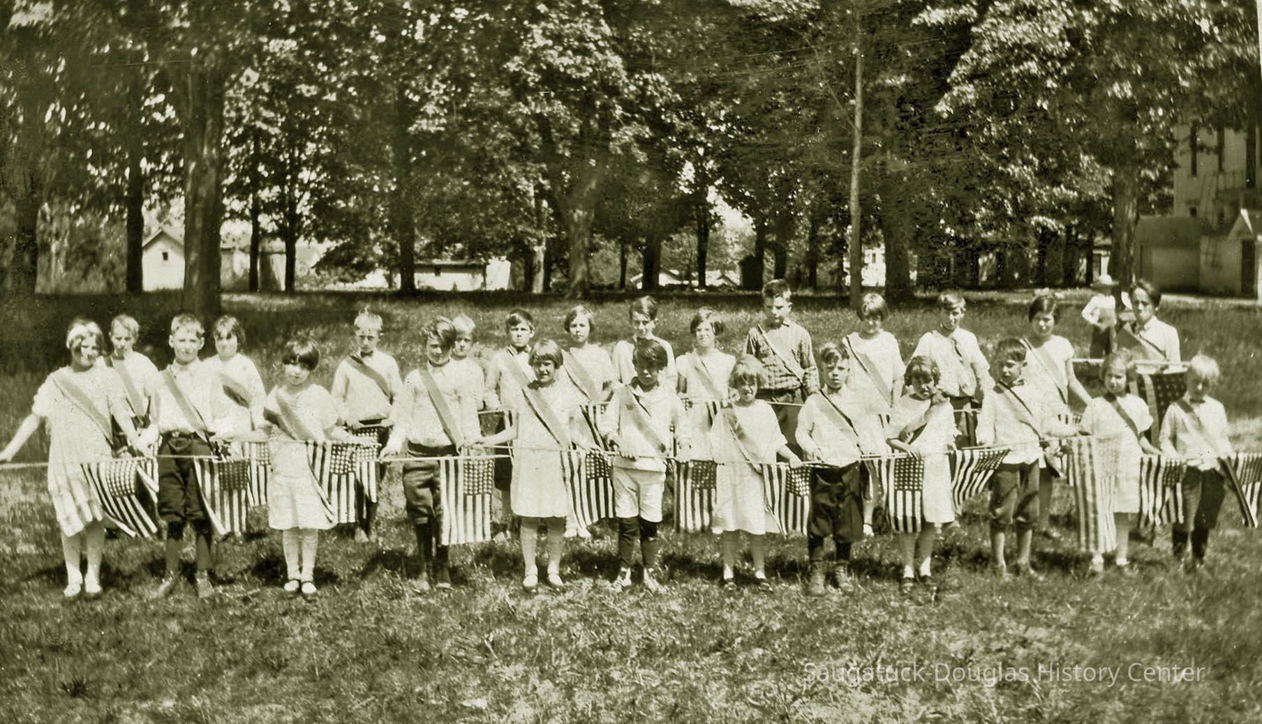 Twenty-five children lined up in two rows. The children are wearing sashes across their bodies and holding a United States flag. They pare posed outside on a lawn.