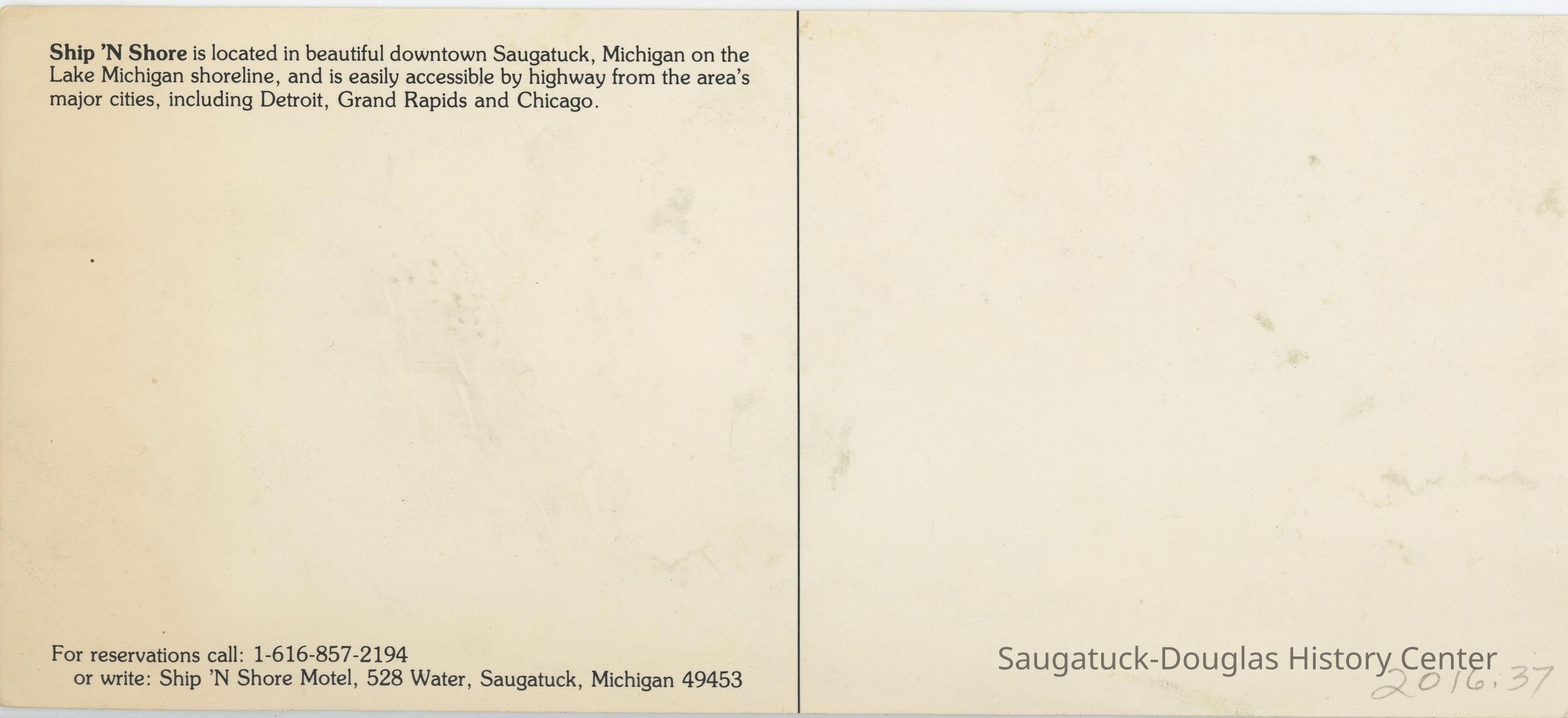 Ship 'N Shore is located in beautiful downtown Saugatuck, Michigan on the Lake Michigan shoreline, and is easily accessible by highway from the area's major cities, including Detroit, Grand Rapids, and Chicago. For reservations call: 1-616-857-2194 or write: Ship 'N Shore Motel, 528 Water, Saugatuck, Michigan 49453