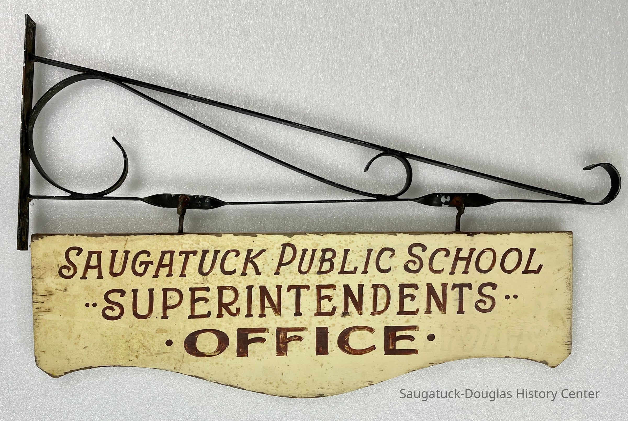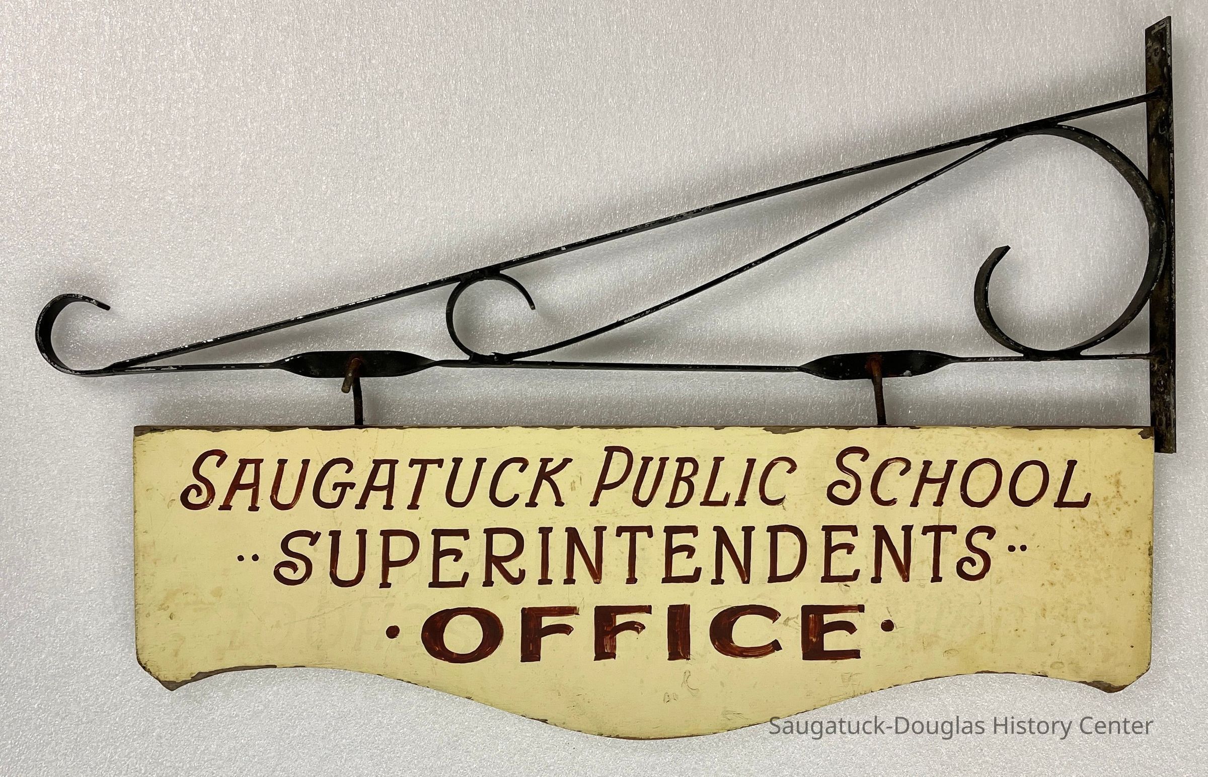 Painted plywood sign that hands from black metal bracket with the text "Saugatuck Public Schools Superintendents Office"