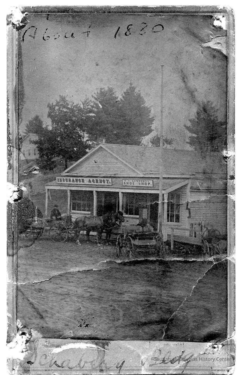 From James T. Fassen: "Also, in that circa 1880 photo of the Schaberg, aka S. C. Goshorn shoe shop with insurance agent place, in the background is Capt. Robert Woodhull’s place on the hill before it was burned down in 1883. In 1881, Woodhull had bought the property from Pieter Kallewaard’s widow, Maria Kallewaard (1814-1892), and their daughter, Alidia (Kallewaard) Vandenburg (1847-1920), both of Fillmore township, for $450. They bought if for a buck in 1876. ... It was a quick claim deed. A dollar is the least you can claim on property. Most likely he was renting or leasing the property and it was just to clear the title."