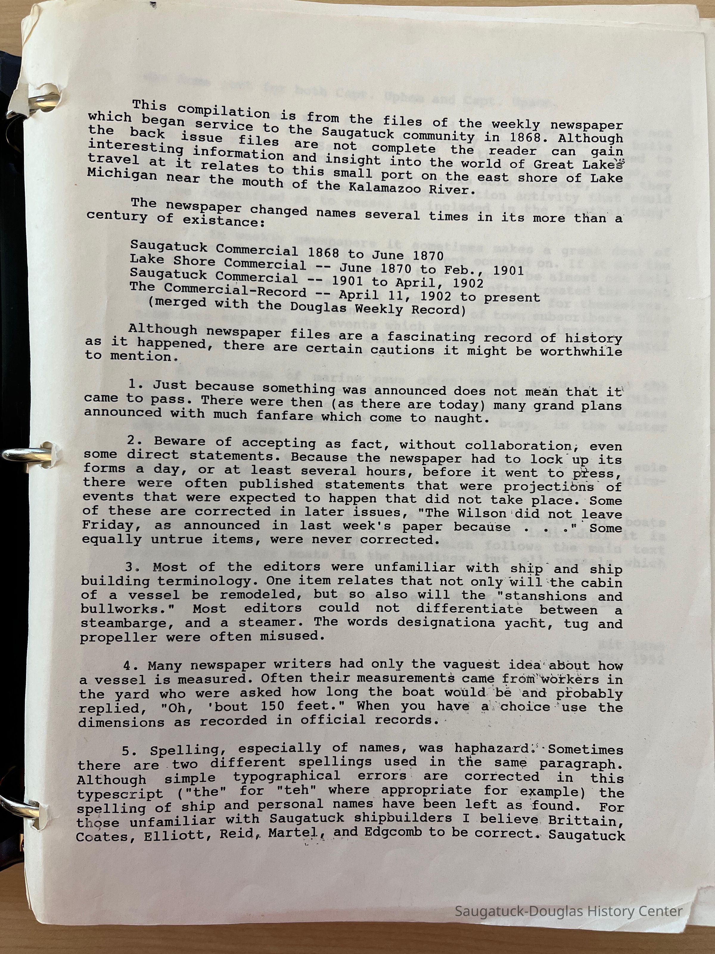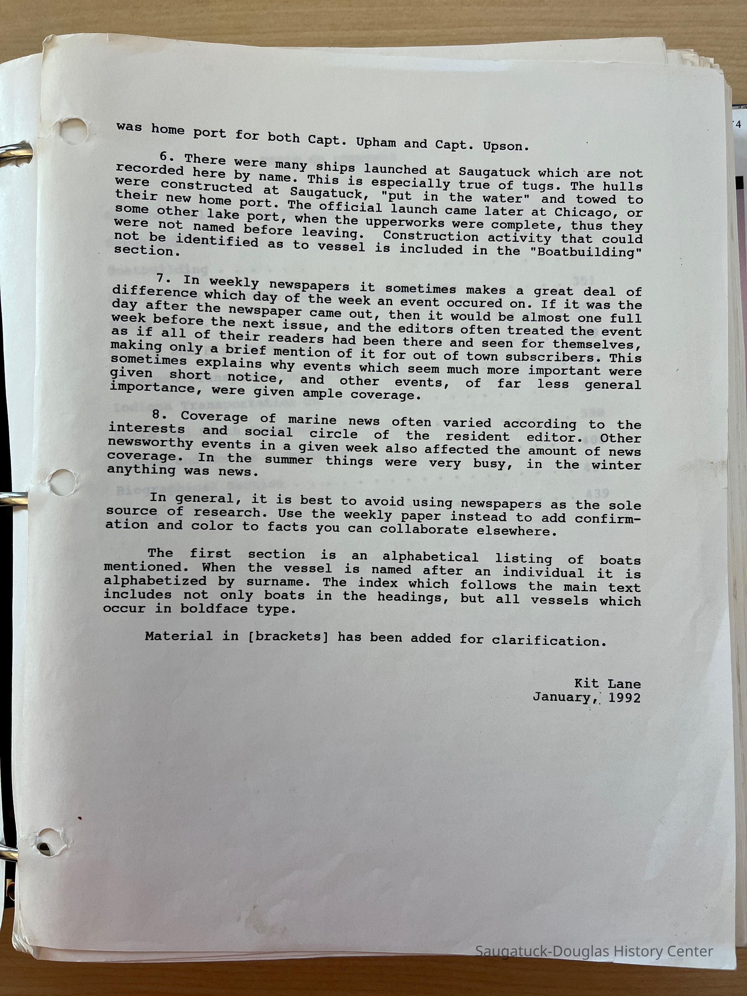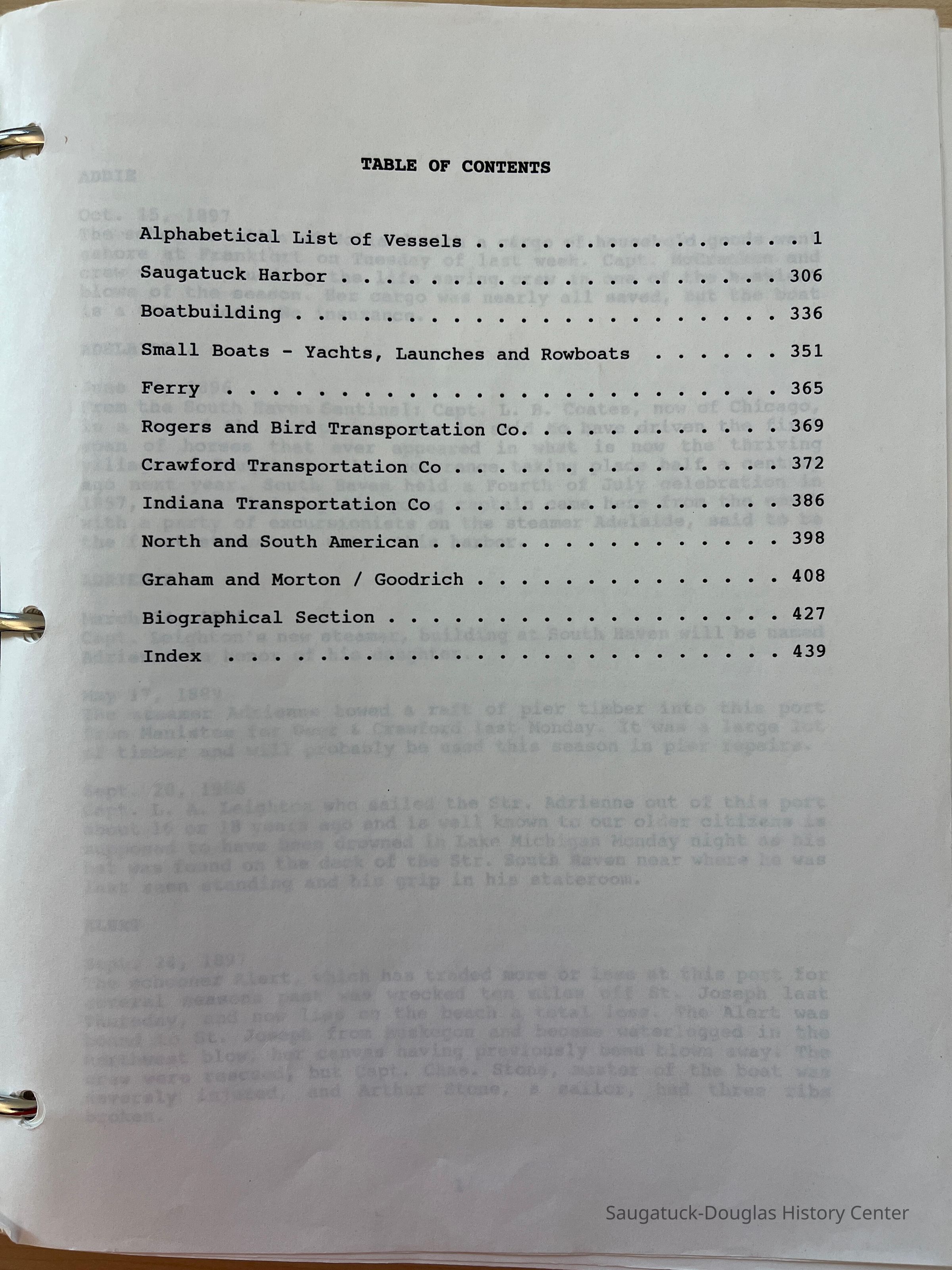 Large binder filled with historical research about vessels, the harbor, boat building, ship building, yachts, launches, rowboats, ferries, Rogers and Bird Transportation Co., Crawford Transportation Company, Indiana Transportation Company, SS North America, SS South American, Graham and Morton Line, Goodrich Line, Biographies, index and an explanatory forward written in 1992. This information was complied by Kit Lane from Saugatuck newspapers and distilled in her book "Built on the Banks of the Kalamazoo."