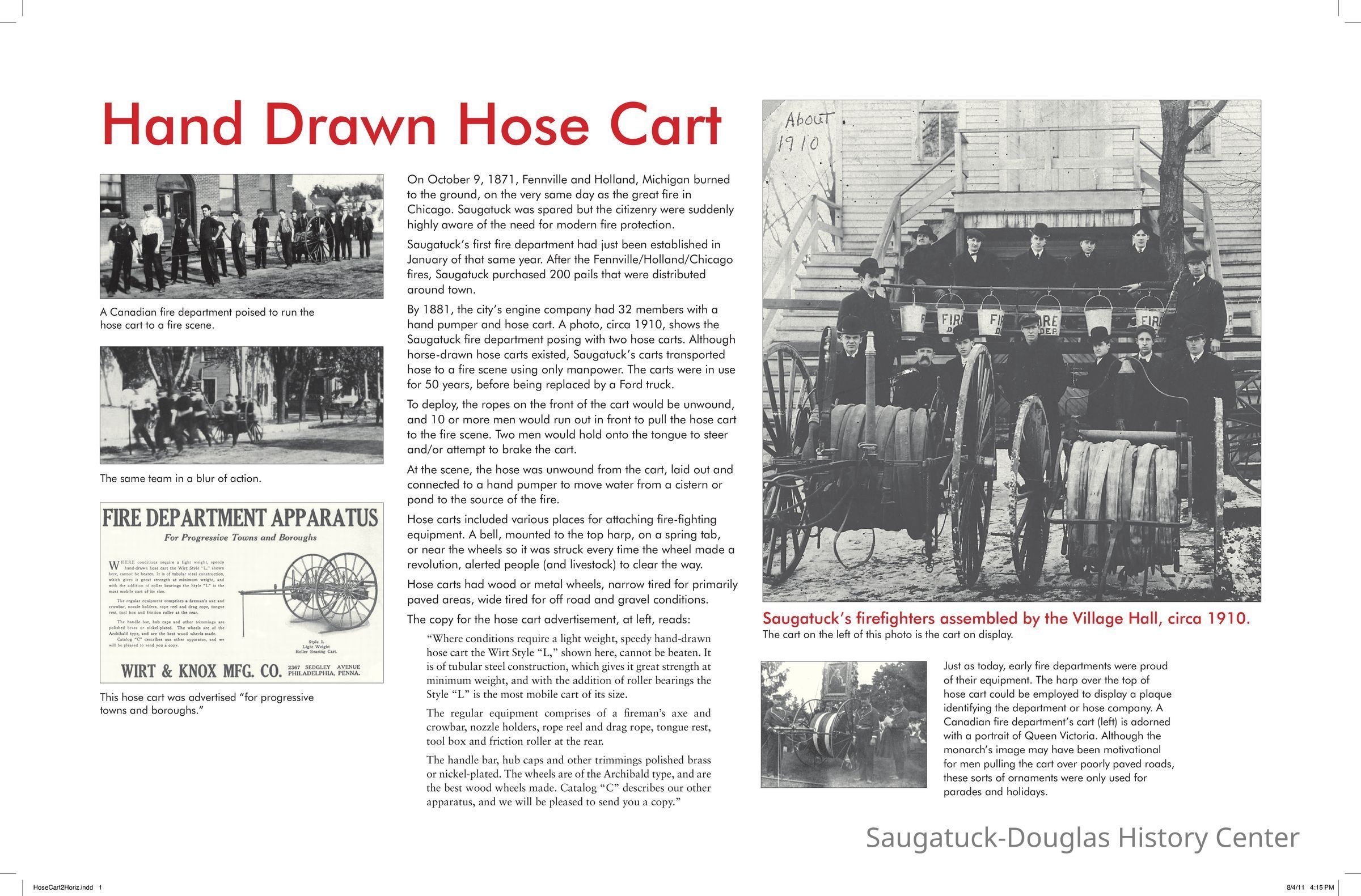 A 1923 era fire hose cart used by the Saugatuck's Fire Department. The hose reel has been returned to the Saugatuck Township Fire District.