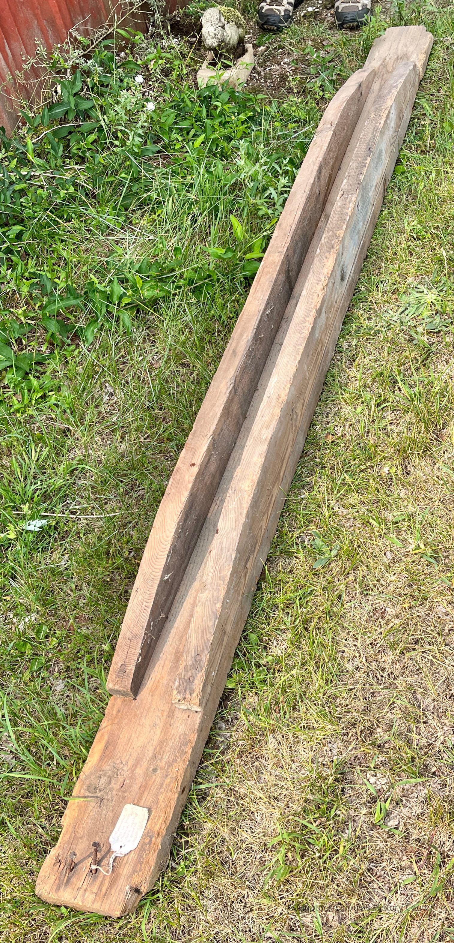 Skid with tag that reads “Found under small cottage on St. Joe and Francis Sts used to skid building to present site. Ed Green/ John Thomas”