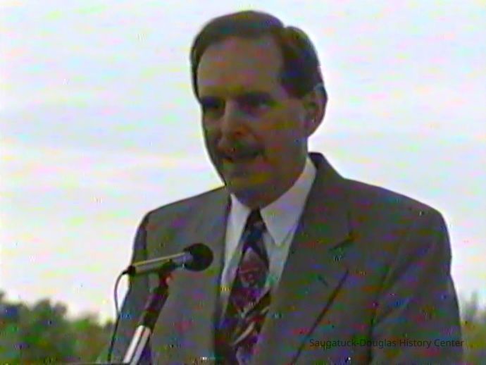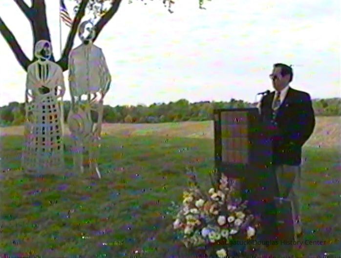 Robert C. Hudson Jr. telling a story about the monument's flagpole and dedication.
