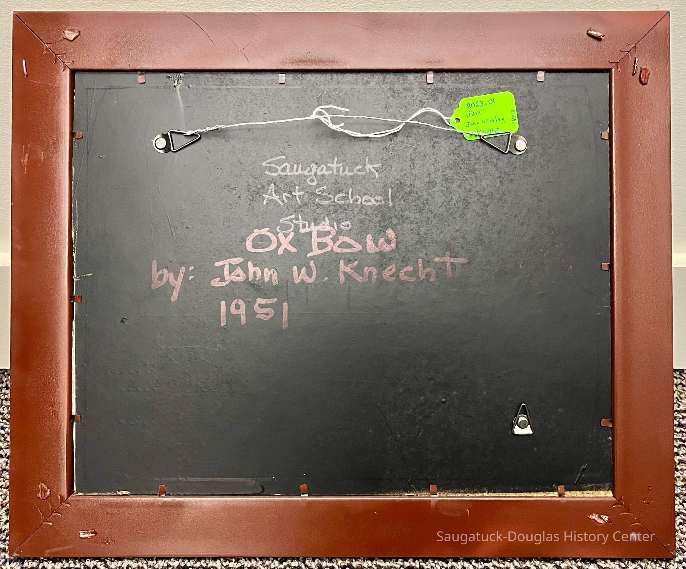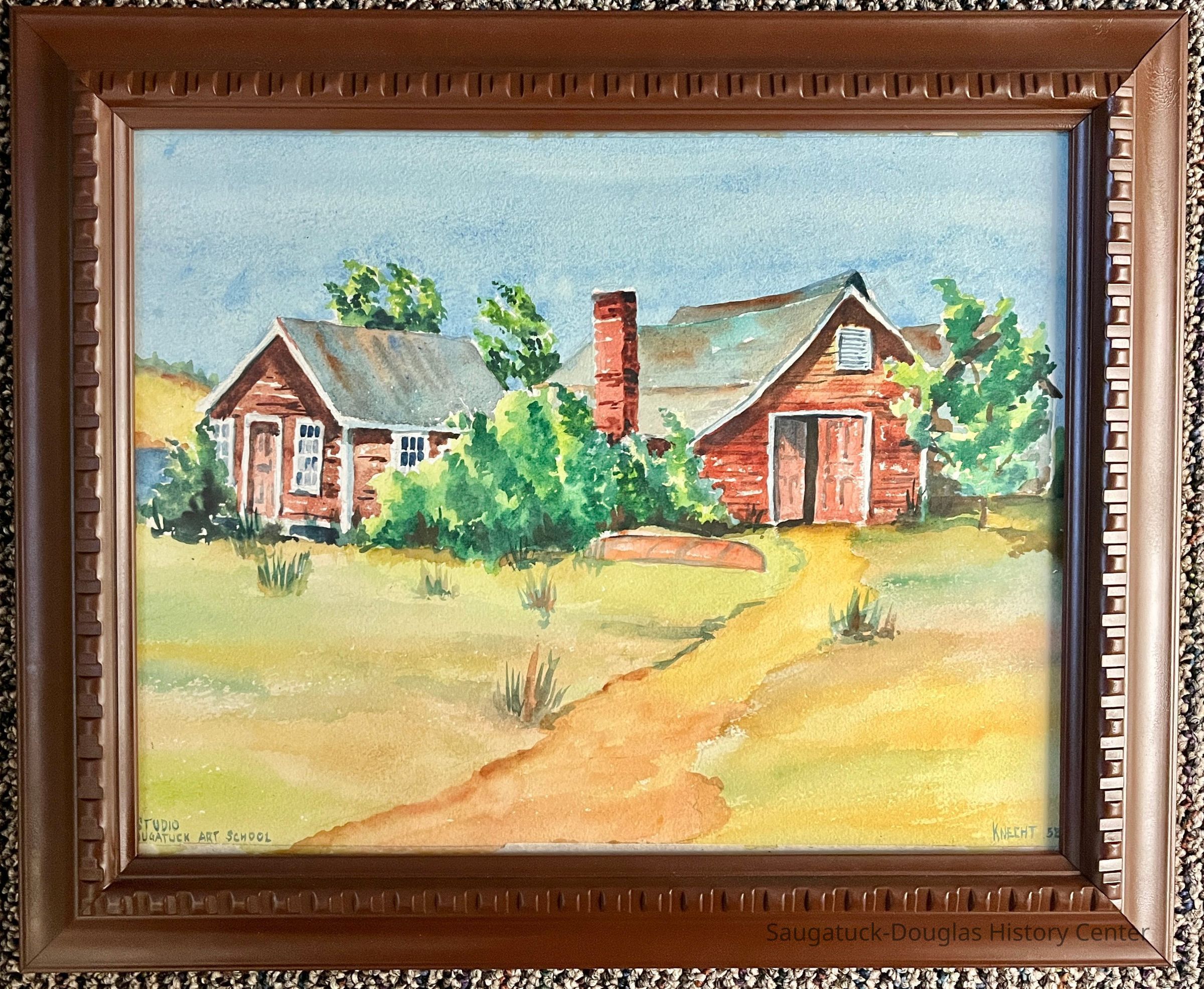 Two red buildings surrounded by green foliage and a canoe. The foreground is a sandy plain with tufts of grass and a pathway. The front of the painting has a "58" by the signature, suggesting the painting was executed in 1958. Text written on the back of the framing includes a date of 1951.