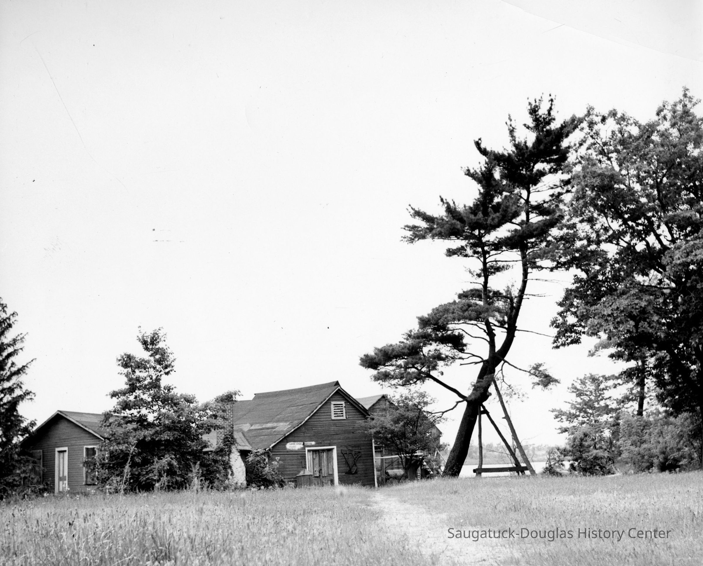 These buildings, part of the Waldorf-Castoria and Drake grouping on the edge of the Ox-Bow lagoon, were torn down in 1969. The foundation of the chimney remains near the fire pit. The Drake studio is the building with the double doors depicted on the right half of the painting. The Waldorf-Castoria (which was immediately north of the Drake) is hidden by a tree so only the brown rooftop is visible.