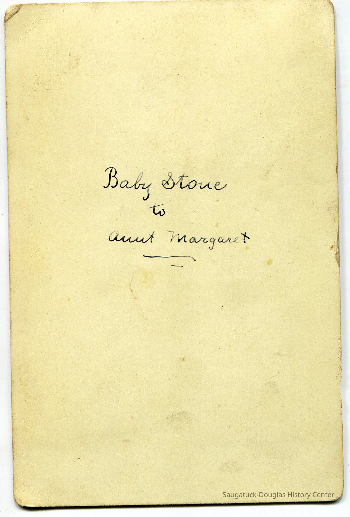 Baby Stoue to Aunt Margaret is written in ink on the back of the card. No other information. May be Baby Stone.