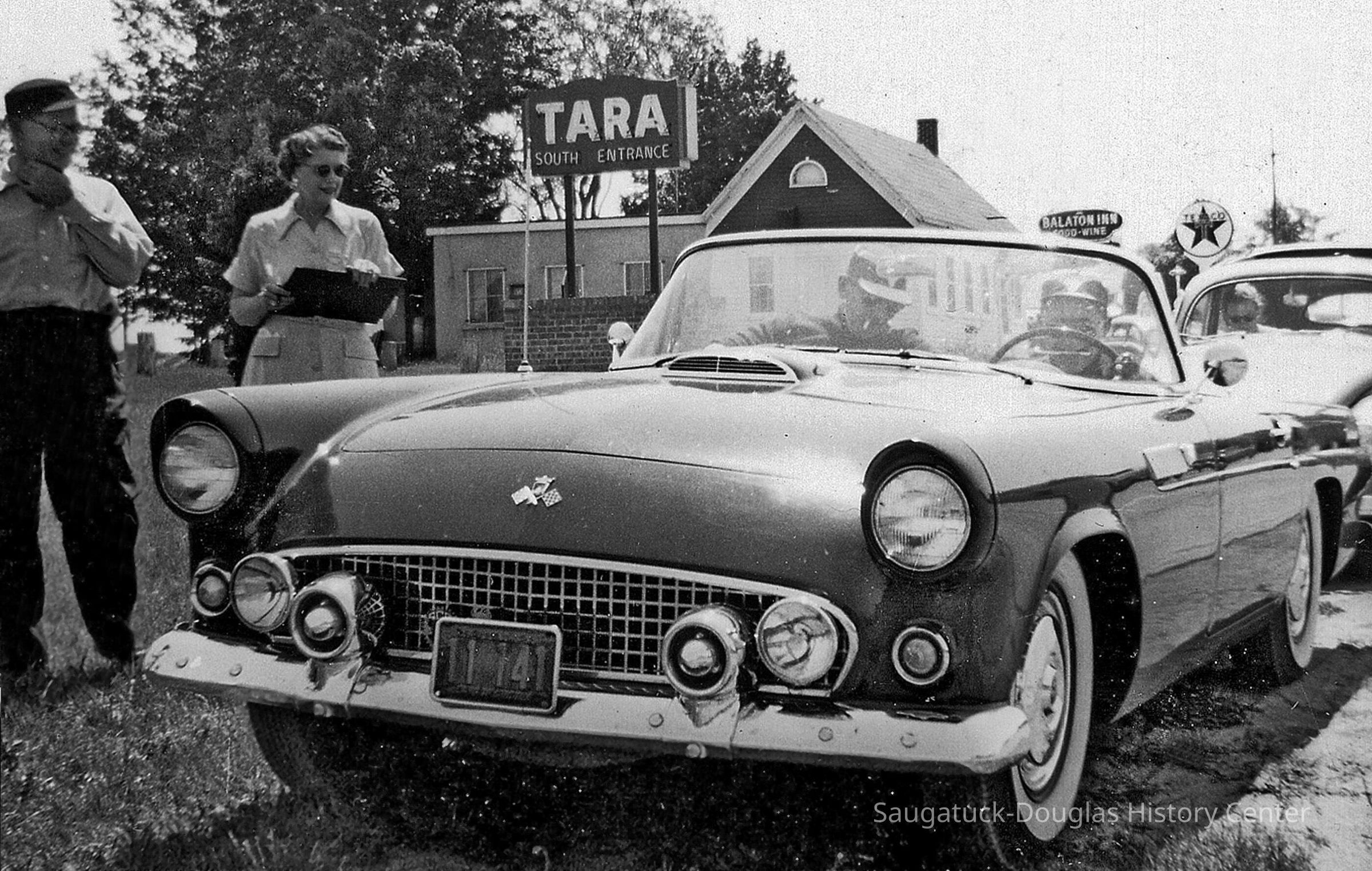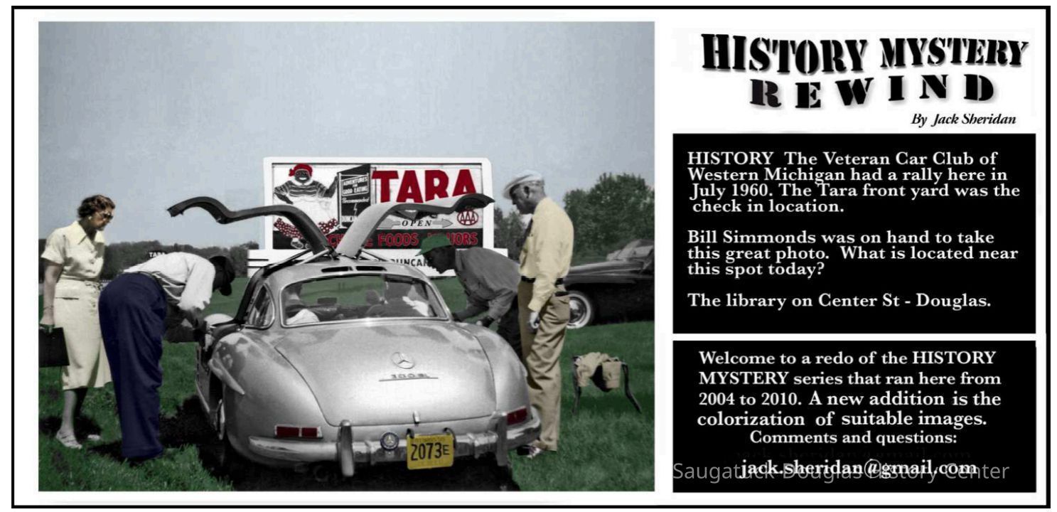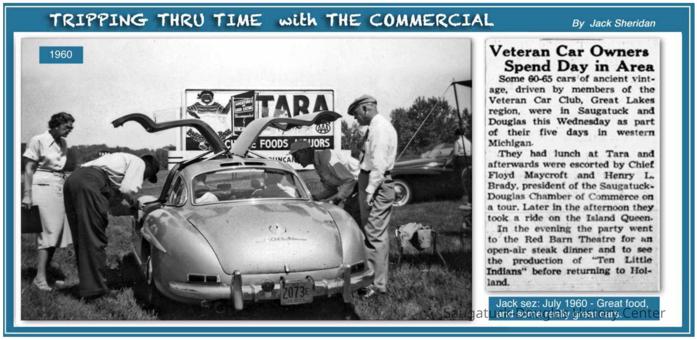 Newspaper article about the event mentions Tara, Floyd Maycroft, Henry L. Brady, Saugatuck Chamber of Commerce, Island Queen, and Red Barn Theatre.
