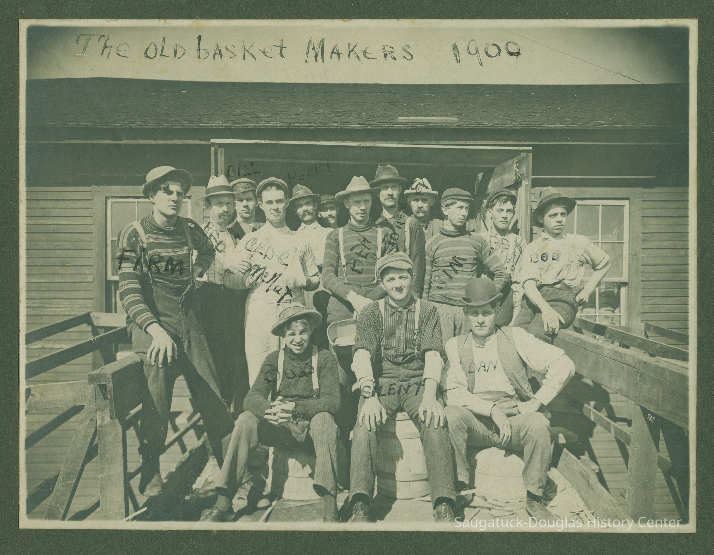 A group of 15 men pose outside the Douglas basket factory in their work clothes. The photo includes a list of the men's names that includes Bud Kirby, Frank Wicks, Dan Faultner, Bob Olson, Herman Simonson, Herm Bekken, John Utton, Ben Weikert, Ed Durham and Bill Wicks.