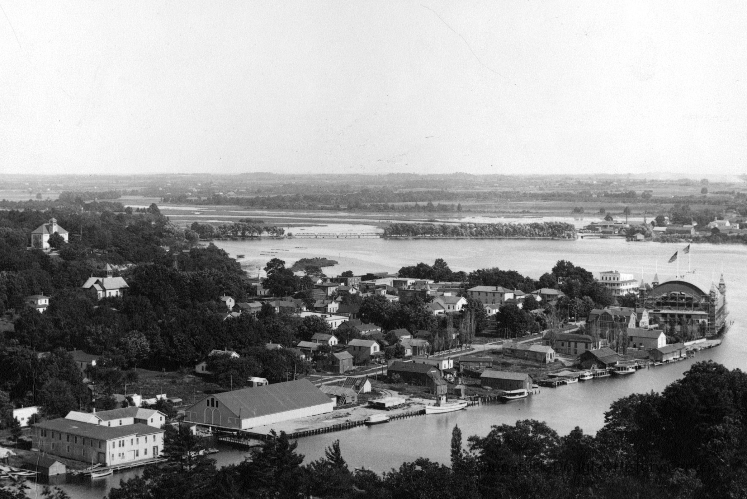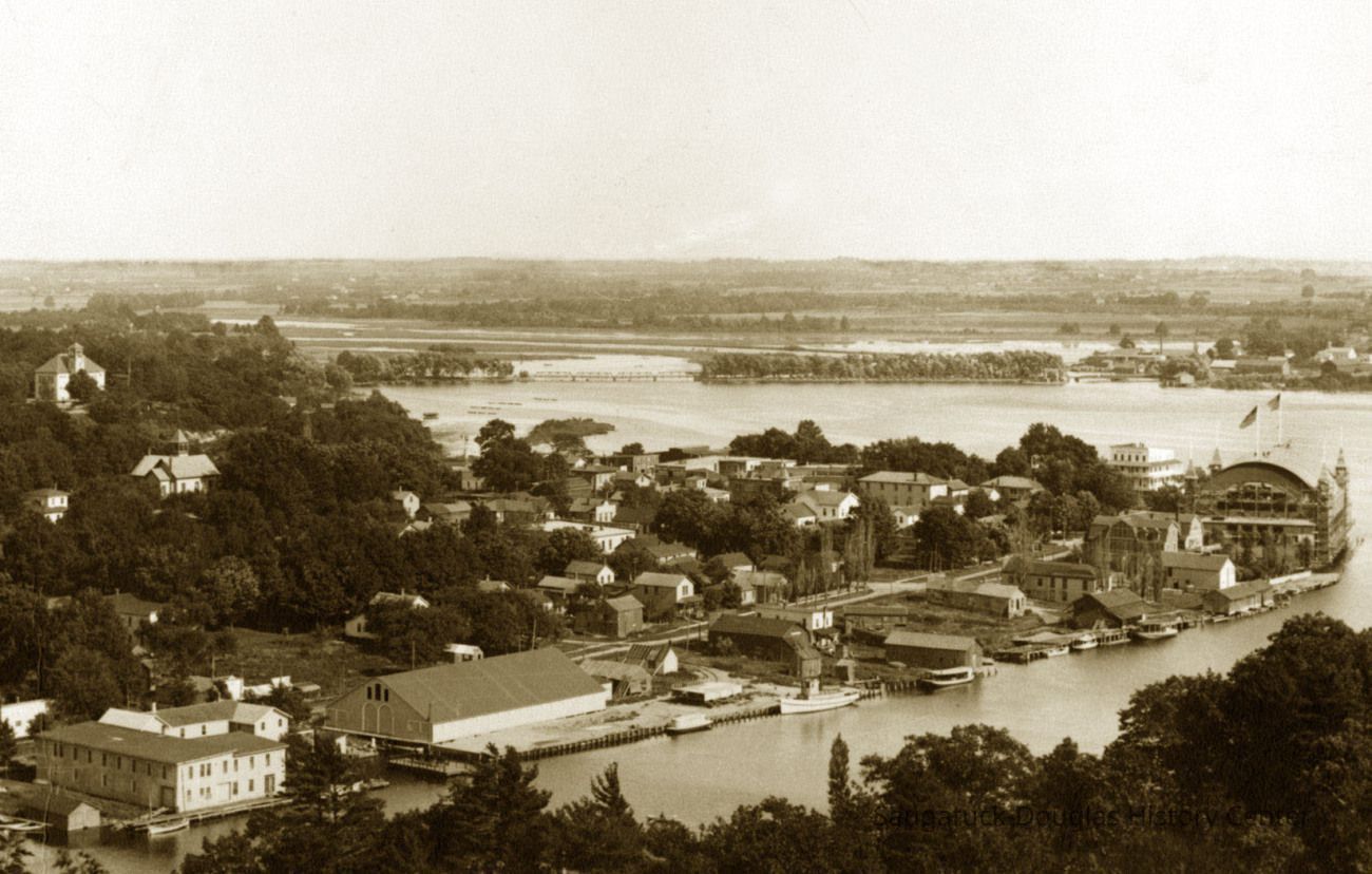 The photo shows the riverfront from the Saugatuck Boat Livery to Hotel Butler. Beyond the island between the bridges is visible.