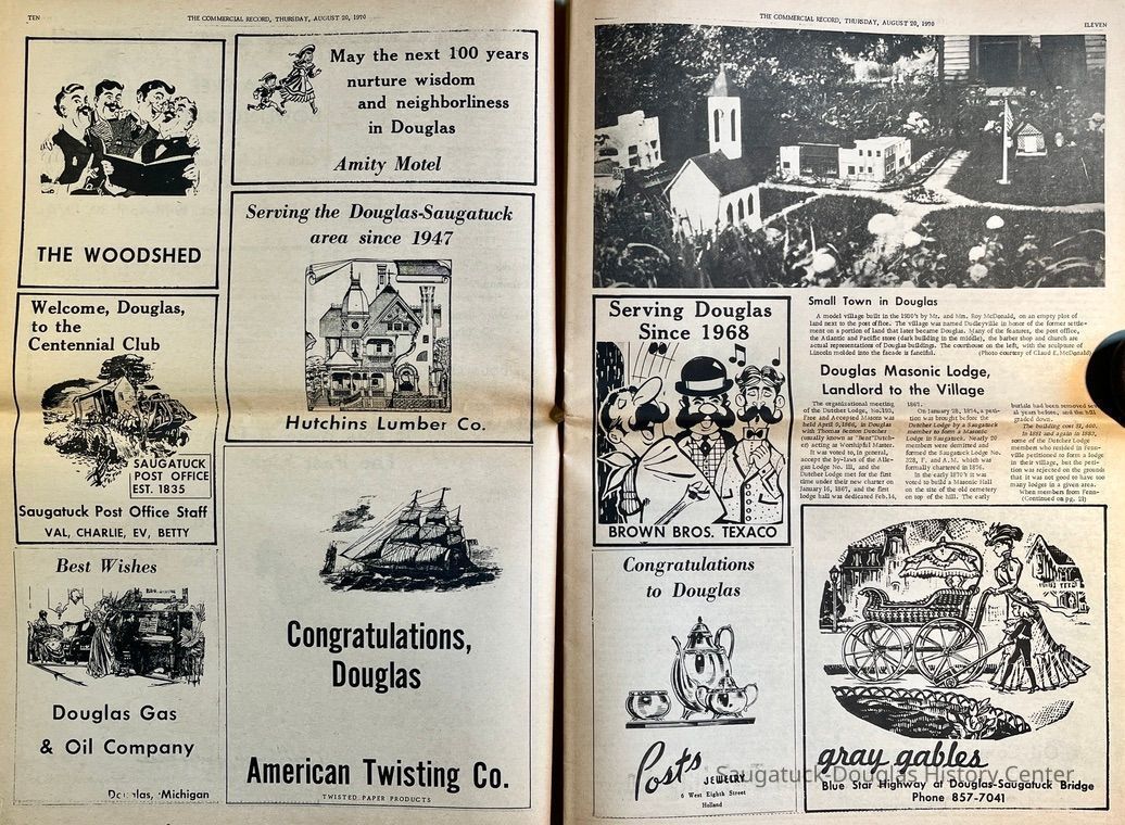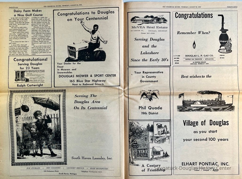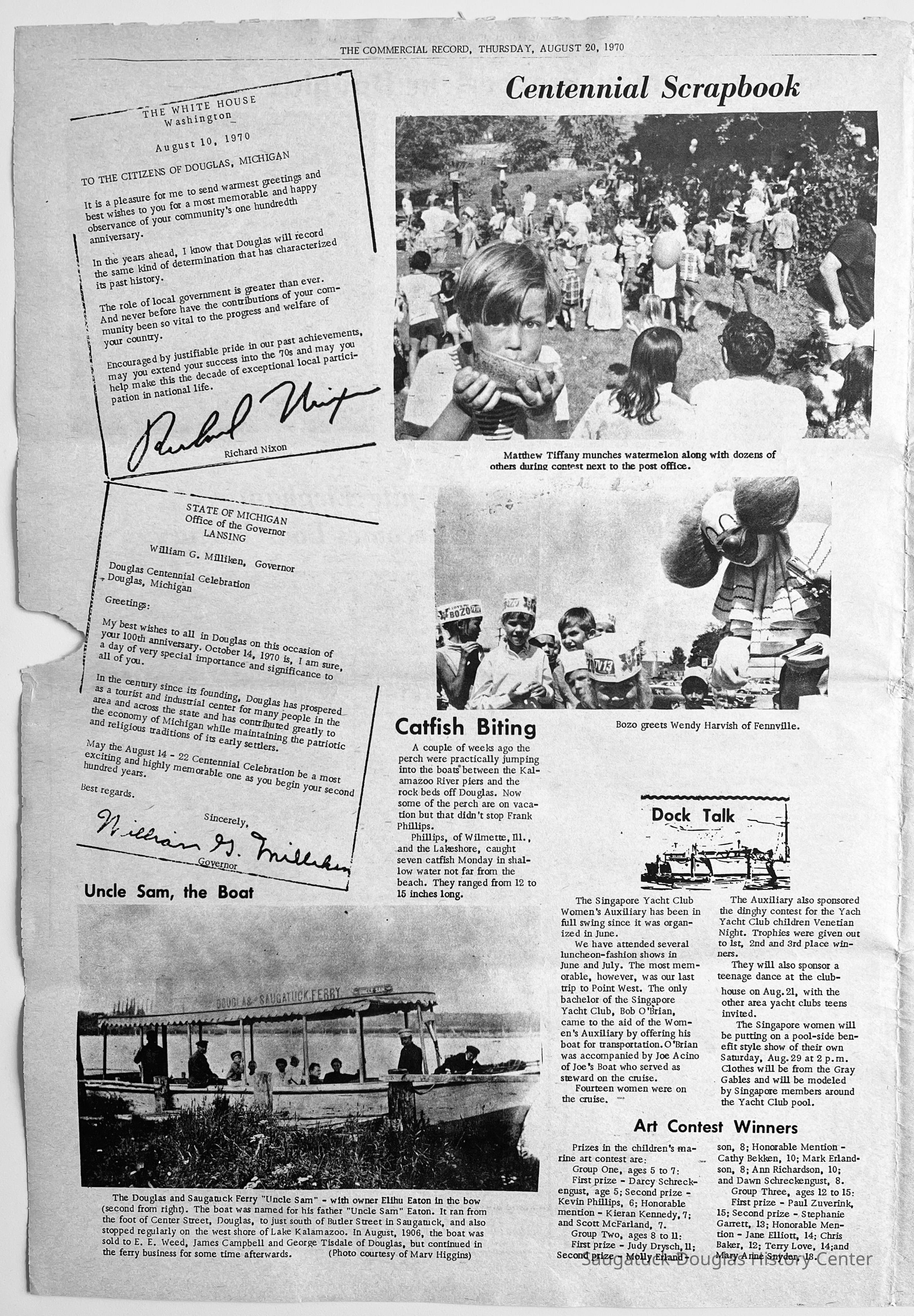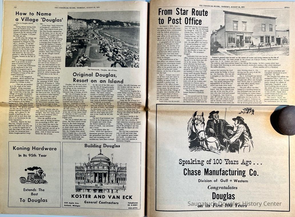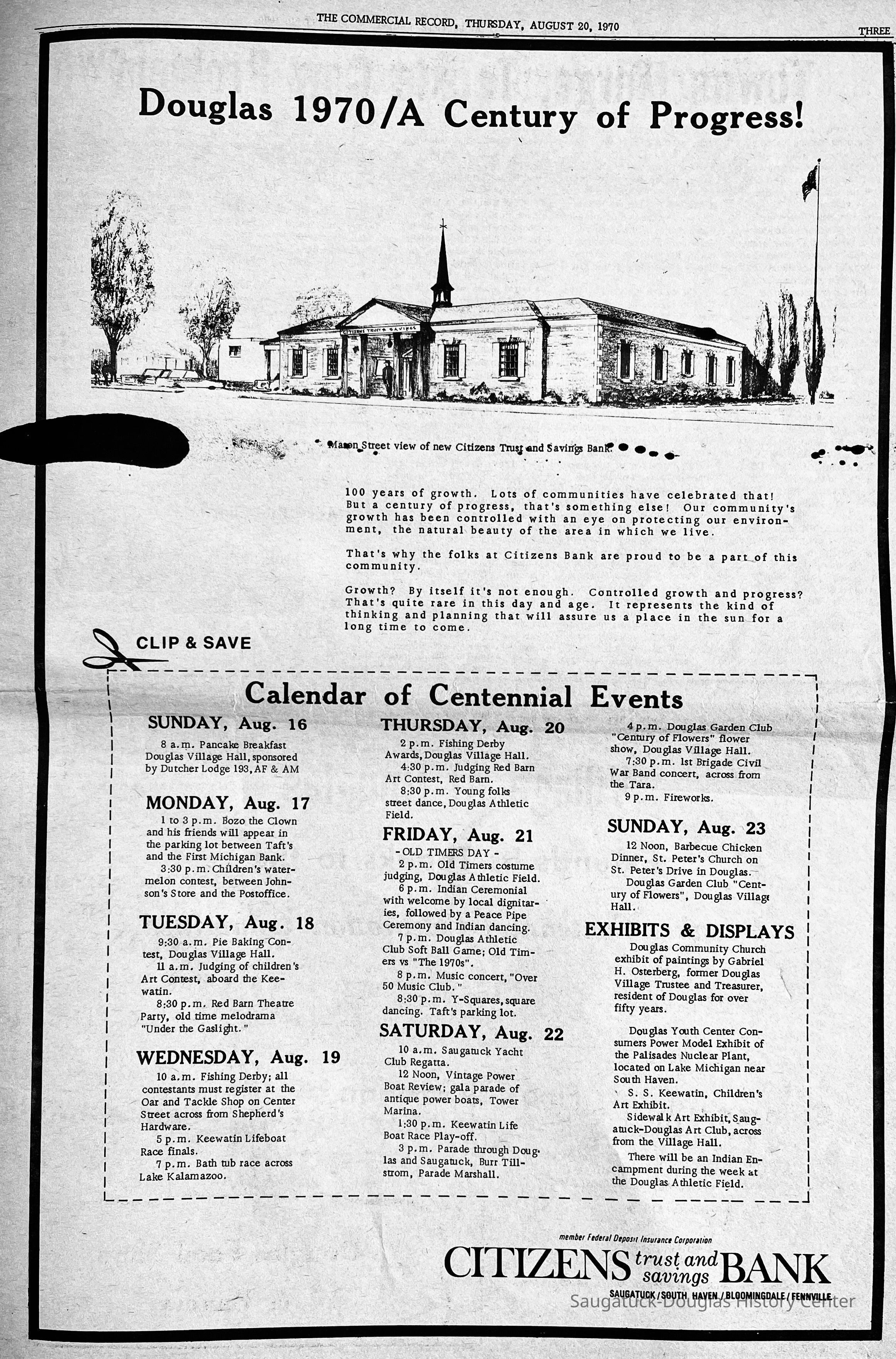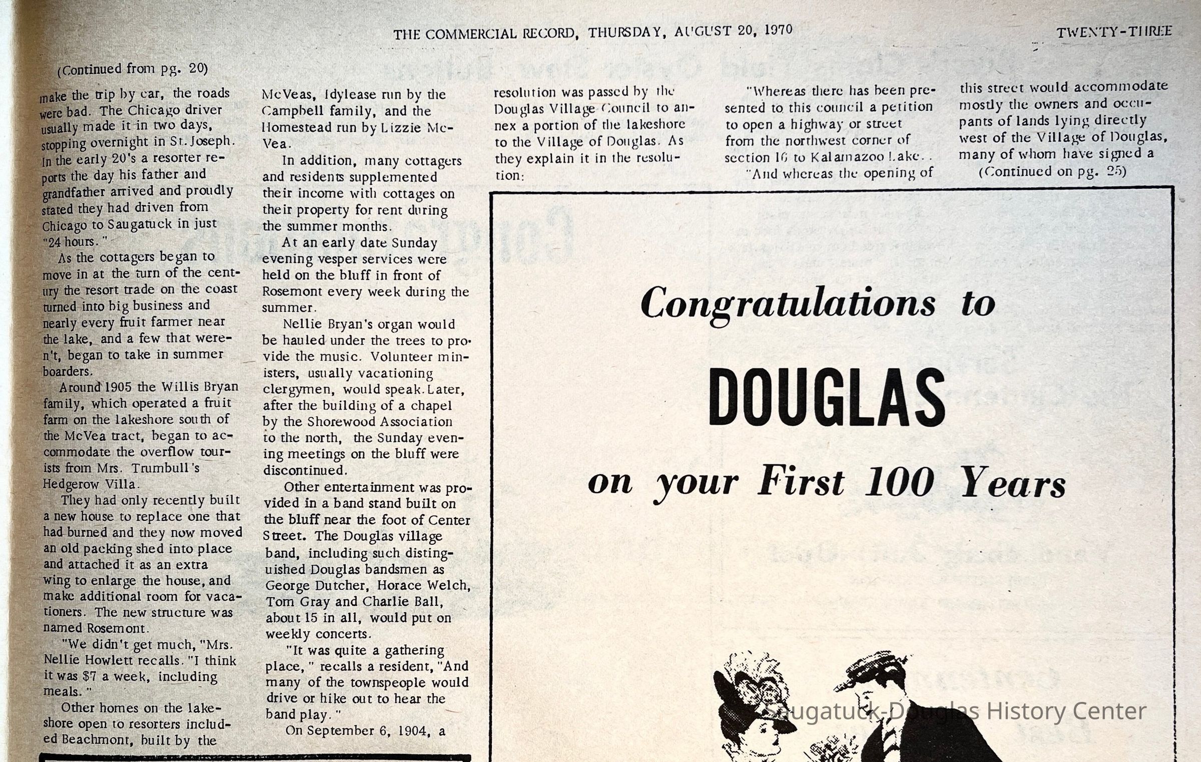 Printed in honor of the Douglas Village Centennial celebrations, Aug. 17-22, 1970