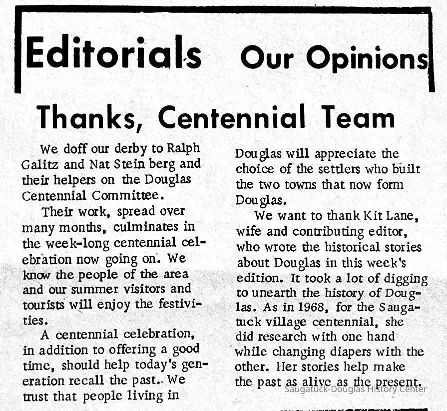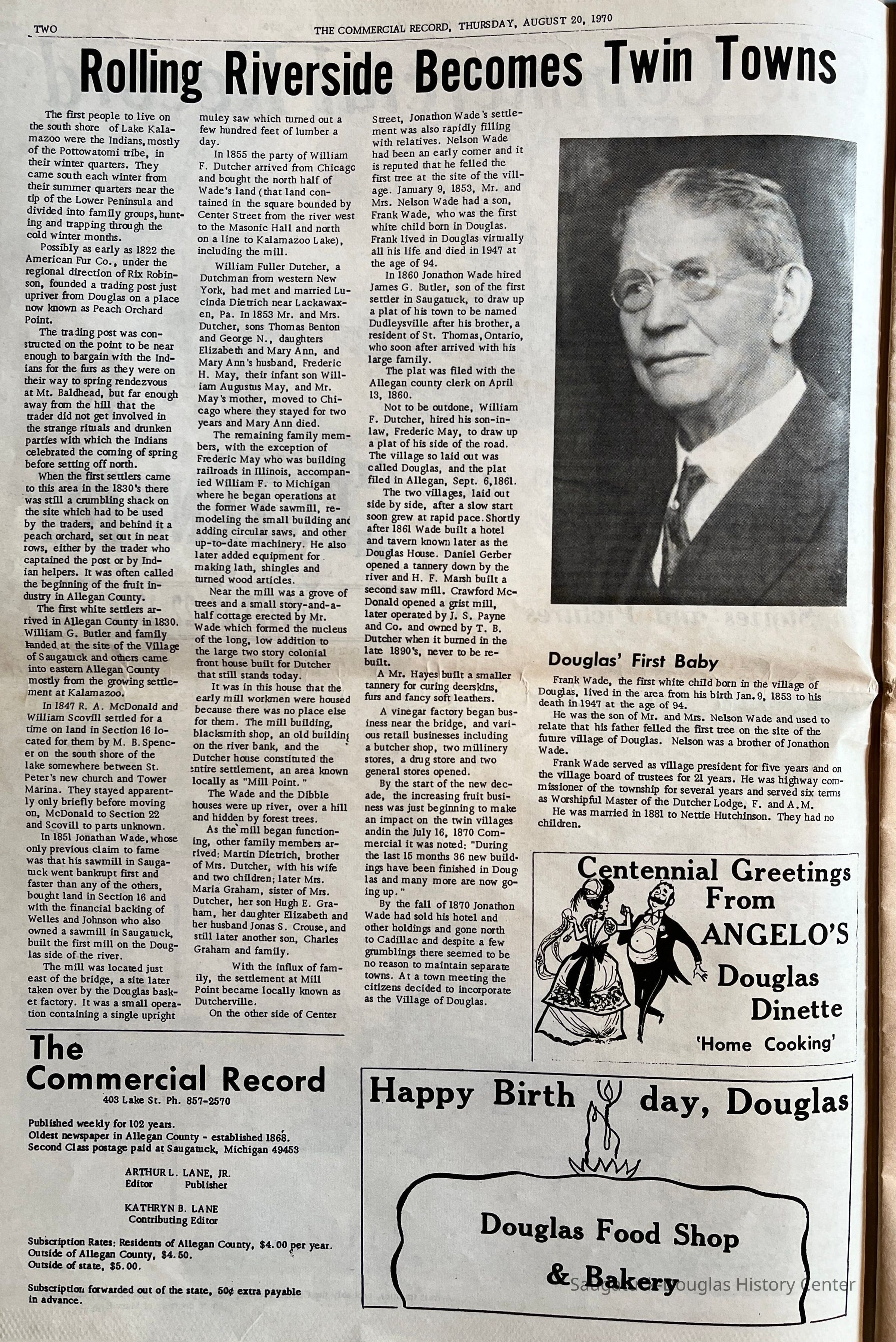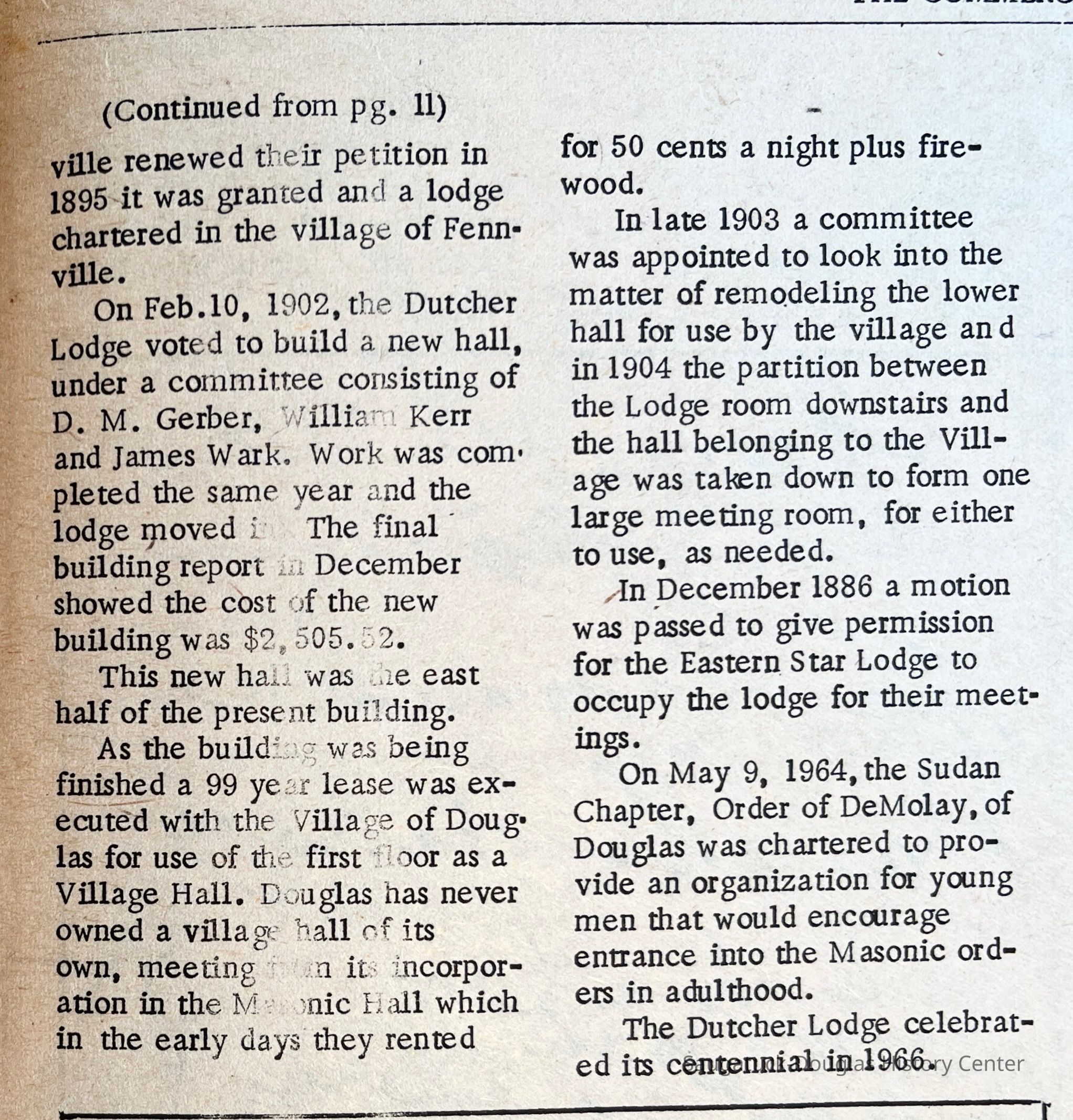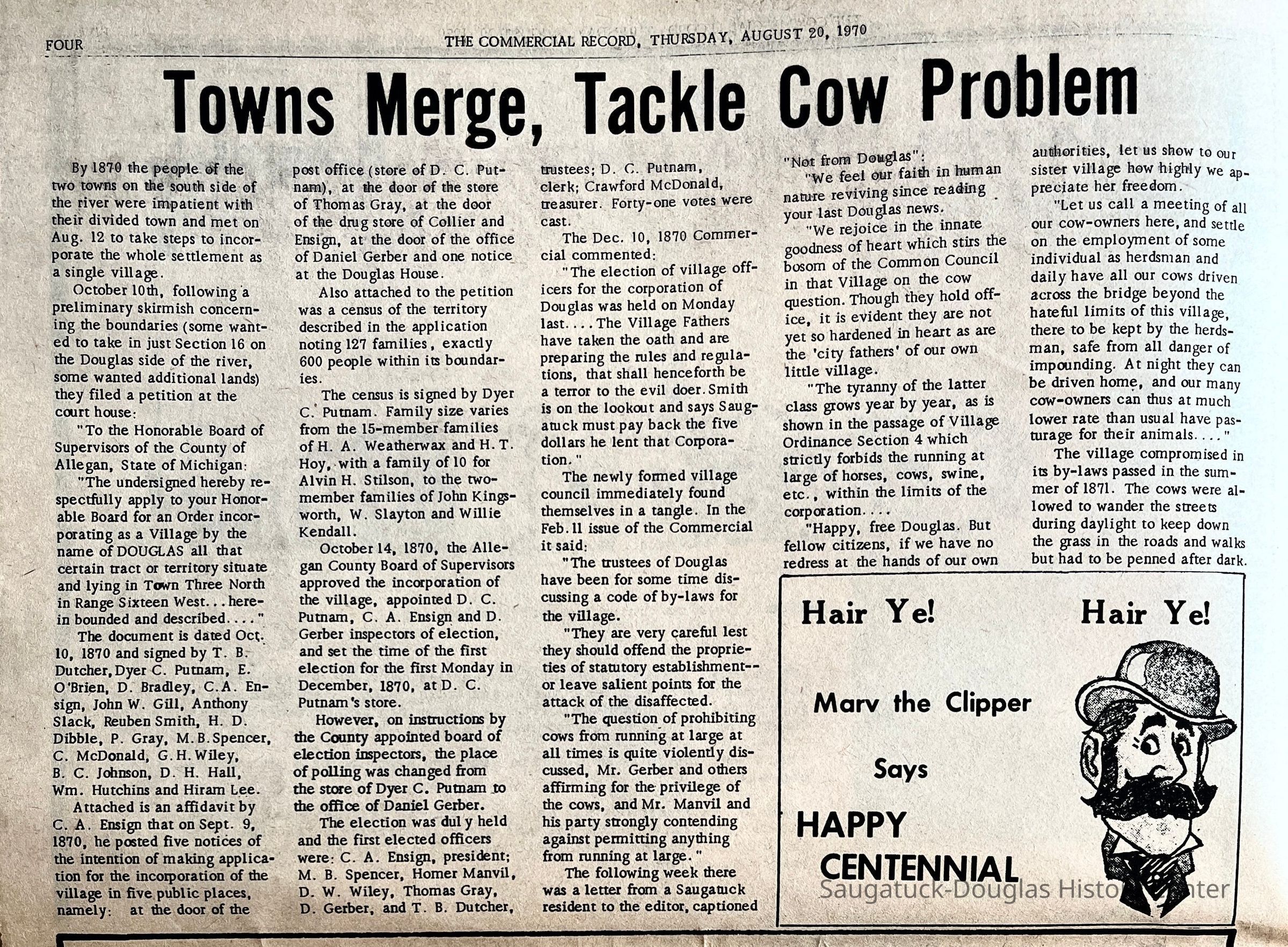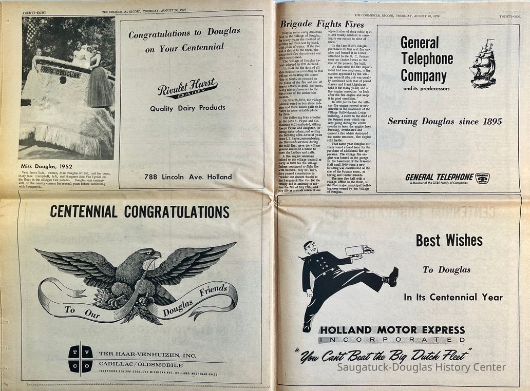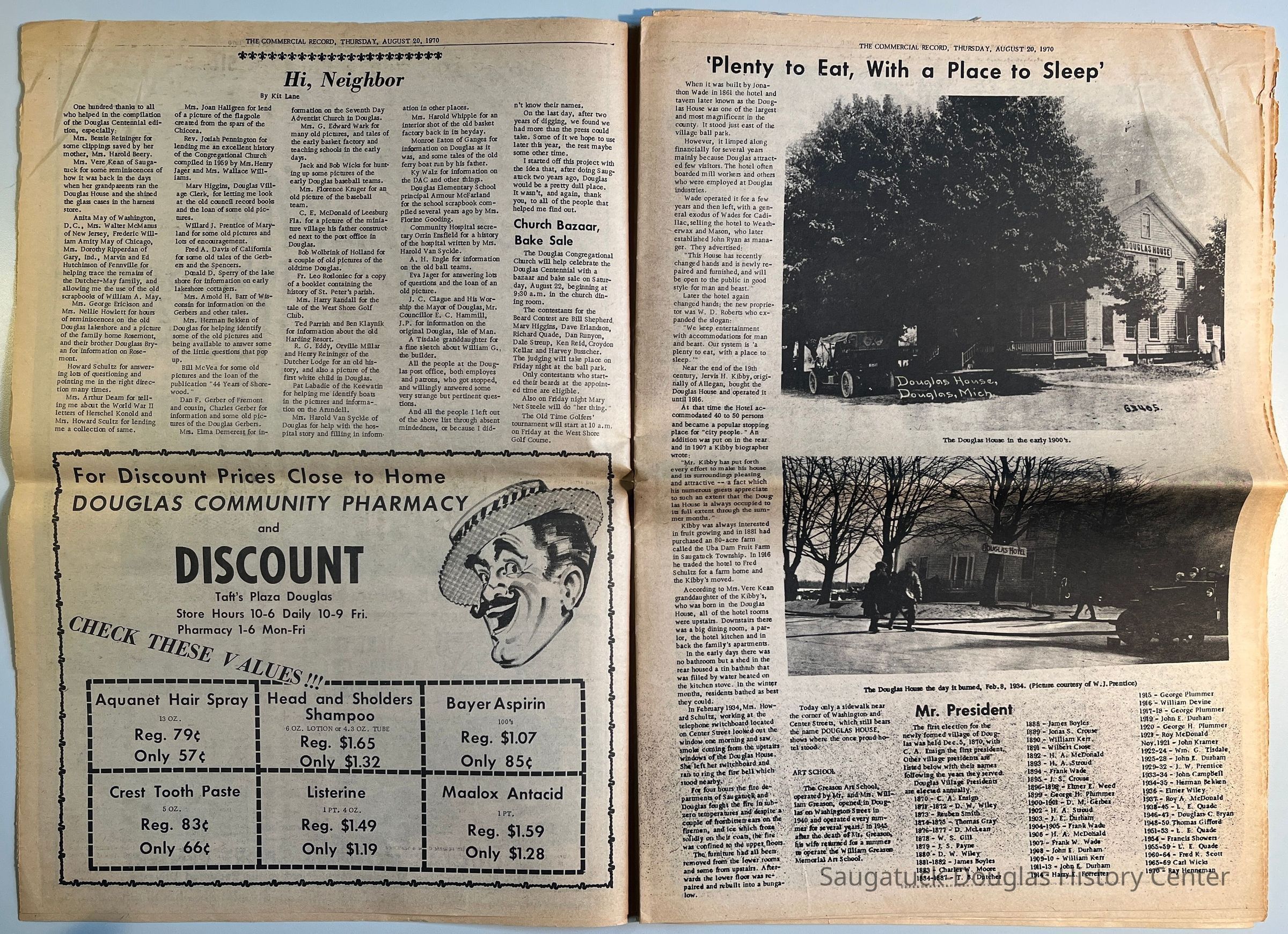 Printed in honor of the Douglas Village Centennial celebrations, Aug. 17-22, 1970