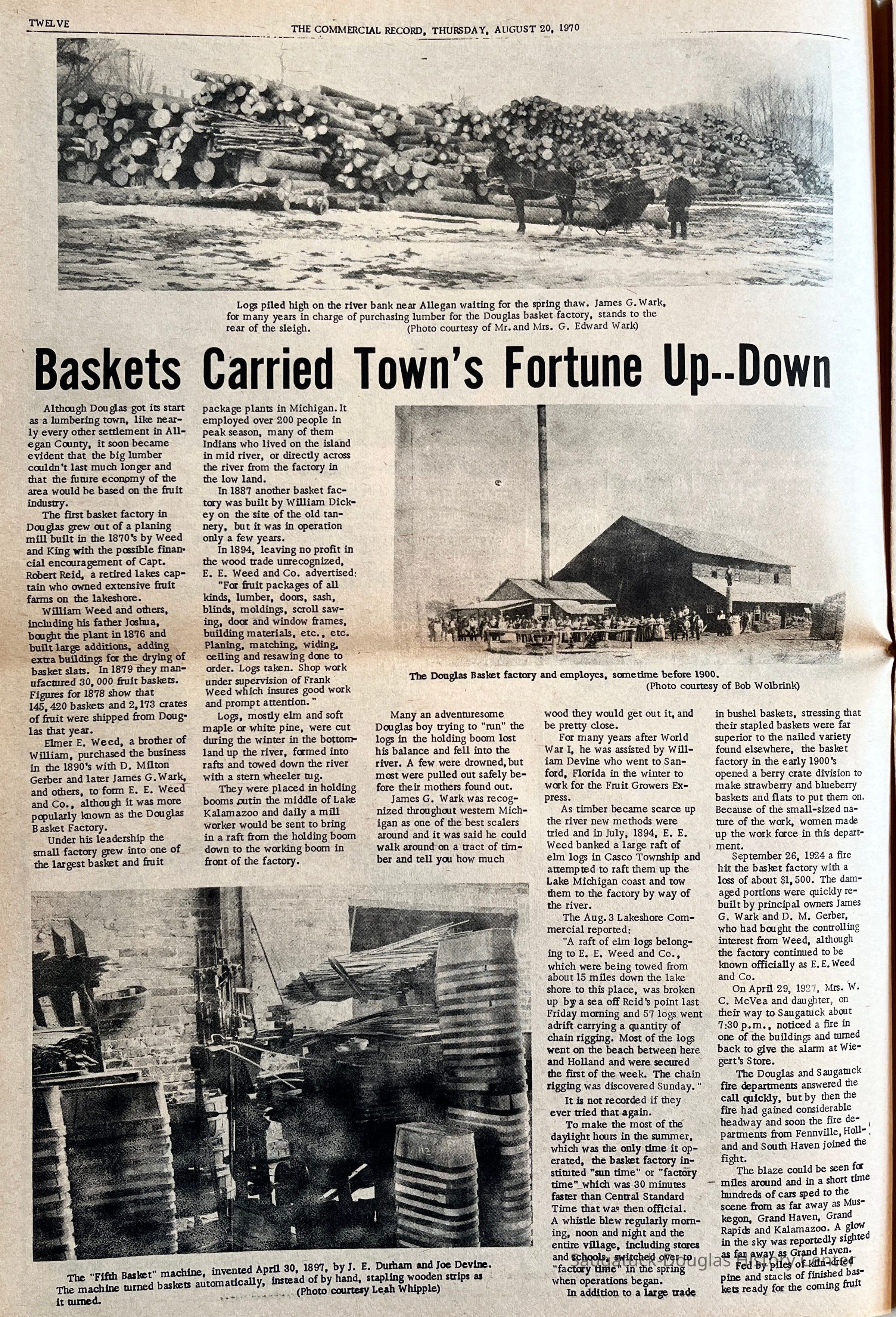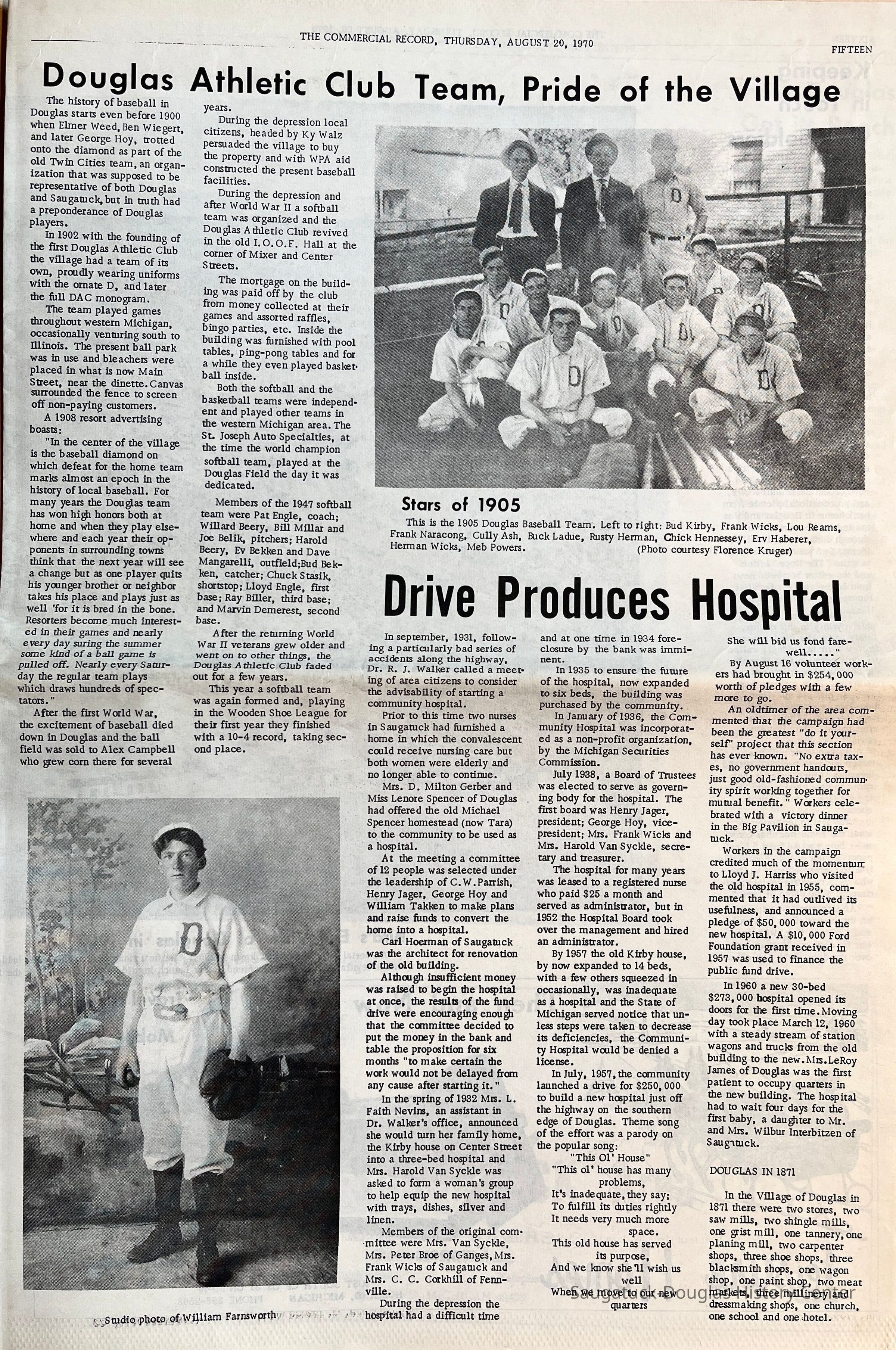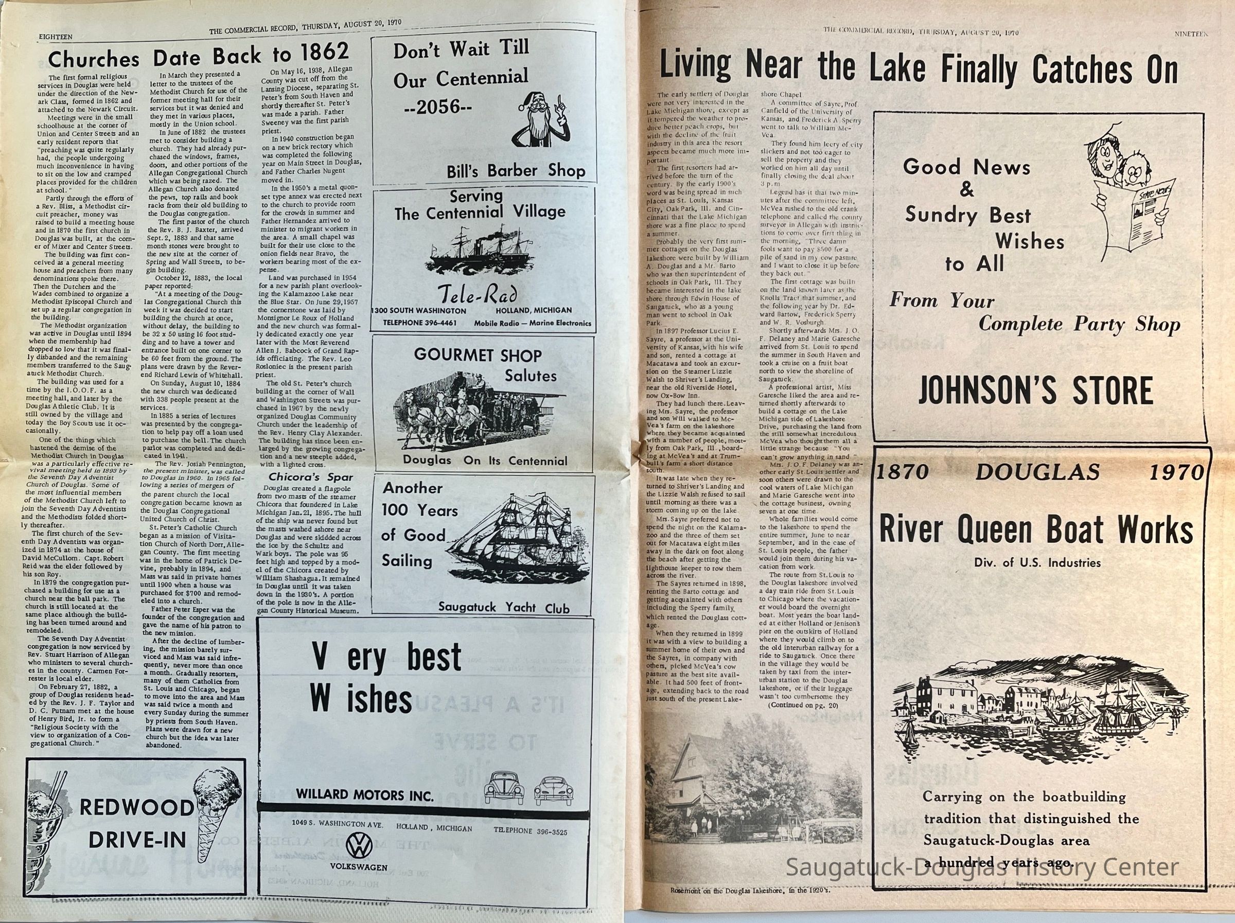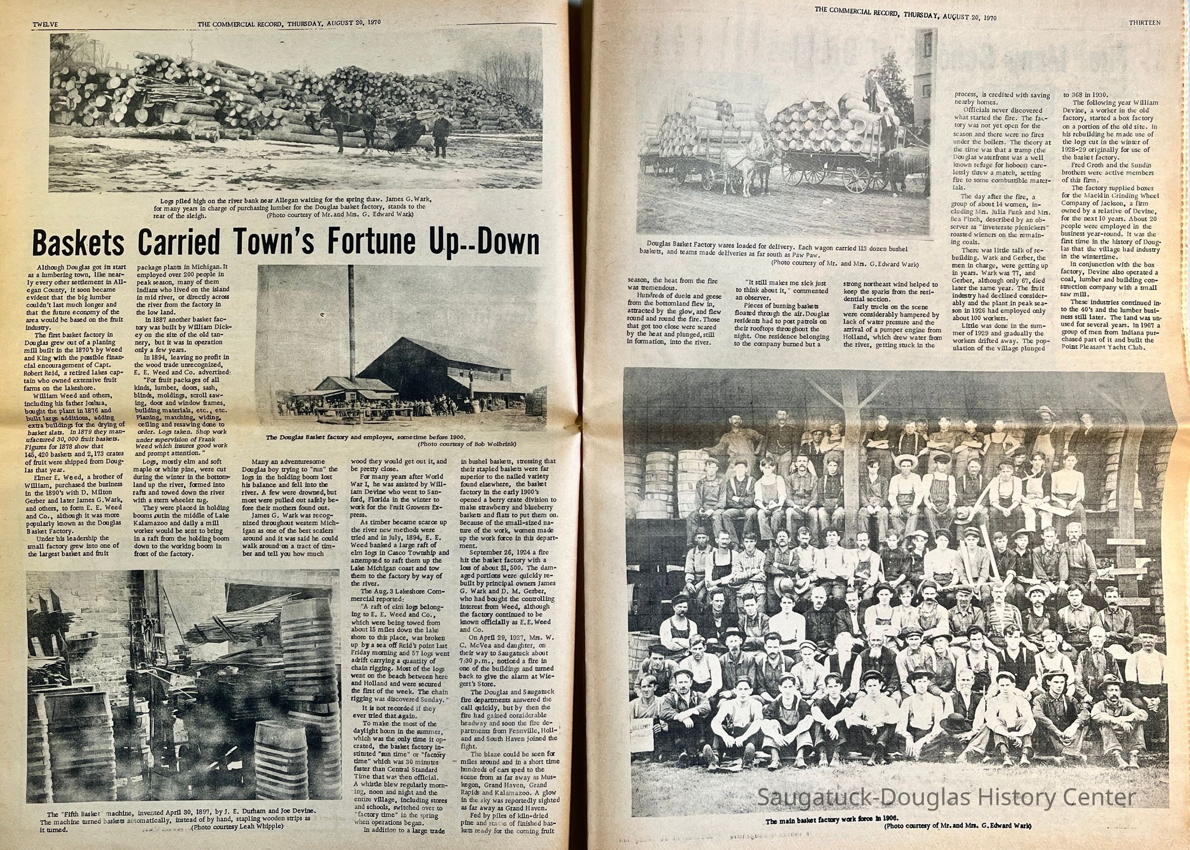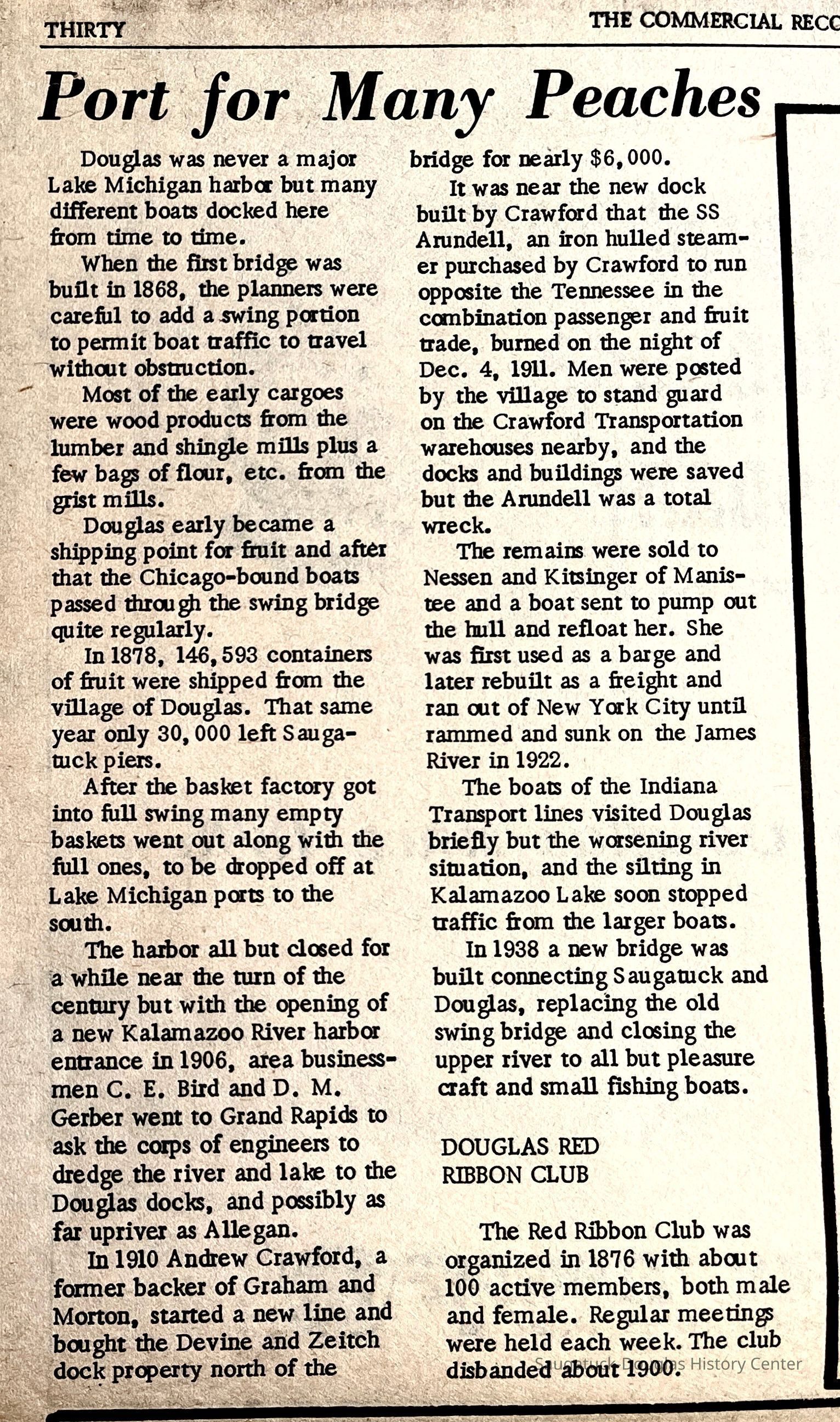 NewspapersDouglas, government1870 Fruit growing, farming, agricultureCommercial businessesTransportation: highway and road infrastructureTransporation: Rail - other than Interurban1875 Basket factoriesEducation and schoolsSports: baseballHospitals, medical care and doctorsMilitary, wars and veteransChurches and religion1880 Tourism steamship era -1930Sports: golfFires and fire departmentsClubs and social organizations1830 Settlement, pioneer era1900 Lakeshore community