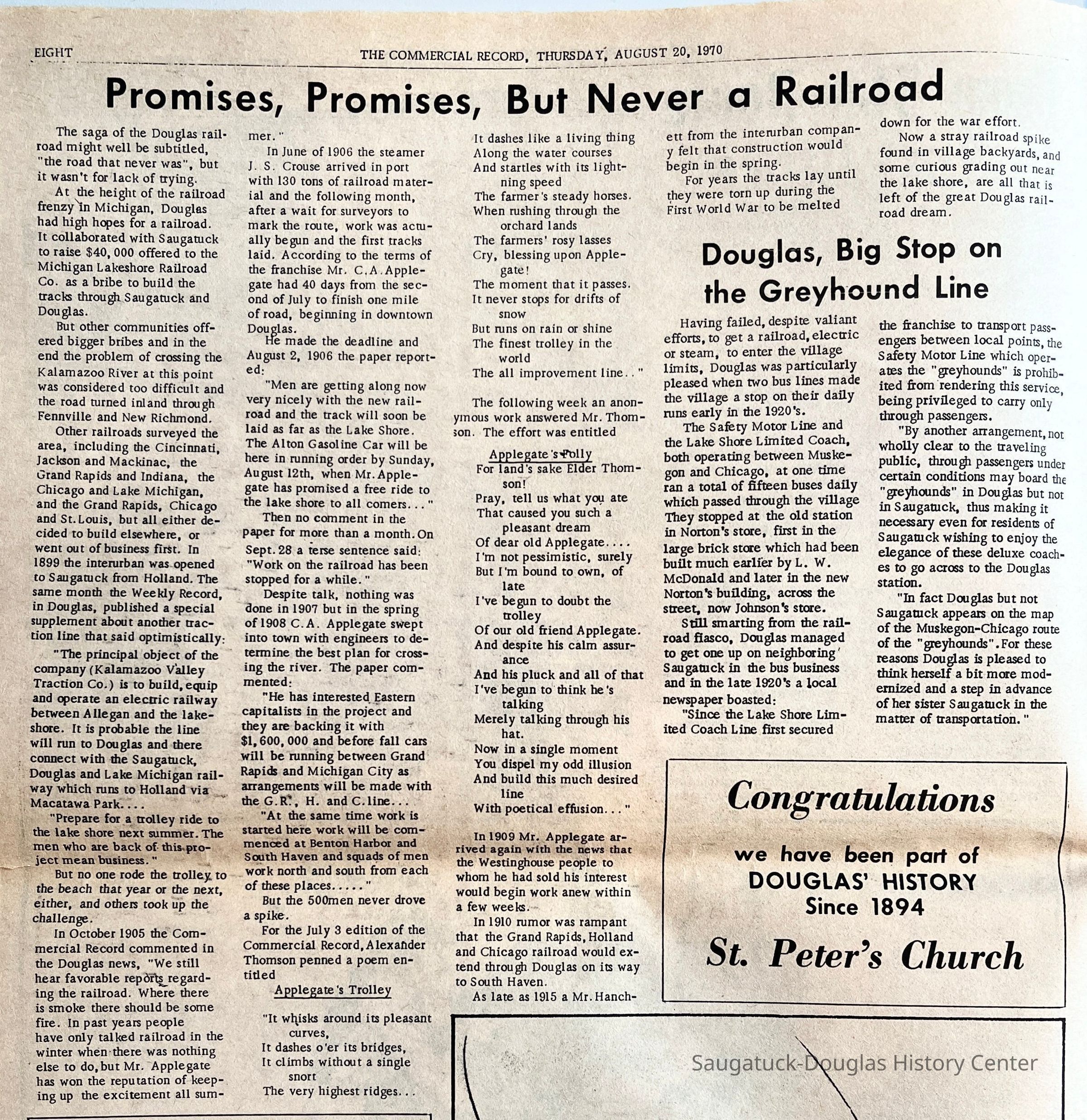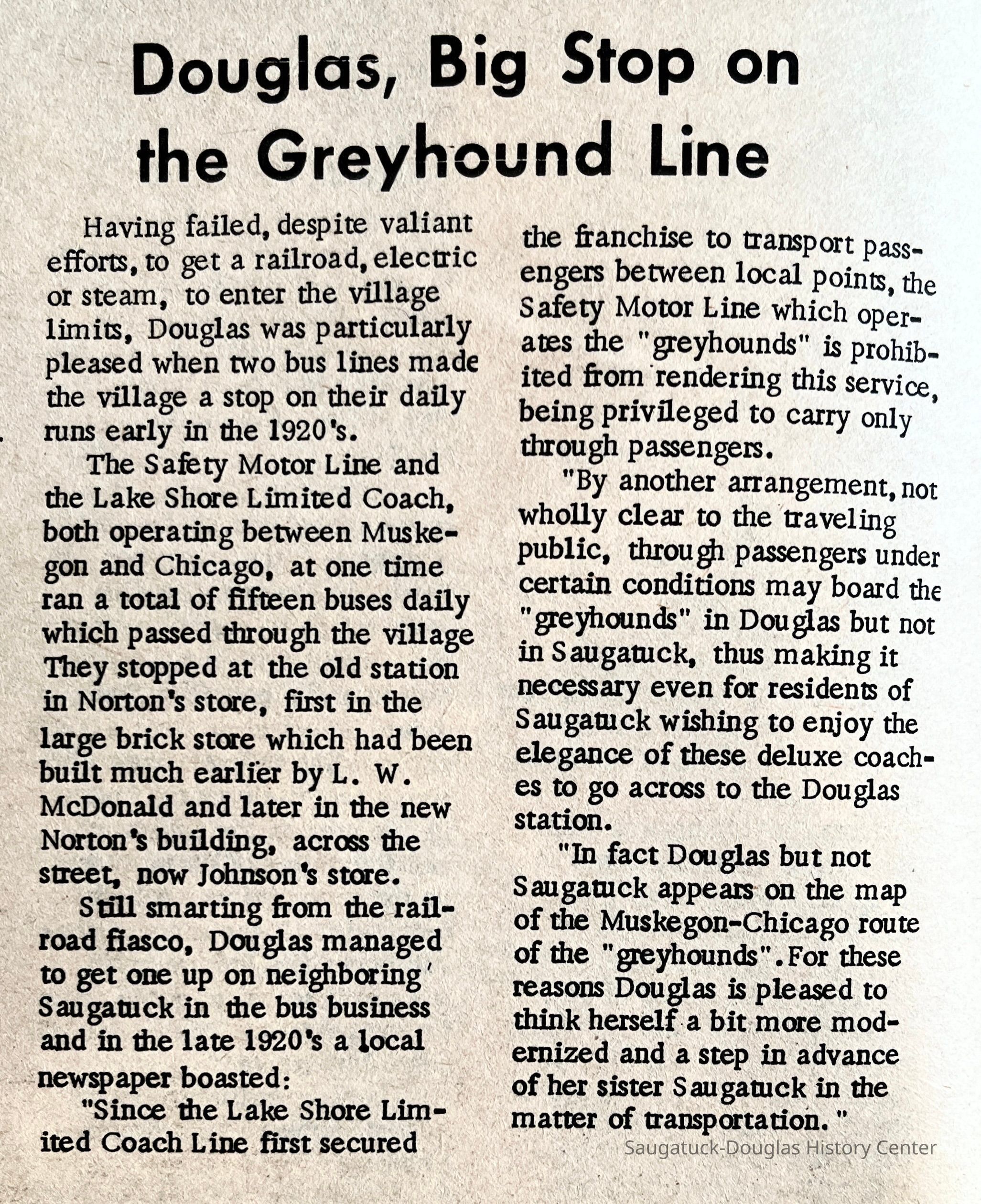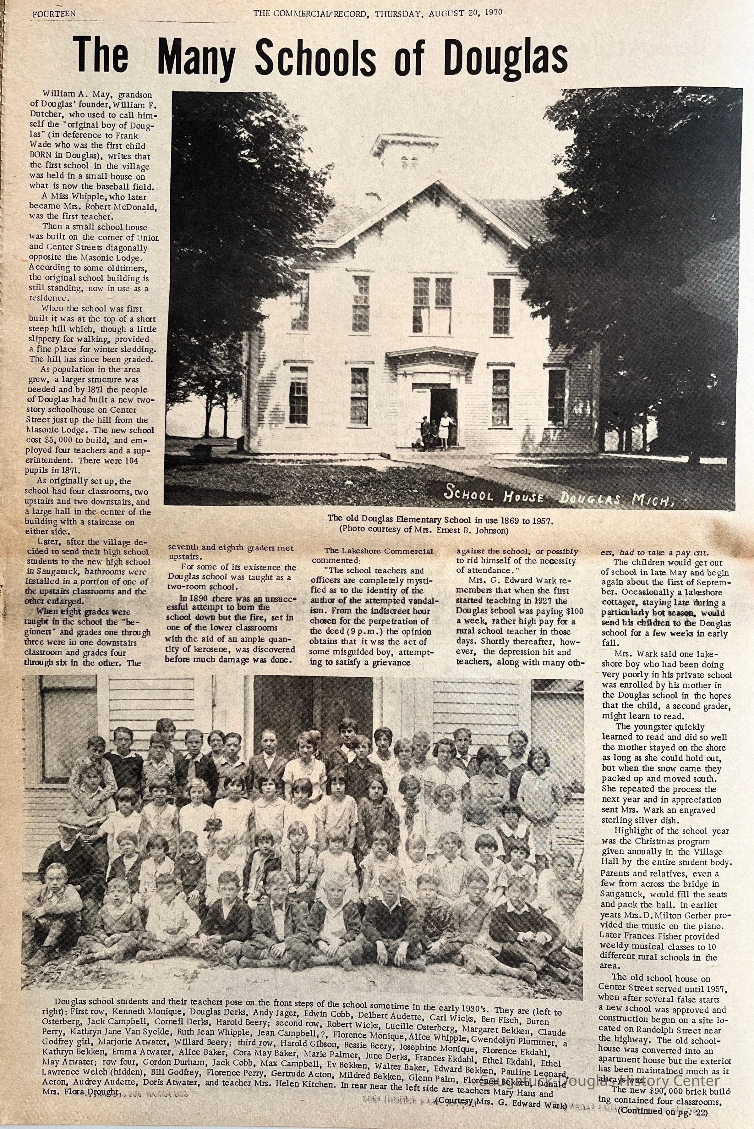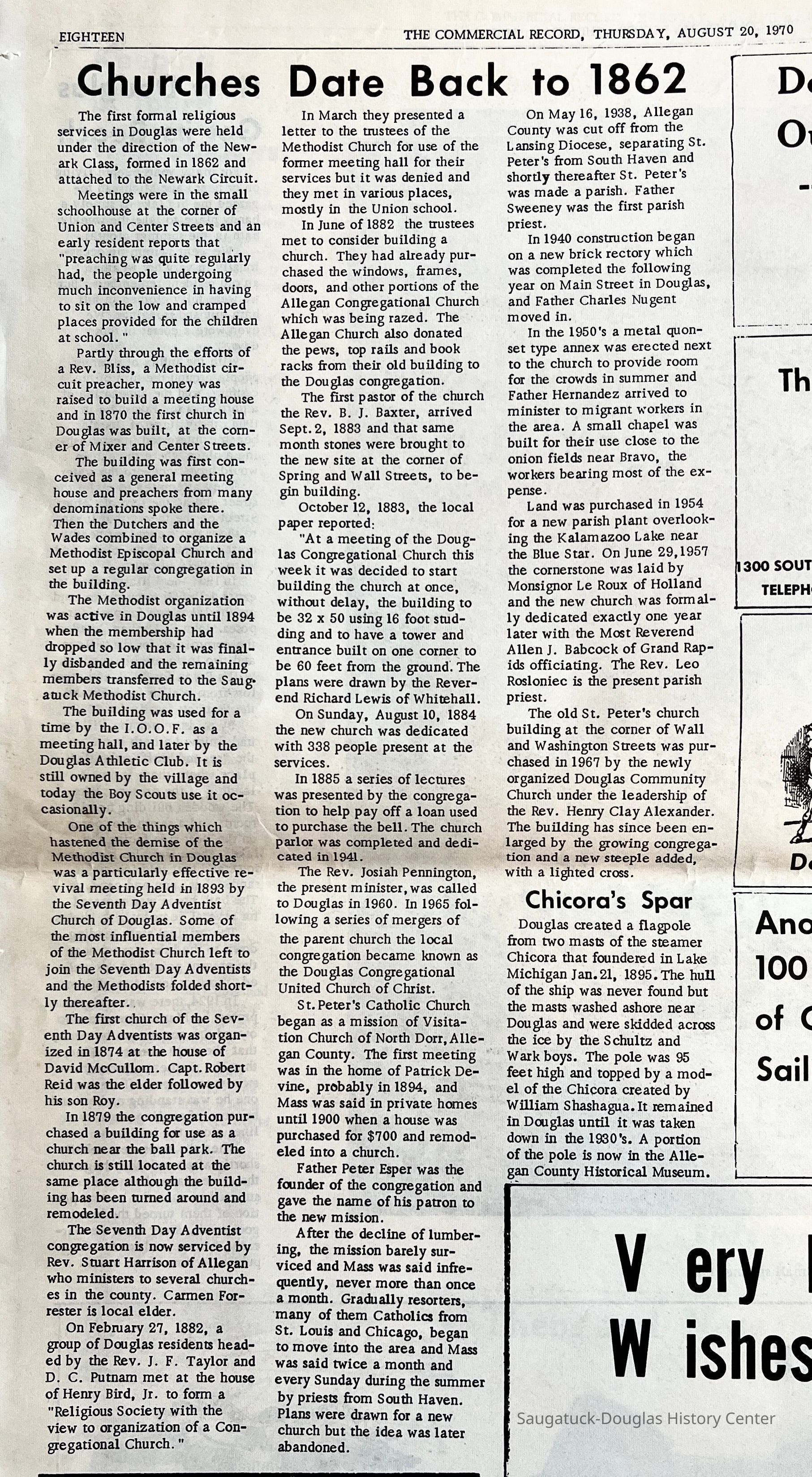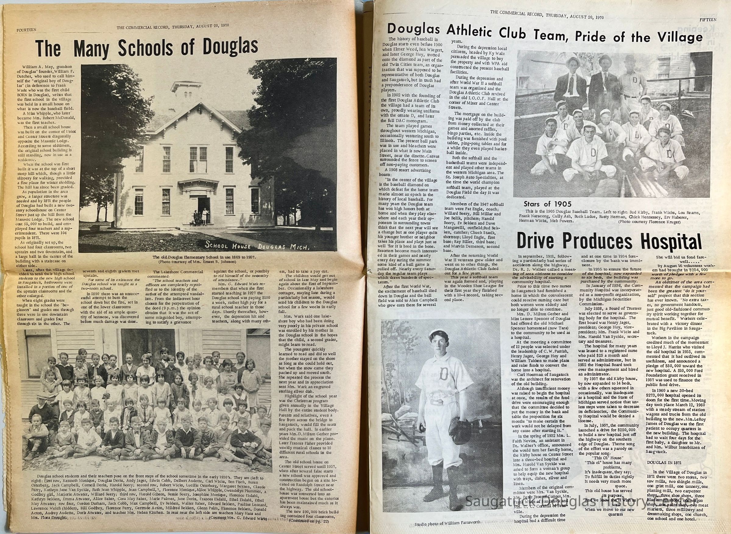 NewspapersDouglas, government1870 Fruit growing, farming, agricultureCommercial businessesTransportation: highway and road infrastructureTransporation: Rail - other than Interurban1875 Basket factoriesEducation and schoolsSports: baseballHospitals, medical care and doctorsMilitary, wars and veteransChurches and religion1880 Tourism steamship era -1930Sports: golfFires and fire departmentsClubs and social organizations1830 Settlement, pioneer era1900 Lakeshore community