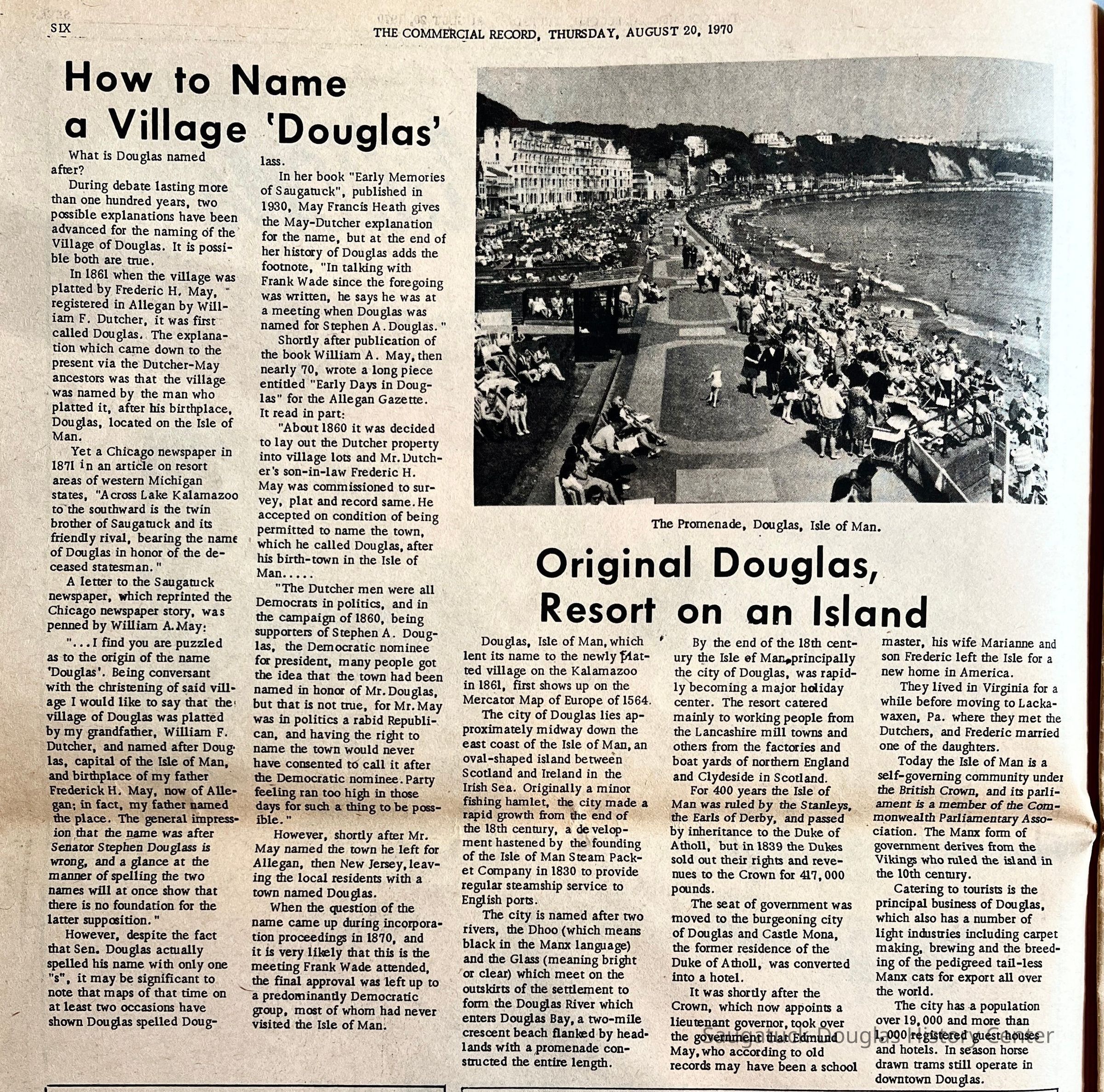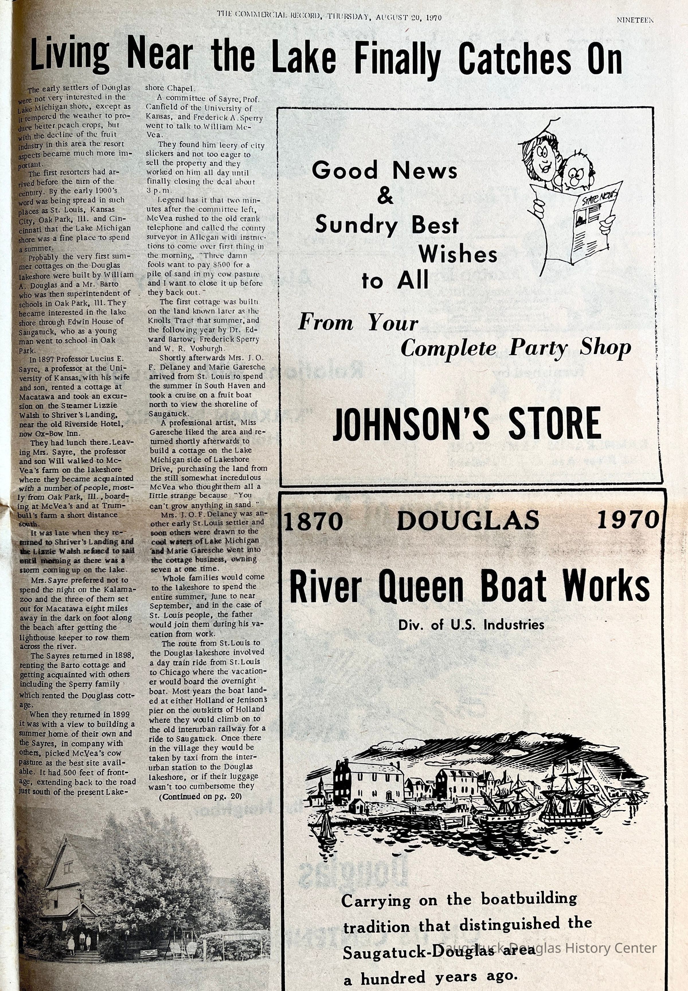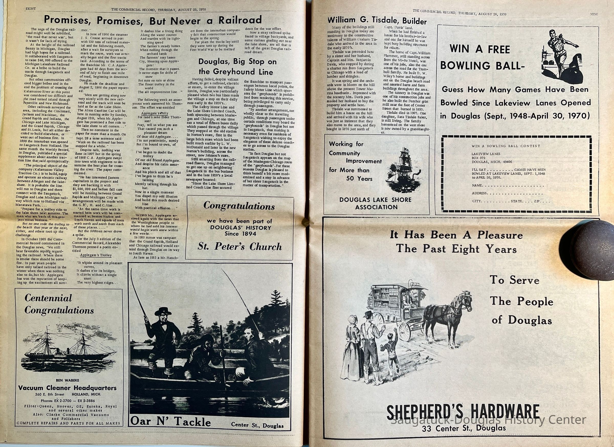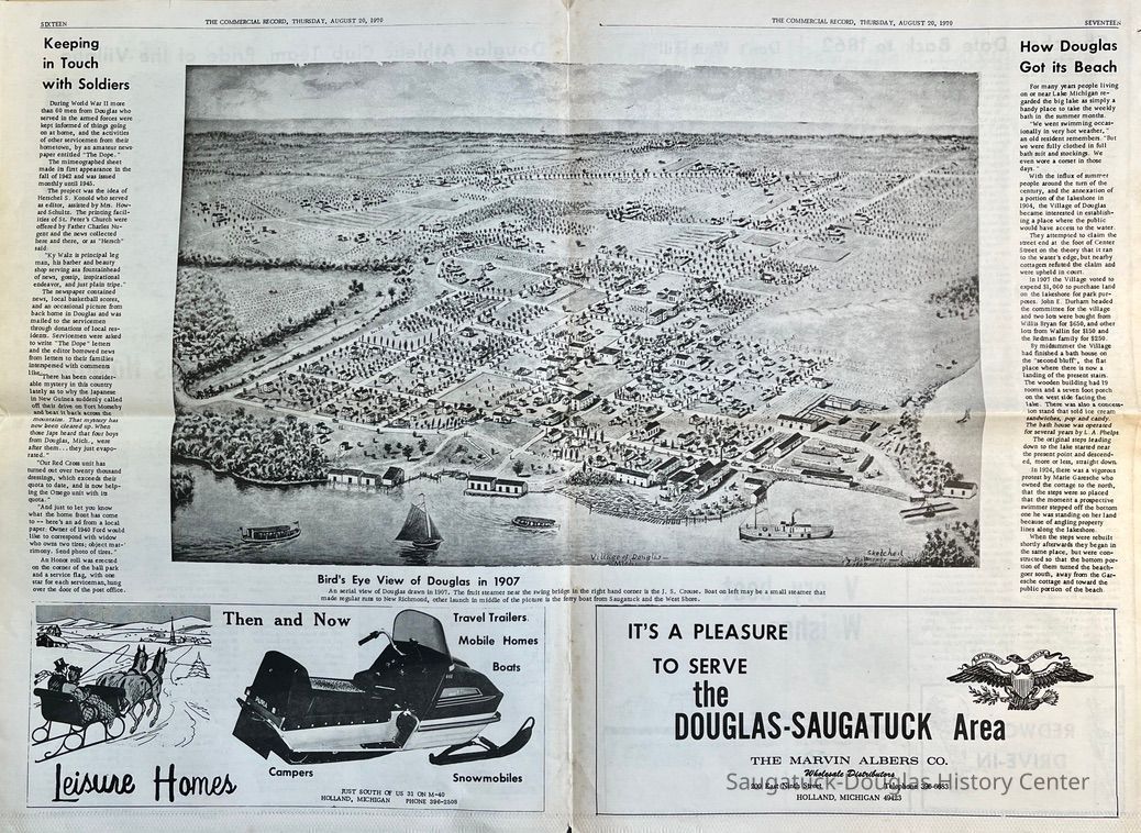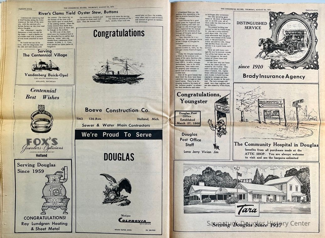 NewspapersDouglas, government1870 Fruit growing, farming, agricultureCommercial businessesTransportation: highway and road infrastructureTransporation: Rail - other than Interurban1875 Basket factoriesEducation and schoolsSports: baseballHospitals, medical care and doctorsMilitary, wars and veteransChurches and religion1880 Tourism steamship era -1930Sports: golfFires and fire departmentsClubs and social organizations1830 Settlement, pioneer era1900 Lakeshore community