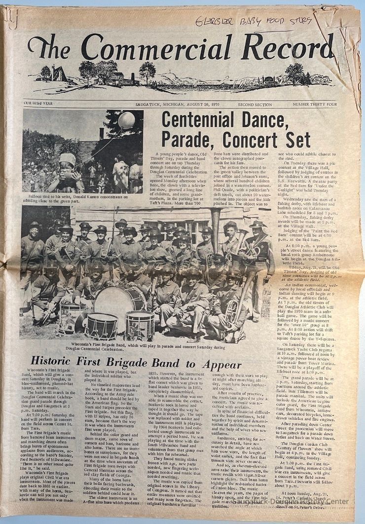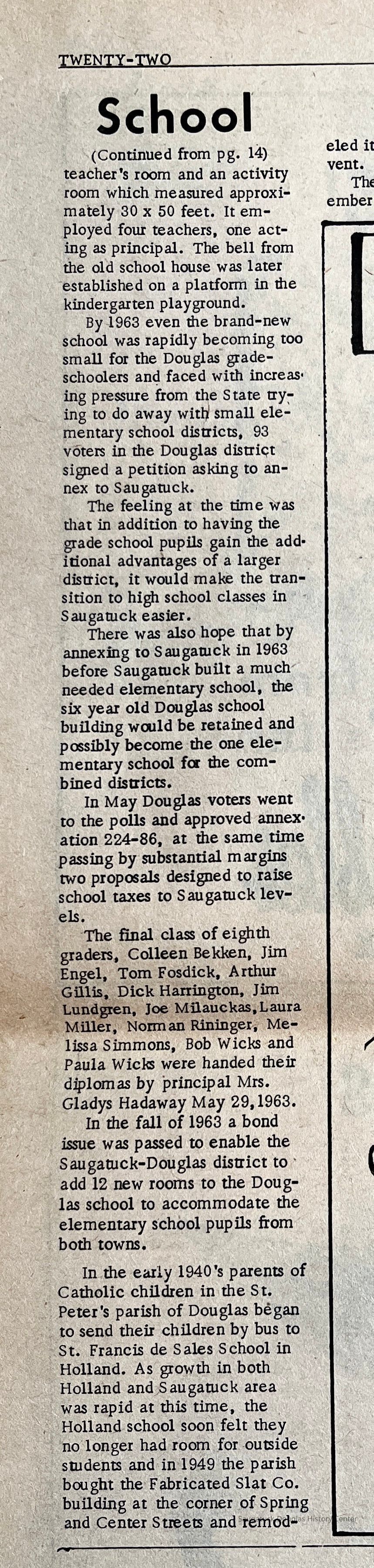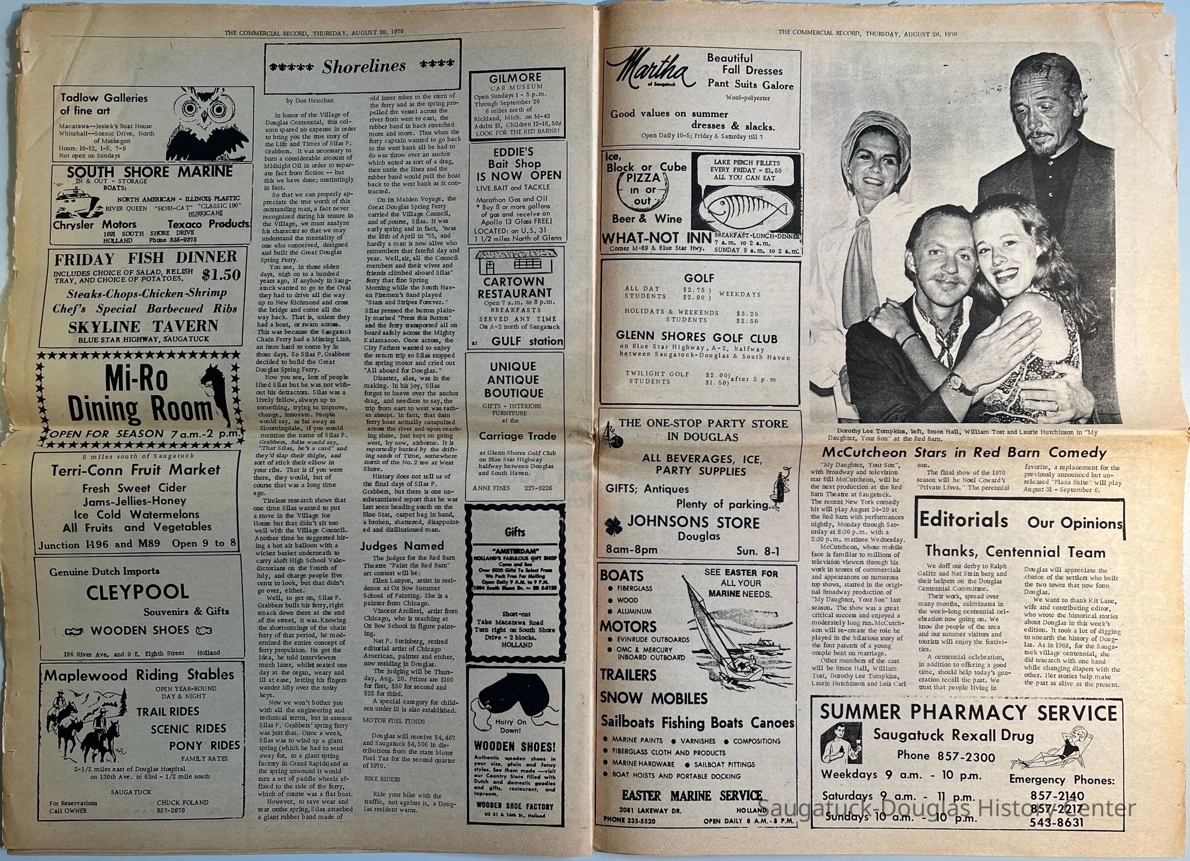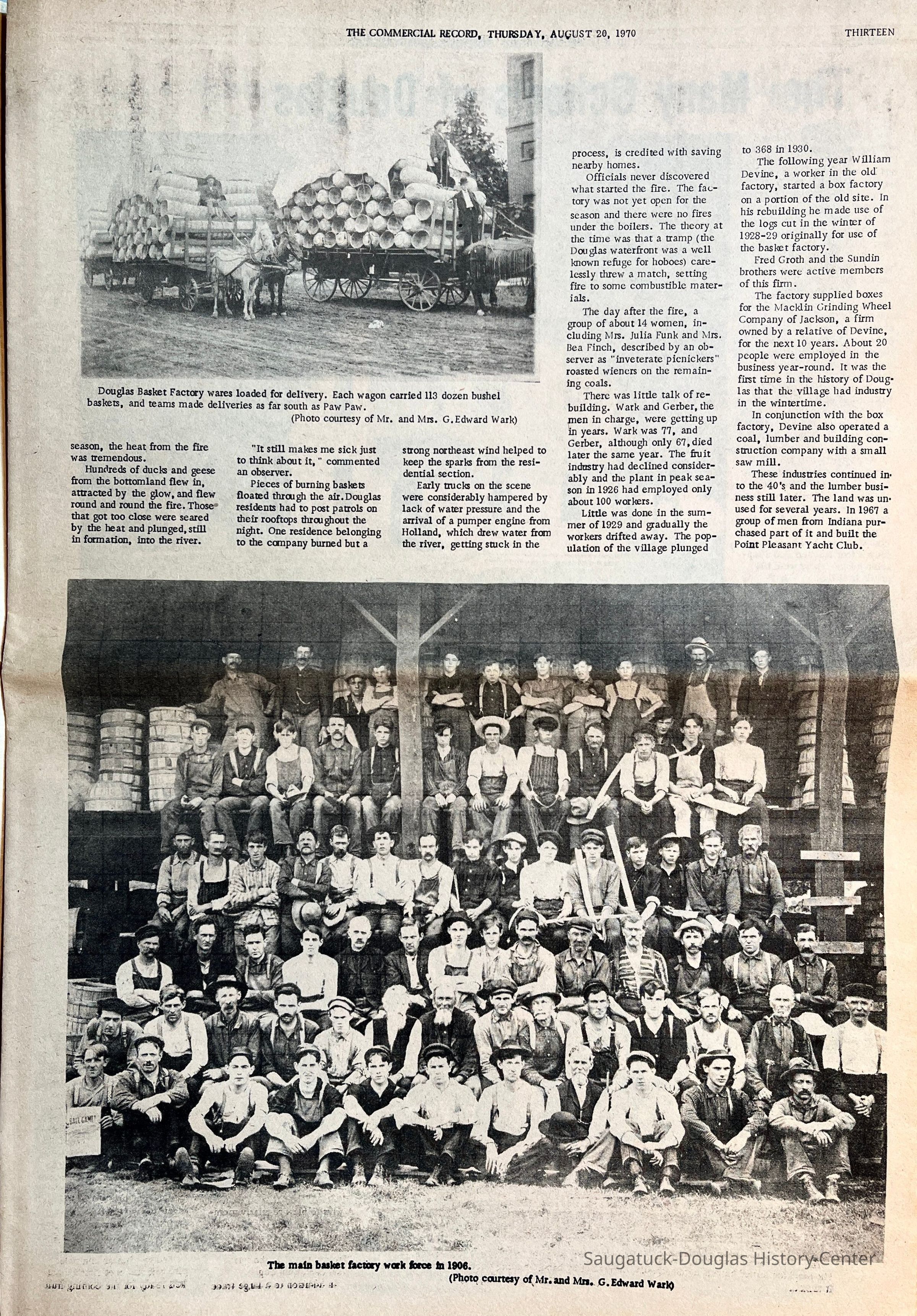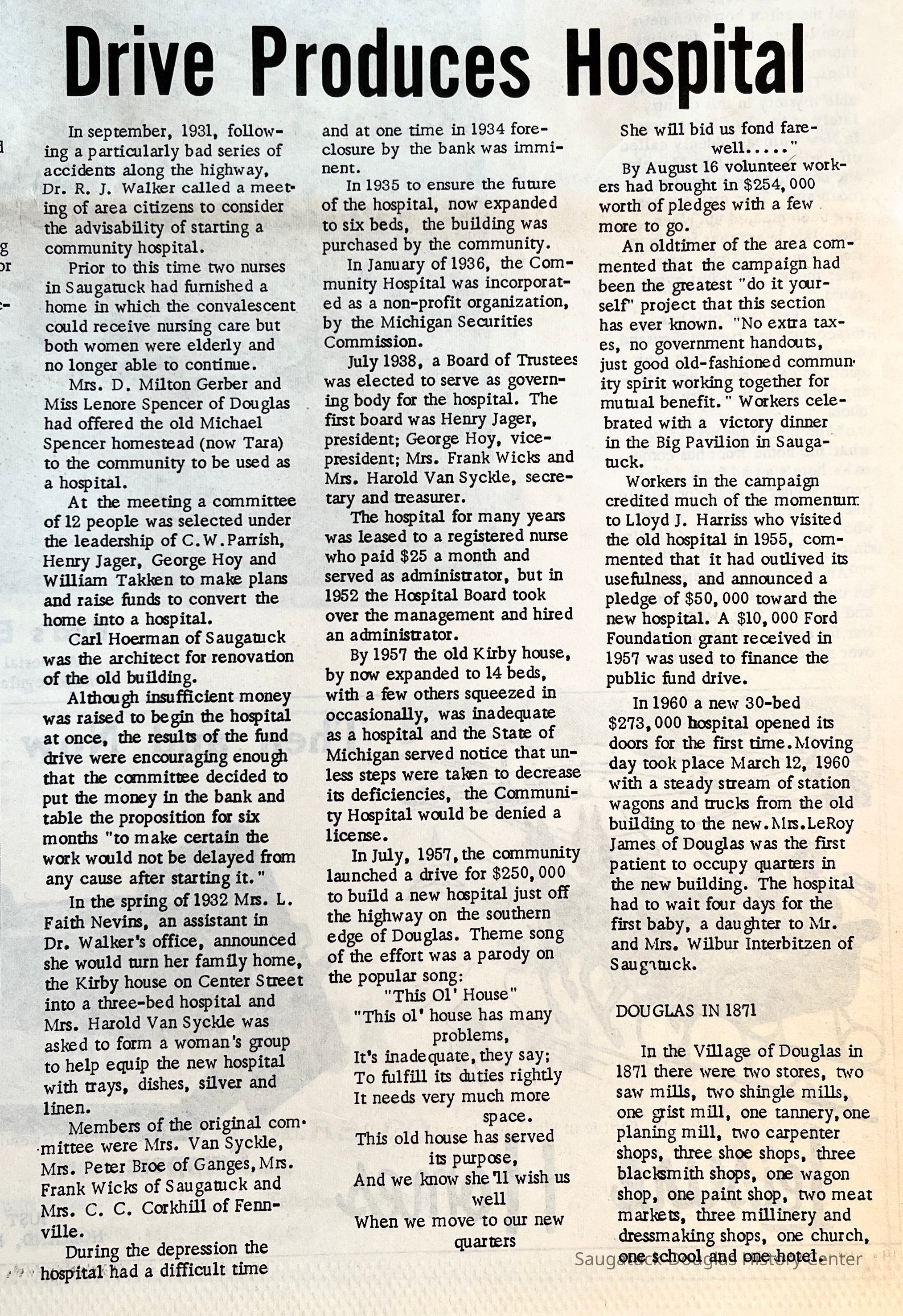 NewspapersDouglas, government1870 Fruit growing, farming, agricultureCommercial businessesTransportation: highway and road infrastructureTransporation: Rail - other than Interurban1875 Basket factoriesEducation and schoolsSports: baseballHospitals, medical care and doctorsMilitary, wars and veteransChurches and religion1880 Tourism steamship era -1930Sports: golfFires and fire departmentsClubs and social organizations1830 Settlement, pioneer era1900 Lakeshore community