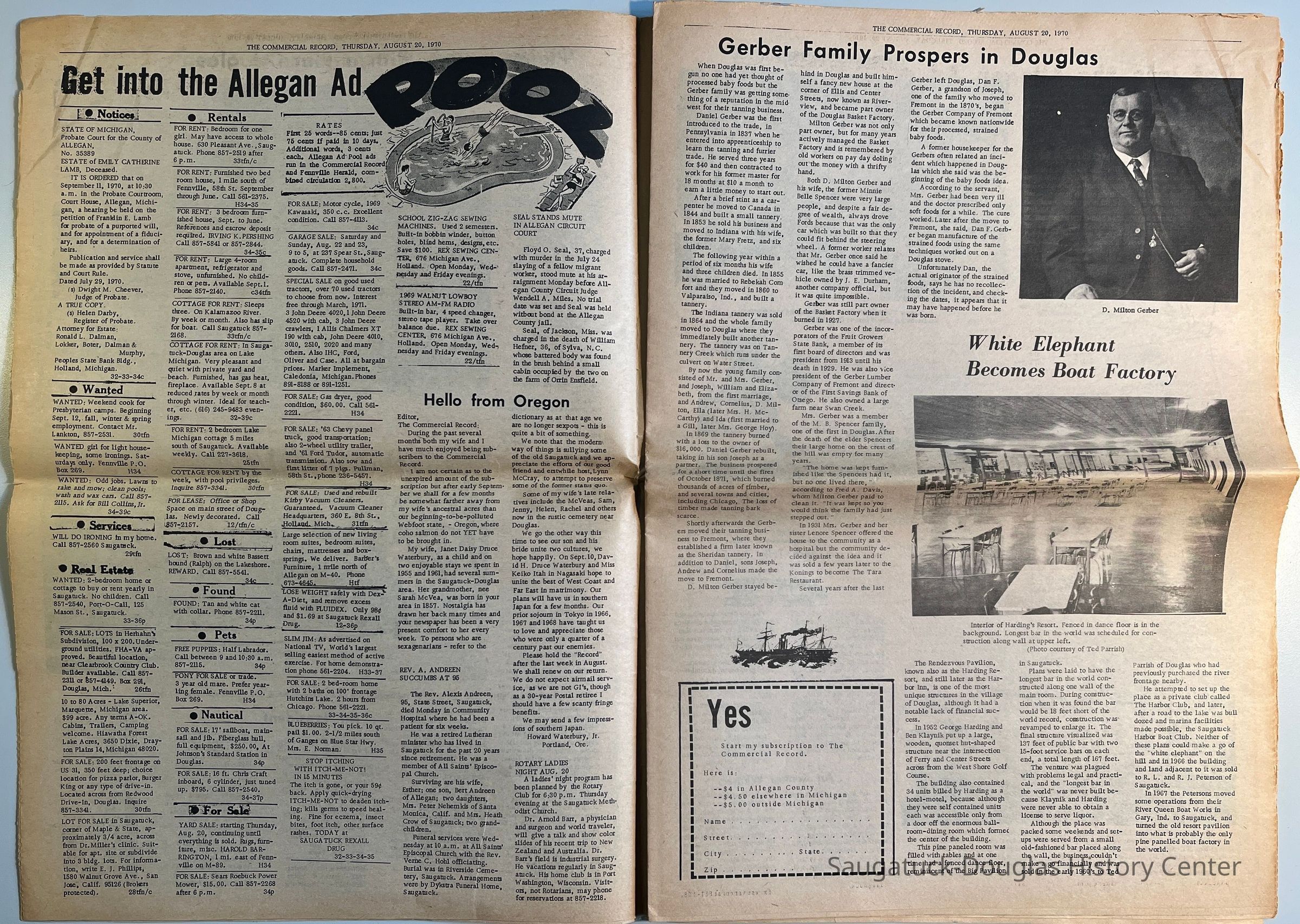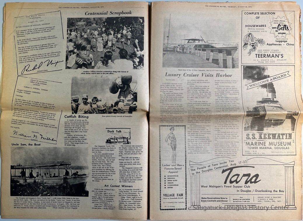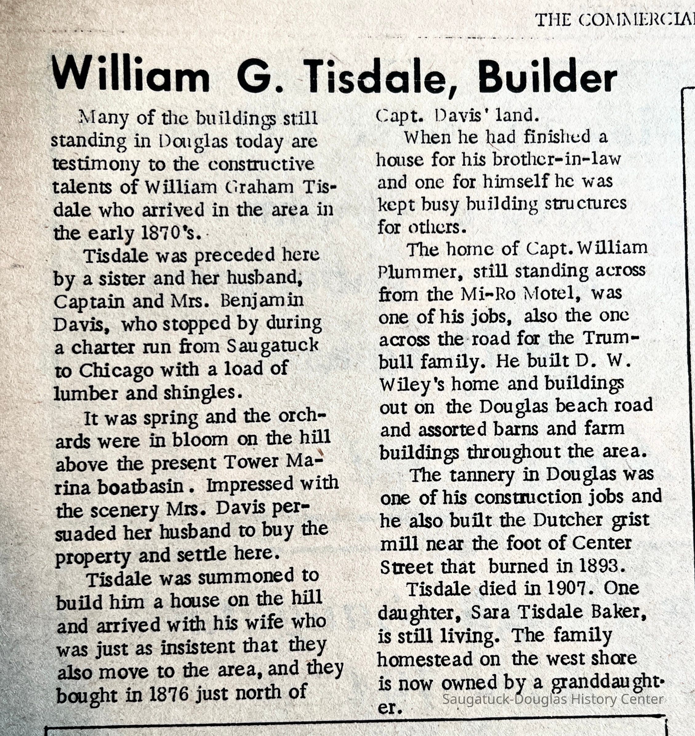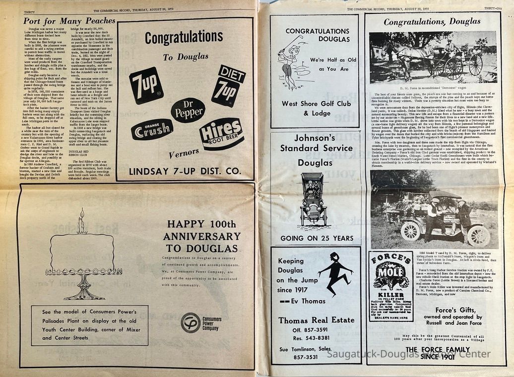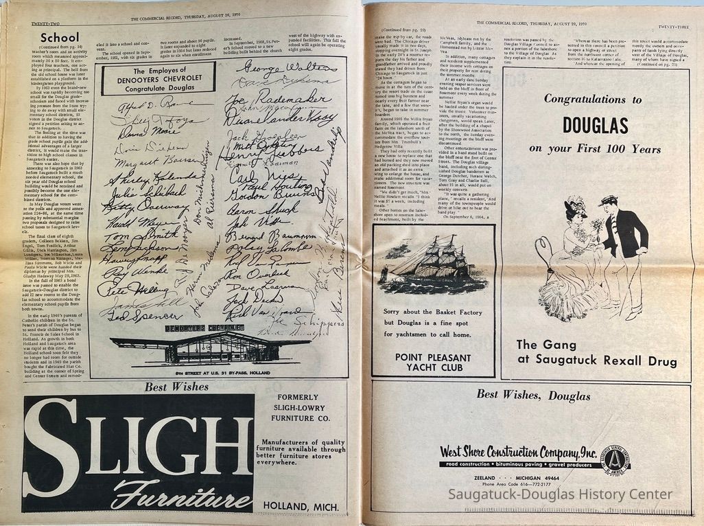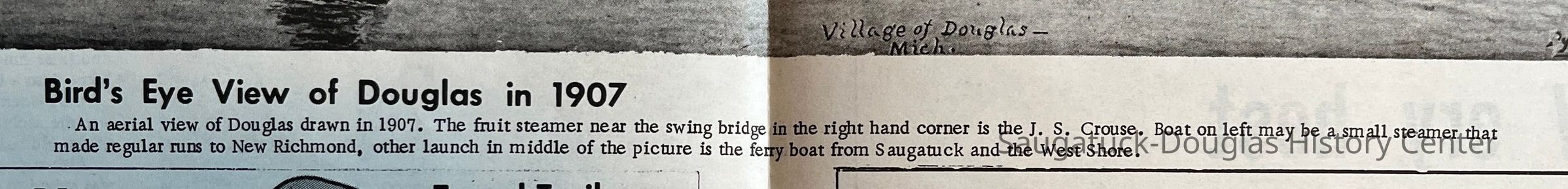 Gravel Pit/Indian Cut/Purdy's Landing/Mack's LandingDouglas Marina Park/Point Pleasant Yacht Club c1967Huntington/First Michigan Bank and Trust Co.Bridge, Swing and Causeway 1902/Drawbridge 1870 or 1868Charles McVea (ship) 1888-1928Wade, Frank W. 1853-1947Putnam, Dyer Conger Sr. 1843-1894Greyhound Bus Stop, DouglasTisdale, William Graham Sr. 1838-1907Dutcher Lodge #193, Free and Accepted MasonsFarnsworth, William "Bill" Eugene 1893-1937Basket Factories in Douglas circa 1851-1927Kirby House/Community Hospital before 1960133 Main/Design Shop/Whipple Sister's HouseForce, Russell H. 1902-1975Force, Jean (Disher) 1915-2001Bale, Vera J. 1933-2013Van Syckel, Margaret AnnShepherd's Hardware/Ekdahl, Clarence & DonaldGerber, Daniel Milton 1862-1929River Queen Boatworks/81. N Ferry/Harbor Club/Harding Hotel, 2ndHuntington/TFC/Chemical/Citizens Trust and Savings BankBob Bell Bozo 1922-1997