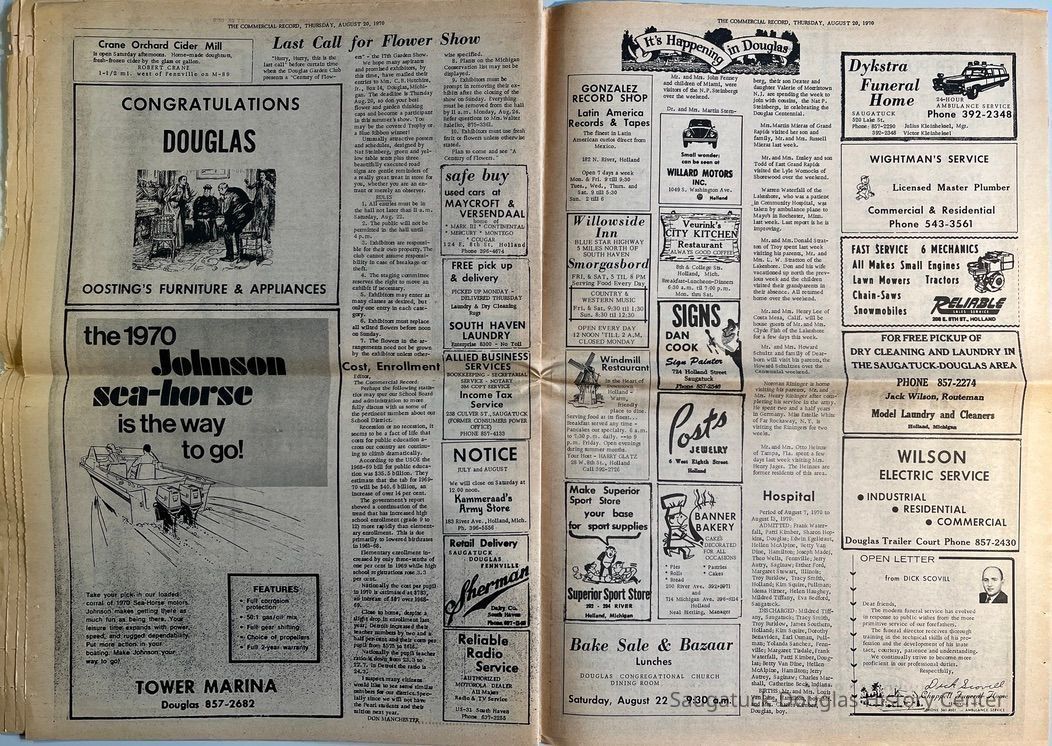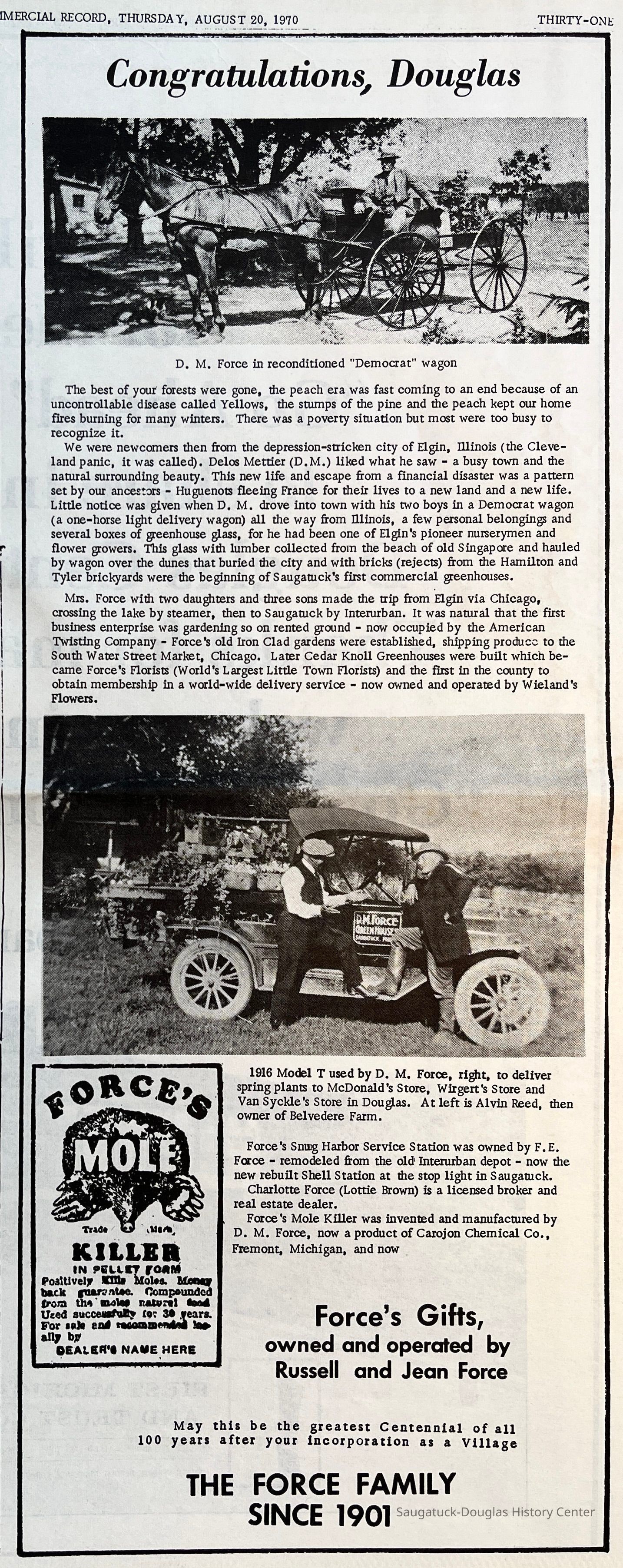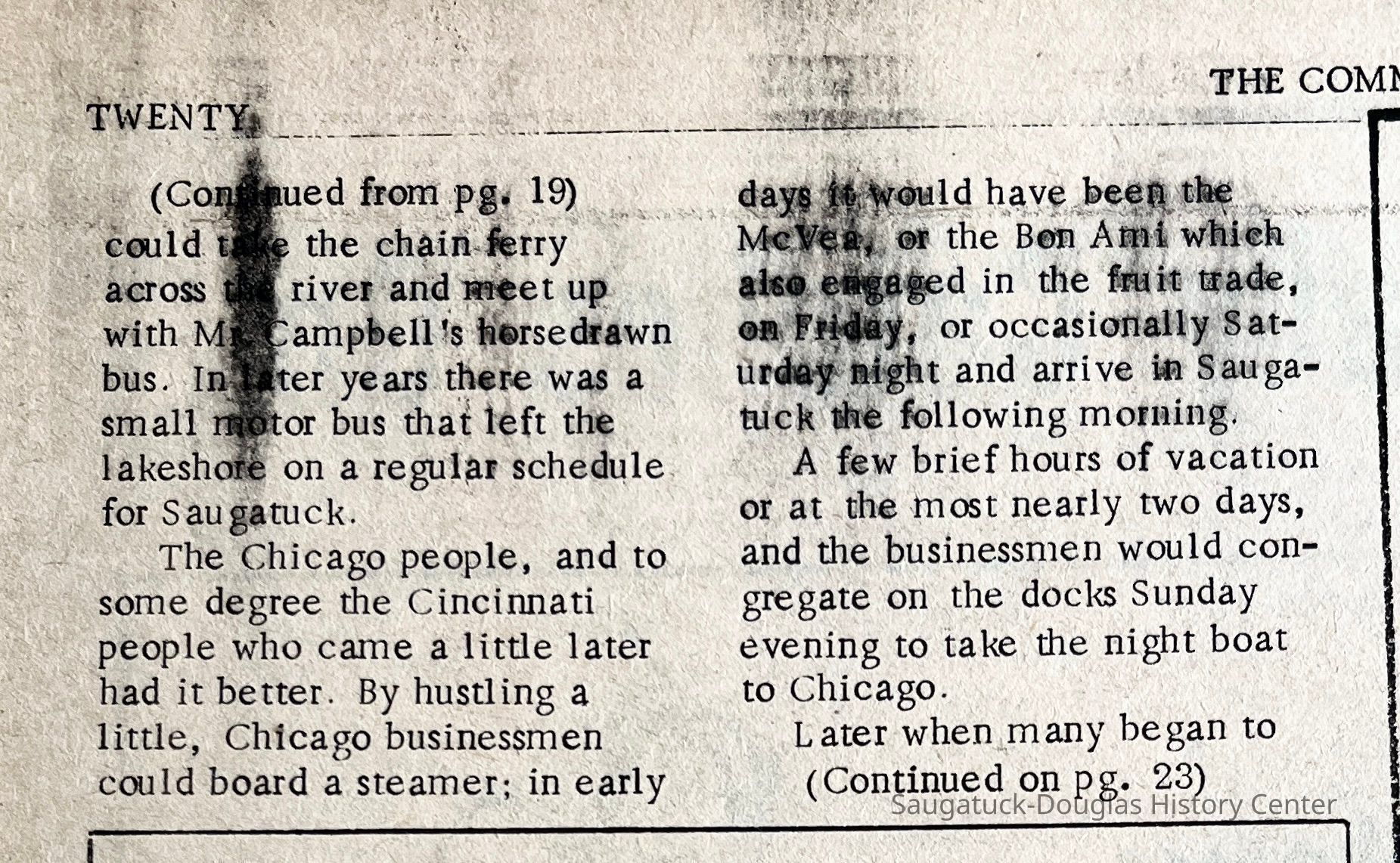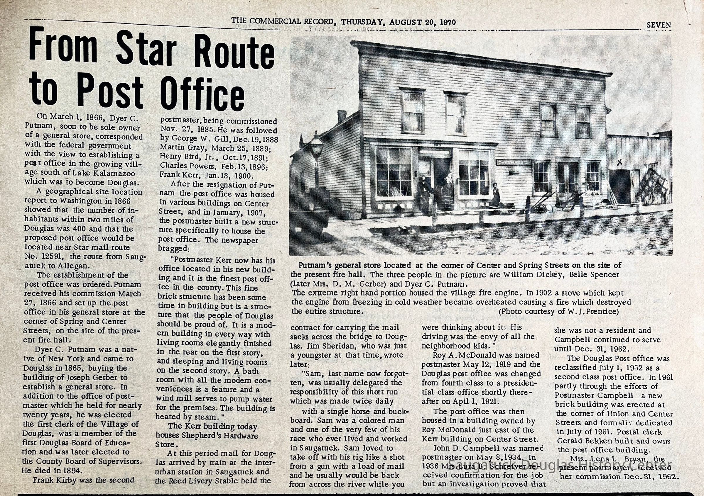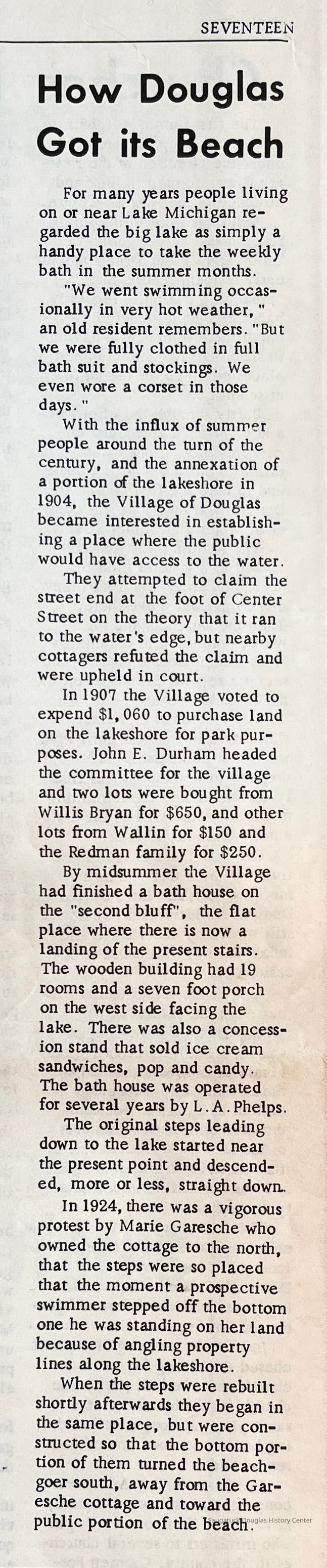 Gravel Pit/Indian Cut/Purdy's Landing/Mack's LandingDouglas Marina Park/Point Pleasant Yacht Club c1967Huntington/First Michigan Bank and Trust Co.Bridge, Swing and Causeway 1902/Drawbridge 1870 or 1868Charles McVea (ship) 1888-1928Wade, Frank W. 1853-1947Putnam, Dyer Conger Sr. 1843-1894Greyhound Bus Stop, DouglasTisdale, William Graham Sr. 1838-1907Dutcher Lodge #193, Free and Accepted MasonsFarnsworth, William "Bill" Eugene 1893-1937Basket Factories in Douglas circa 1851-1927Kirby House/Community Hospital before 1960133 Main/Design Shop/Whipple Sister's HouseForce, Russell H. 1902-1975Force, Jean (Disher) 1915-2001Bale, Vera J. 1933-2013Van Syckel, Margaret AnnShepherd's Hardware/Ekdahl, Clarence & DonaldGerber, Daniel Milton 1862-1929River Queen Boatworks/81. N Ferry/Harbor Club/Harding Hotel, 2ndHuntington/TFC/Chemical/Citizens Trust and Savings BankBob Bell Bozo 1922-1997