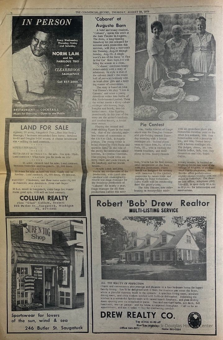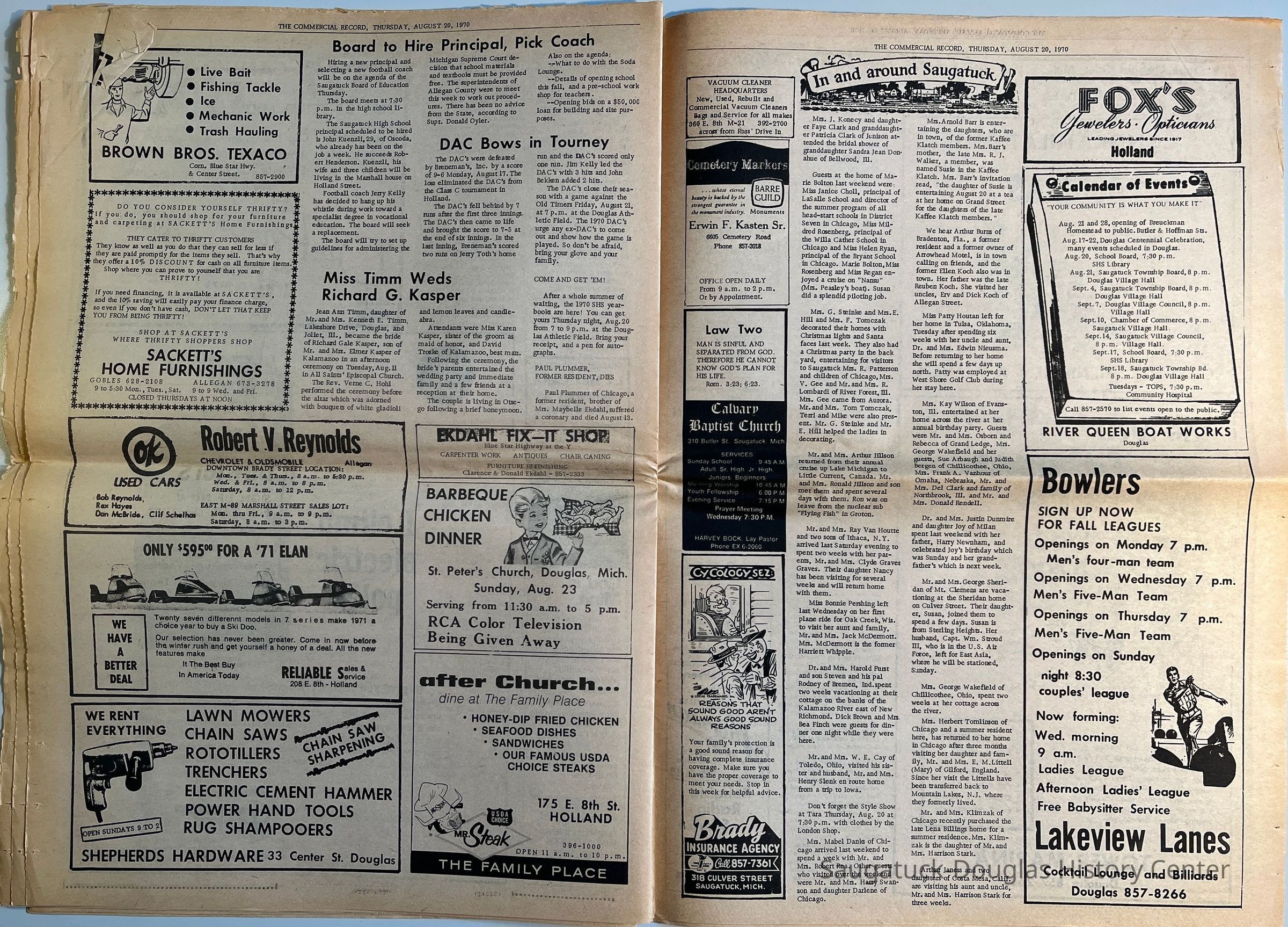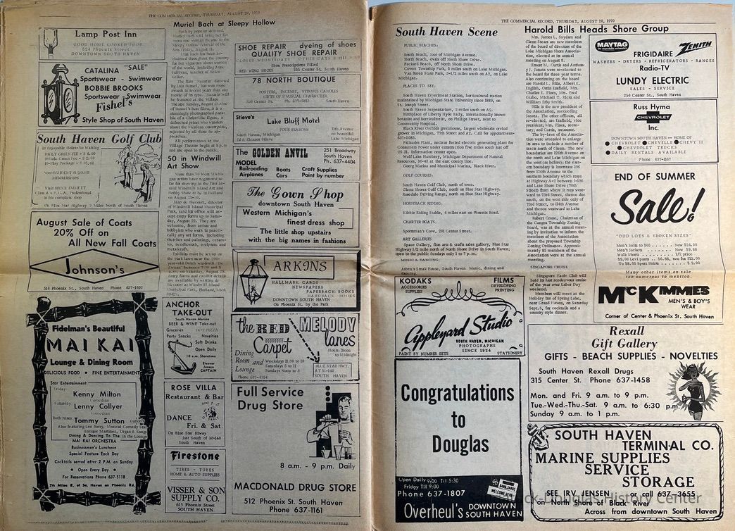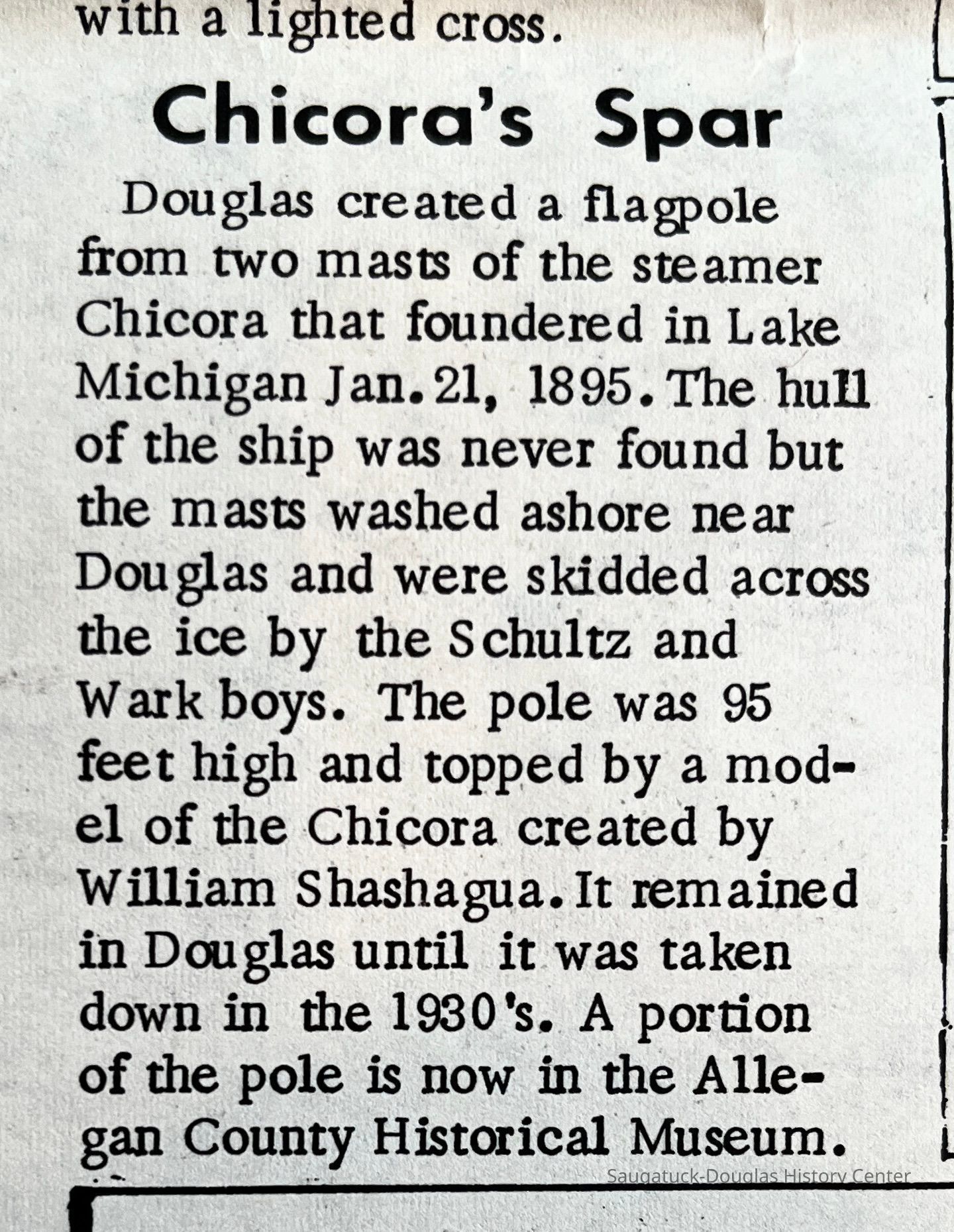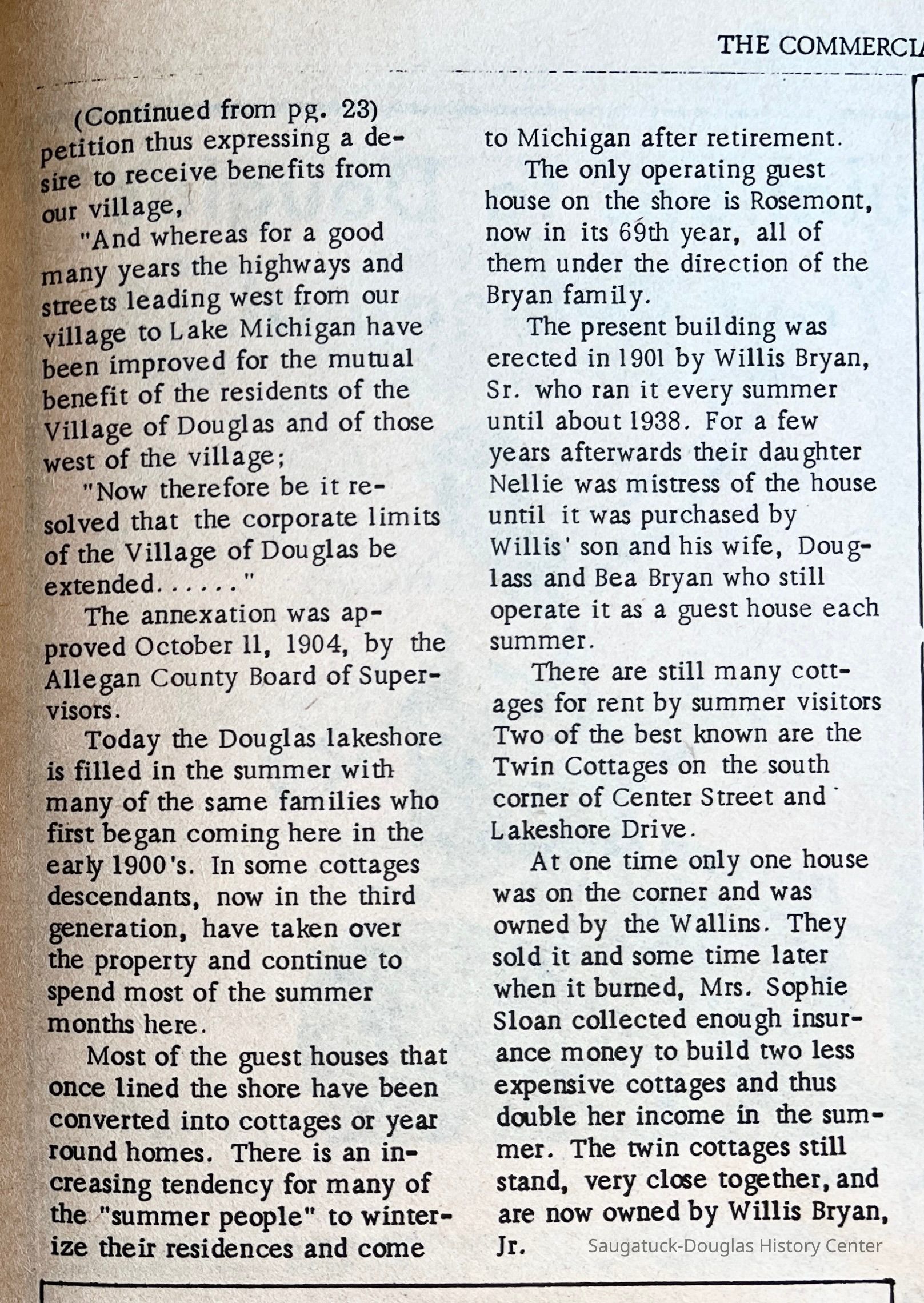 Gravel Pit/Indian Cut/Purdy's Landing/Mack's LandingDouglas Marina Park/Point Pleasant Yacht Club c1967Huntington/First Michigan Bank and Trust Co.Bridge, Swing and Causeway 1902/Drawbridge 1870 or 1868Charles McVea (ship) 1888-1928Wade, Frank W. 1853-1947Putnam, Dyer Conger Sr. 1843-1894Greyhound Bus Stop, DouglasTisdale, William Graham Sr. 1838-1907Dutcher Lodge #193, Free and Accepted MasonsFarnsworth, William "Bill" Eugene 1893-1937Basket Factories in Douglas circa 1851-1927Kirby House/Community Hospital before 1960133 Main/Design Shop/Whipple Sister's HouseForce, Russell H. 1902-1975Force, Jean (Disher) 1915-2001Bale, Vera J. 1933-2013Van Syckel, Margaret AnnShepherd's Hardware/Ekdahl, Clarence & DonaldGerber, Daniel Milton 1862-1929River Queen Boatworks/81. N Ferry/Harbor Club/Harding Hotel, 2ndHuntington/TFC/Chemical/Citizens Trust and Savings BankBob Bell Bozo 1922-1997
