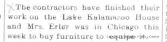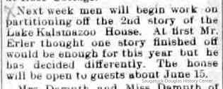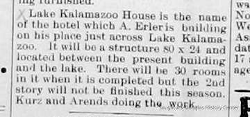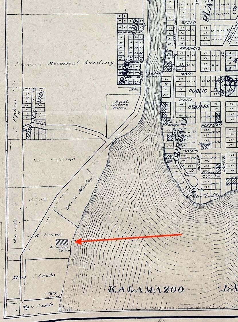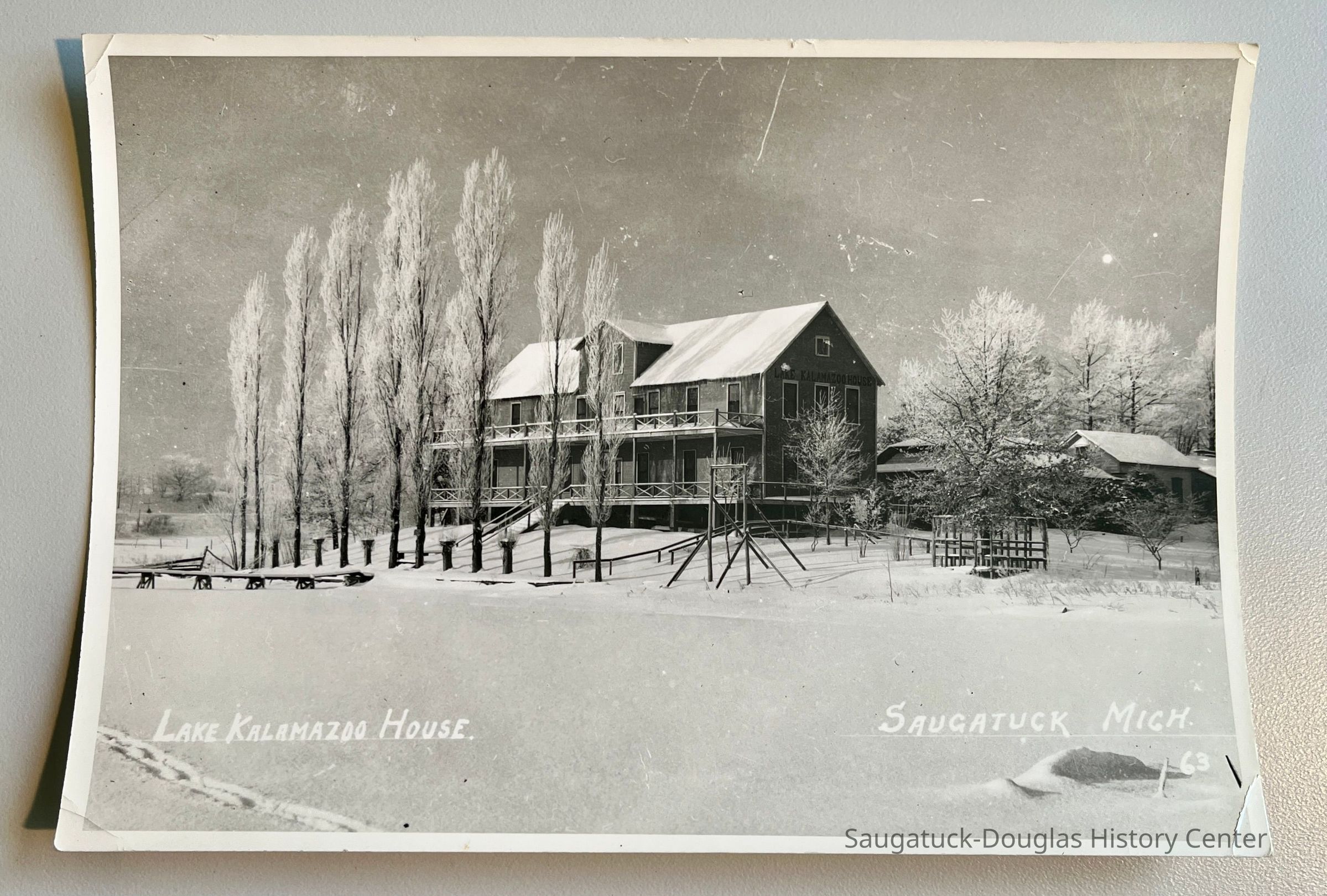 Winter scene of a large guesthouse, at least three stories tall, with balconies along the bottom two stories. The building is separated from a snow-covered plain, likely Lake Kalamazoo, by a row of tall, slender trees. Likely a Simonson photo, the image has "Lake Kalamazoo House" and "Saugatuck, Mich 63" inscribed on the negative.