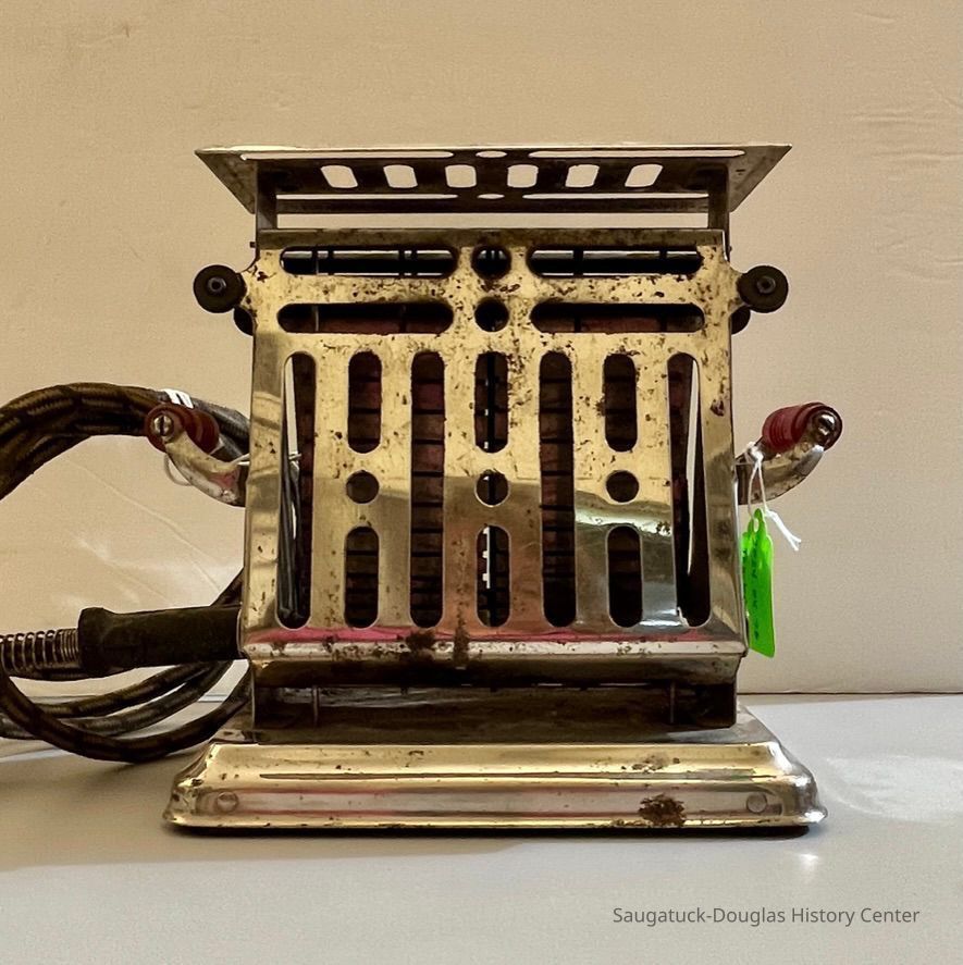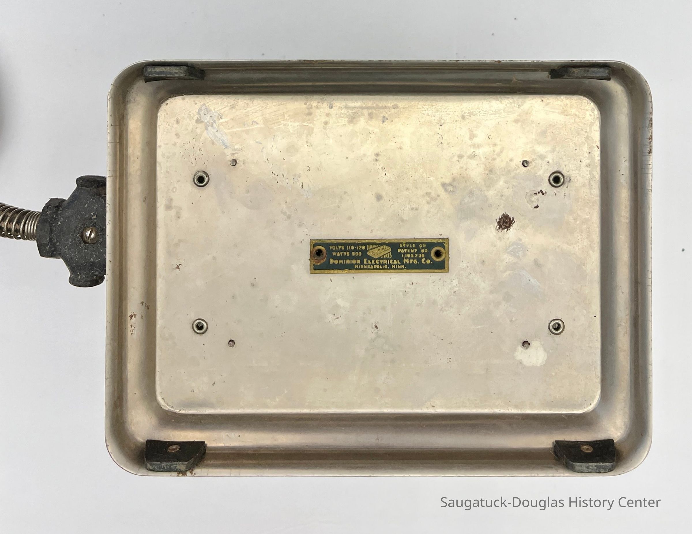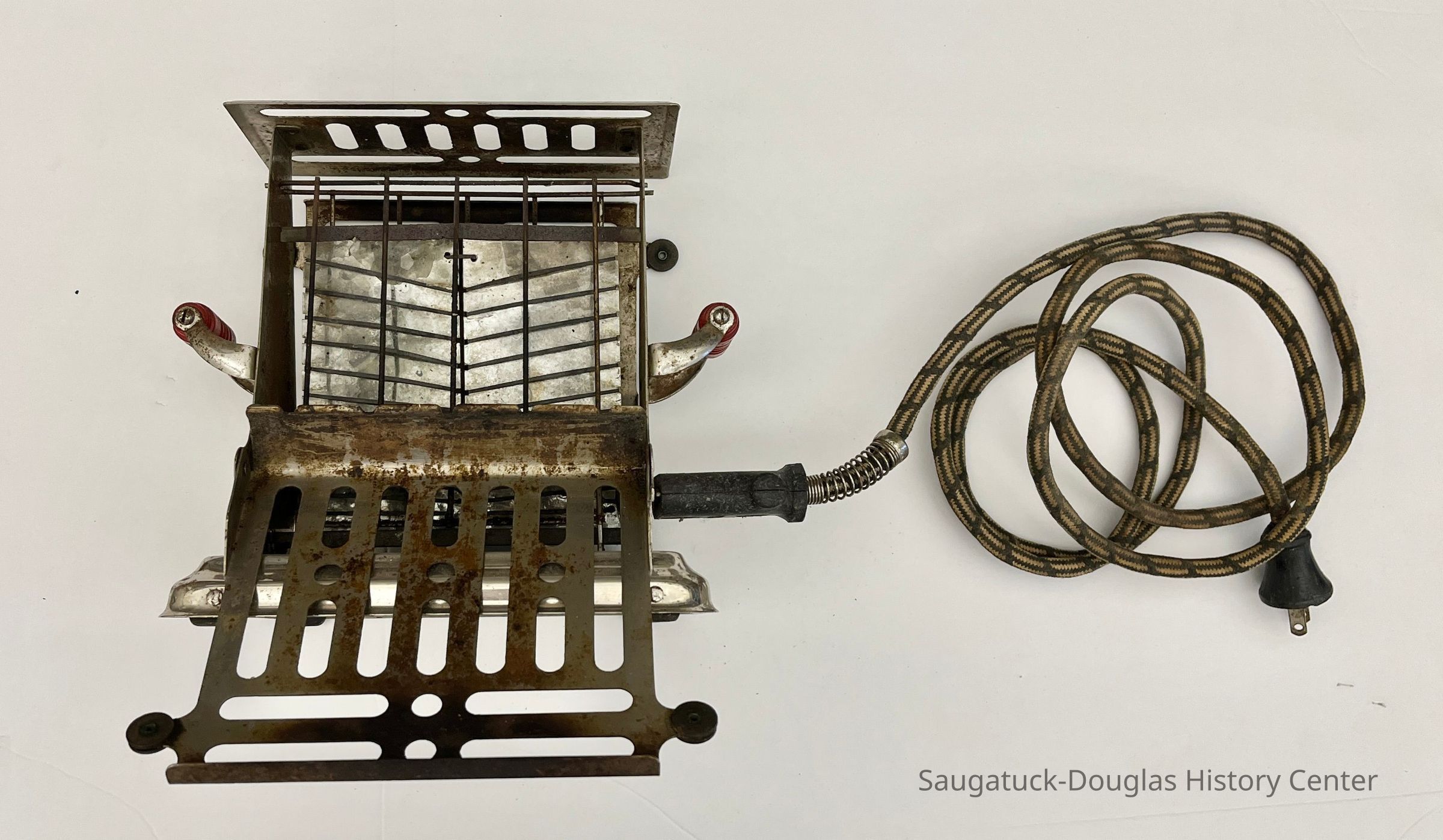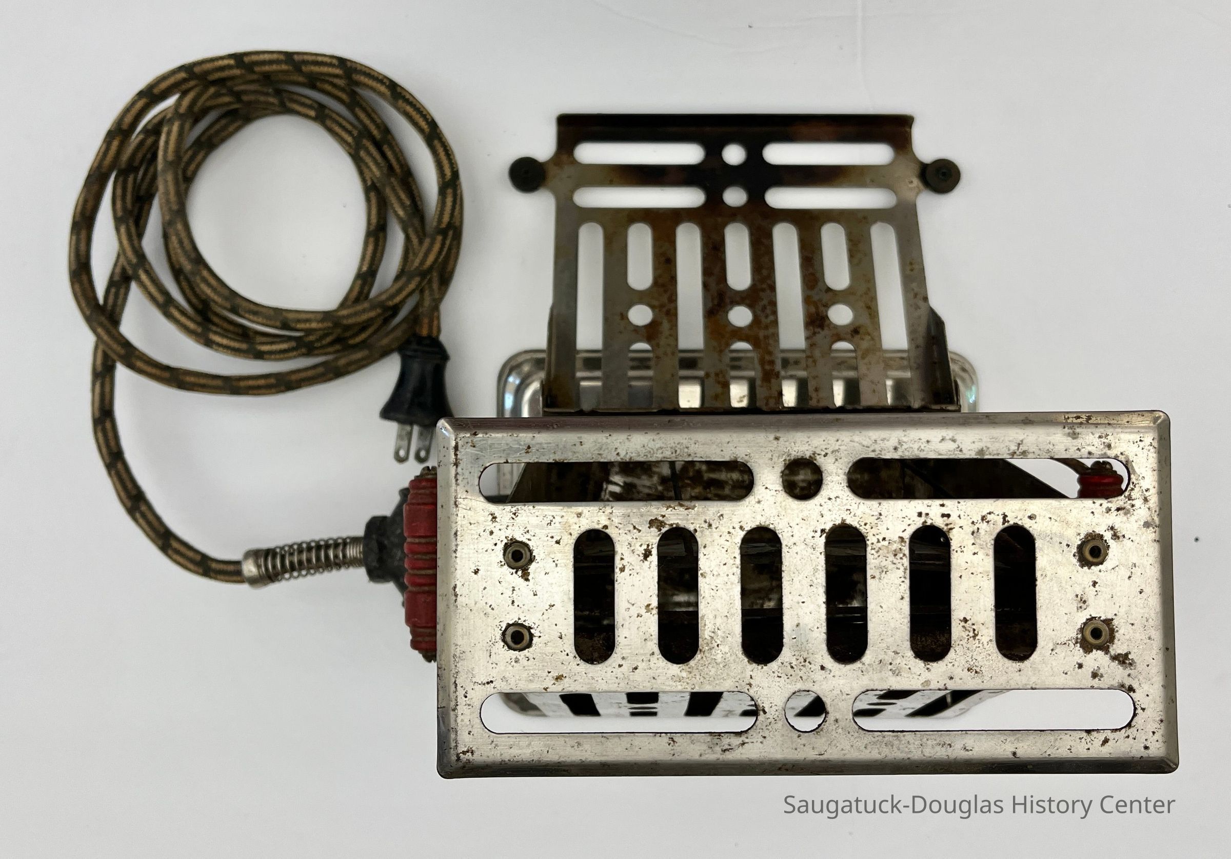 Table top electrical toaster. The chromed, trapezoid-shaped unit has two fold-down doors that each held a slice of bread near a metal plate wrapped with an electrical resistance element. The toaster has two red-painted wooden handles on the sides and an 6-foot cord with a braided insulation cover. A plate on the bottom identifies the manufacturer as Dominion Electrical Manufacturing Company of Minneapolis, Minnesota.